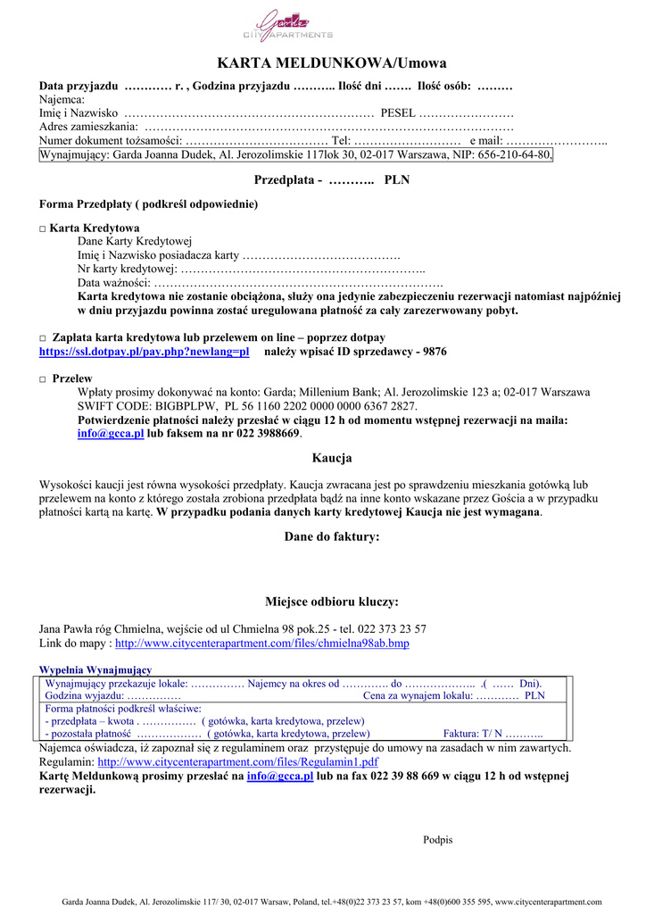 KARTA MELDUNKOWA/Umowa Data przyjazdu ………… r. , Godzina przyjazdu ……….. Ilość dni ……. Ilość osób: ……… Najemca: Imię i Nazwisko ……………………………………………………… PESEL …………………… Adres zamieszkania: ………………………………………………………………………………… Numer dokument toŜsamości: ……………………………… Tel: ……………………… e mail: …………………….. Wynajmujący: Garda Joanna Dudek, Al. Jerozolimskie 117lok 30, 02-017 Warszawa, NIP: 656-210-64-80, Przedpłata - ……….. PLN Forma Przedpłaty ( podkreśl odpowiednie) □ Karta Kredytowa Dane Karty Kredytowej Imię i Nazwisko posiadacza karty …………………………………. Nr karty kredytowej: …………………………………………………….. Data waŜności: ………………………………………………………………. Karta kredytowa nie zostanie obciąŜona, słuŜy ona jedynie zabezpieczeniu rezerwacji natomiast najpóźniej w dniu przyjazdu powinna zostać uregulowana płatność za cały zarezerwowany pobyt. □ Zapłata karta kredytowa lub przelewem on line – poprzez dotpay https://ssl.dotpay.pl/pay.php?newlang=pl naleŜy wpisać ID sprzedawcy - 9876 □ Przelew Wpłaty prosimy dokonywać na konto: Garda; Millenium Bank; Al. Jerozolimskie 123 a; 02-017 Warszawa SWIFT CODE: BIGBPLPW, PL 56 1160 2202 0000 0000 6367 2827. Potwierdzenie płatności naleŜy przesłać w ciągu 12 h od momentu wstępnej rezerwacji na maila: [email protected] lub faksem na nr 022 3988669. Kaucja Wysokości kaucji jest równa wysokości przedpłaty. Kaucja zwracana jest po sprawdzeniu mieszkania gotówką lub przelewem na konto z którego została zrobiona przedpłata bądź na inne konto wskazane przez Gościa a w przypadku płatności kartą na kartę. W przypadku podania danych karty kredytowej Kaucja nie jest wymagana. Dane do faktury: Miejsce odbioru kluczy: Jana Pawła róg Chmielna, wejście od ul Chmielna 98 pok.25 - tel. 022 373 23 57 Link do mapy : http://www.citycenterapartment.com/files/chmielna98ab.bmp Wypełnia Wynajmujący Wynajmujący przekazuje lokale: …………… Najemcy na okres od …………. do ……………….. .( …… Dni). Godzina wyjazdu: …………… Cena za wynajem lokalu: ………… PLN Forma płatności podkreśl właściwe: - przedpłata – kwota . …………… ( gotówka, karta kredytowa, przelew) - pozostała płatność ……………… ( gotówka, karta kredytowa, przelew) Faktura: T/ N ……….. Najemca oświadcza, iŜ zapoznał się z regulaminem oraz przystępuje do umowy na zasadach w nim zawartych. Regulamin: http://www.citycenterapartment.com/files/Regulamin1.pdf Kartę Meldunkową prosimy przesłać na [email protected] lub na fax 022 39 88 669 w ciągu 12 h od wstępnej rezerwacji. Podpis Garda Joanna Dudek, Al. Jerozolimskie 117/ 30, 02-017 Warsaw, Poland, tel.+48(0)22 373 23 57, kom +48(0)600 355 595, www.citycenterapartment.com