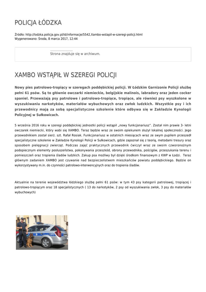 POLICJA ŁÓDZKA Źródło: http://lodzka.policja.gov.pl/ld/informacje/5542,Xambo-wstapil-w-szeregi-policji.html Wygenerowano: Środa, 8 marca 2017, 12:44 Strona znajduje się w archiwum. XAMBO WSTĄPIŁ W SZEREGI POLICJI Nowy pies patrolowo-tropiący w szeregach poddębickiej policji. W Łódzkim Garnizonie Policji służbę pełni 61 psów. Są to głównie owczarki niemieckie, belgijskie malinois, labradory oraz jeden cocker spaniel. Przeważają psy patrolowe i patrolowo-tropiące, tropiące, ale również psy wyszkolone w wyszukiwaniu narkotyków, materiałów wybuchowych oraz zwłok ludzkich. Wszystkie psy i ich przewodnicy mają za sobą specjalistyczne szkolenie które odbywa się w Zakładzie Kynologii Policyjnej w Sułkowicach. 5 września 2016 roku w szeregi poddębickiej jednostki policji wstąpił „nowy funkcjonariusz”. Został nim prawie 3- letni owczarek niemiecki, który wabi się XAMBO. Teraz będzie wraz ze swoim opiekunem służył lokalnej społeczności. Jego przewodnikiem został sierż. szt. Rafał Rosiak. Funkcjonariusz w ostatnich miesiącach wraz ze swym pupilem przeszedł specjalistyczne szkolenie w Zakładzie Kynologii Policji w Sułkowicach, gdzie zapoznał się z teorią, metodami tresury oraz sposobem pielęgnacji zwierząt. Podczas zajęć praktycznych przewodnik ćwiczył wraz ze swoim czworonożnym podopiecznym elementy posłuszeństwa, pokonywania przeszkód, obrony przewodnika, pościgów, przeszukania terenu i pomieszczeń oraz tropienia śladów ludzkich. Zakup psa możliwy był dzięki środkom finansowym z KWP w Łodzi. Teraz głównym zadaniem XAMBO jest czuwanie nad bezpieczeństwem mieszkańców powiatu poddębickiego. Będzie on wykorzystywany m.in. do czynności patrolowo-interwencyjnych oraz do tropienia śladów. Aktualnie na terenie województwa łódzkiego służbę pełni 61 psów: w tym 43 psy kategorii patrolowej, tropiącej i patrolowo-tropiącym oraz 18 specjalistycznych ( 13 do narkotyków, 2 psy od wyszukiwania zwłok, 3 psy do materiałów wybuchowych) Ocena: 5/5 (1) Tweetnij psy policyjne