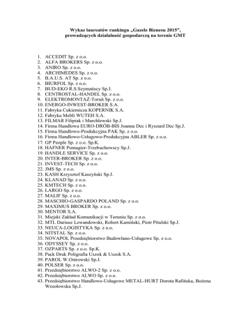 Wykaz laureatów rankingu „Gazele Biznesu 2015”, prowadzących działalność gospodarczą na terenie GMT 1. ACCEDIT Sp. z o.o. 2. ALFA BROKERS Sp. z o.o. 3. ANIRO Sp. z o.o. 4. ARCHIMEDES Sp. z o.o. 5. B.A.U.S. AT Sp. z o.o. 6. BIURFOL Sp. z o.o. 7. BUD-EKO R.S.Szymańscy Sp.J. 8. CENTROSTAL-HANDEL Sp. z o.o. 9. ELEKTROMONTAŻ-Toruń Sp. z o.o. 10. ENERGO-INWEST-BROKER S.A. 11. Fabryka Cukiernicza KOPERNIK S.A. 12. Fabryka Mebli WUTEH S.A. 13. FILMAR Filipiak i Marchlewski Sp.J. 14. Firma Handlowa EURO-DRÓB-BIS Joanna Dec i Ryszard Dec Sp.J. 15. Firma Handlowo-Produkcyjna PAK Sp. z o.o. 16. Firma Handlowo-Usługowo-Produkcyjna ABLER Sp. z o.o. 17. GP People Sp. z o.o. Sp.K. 18. HAFNER Pomagier-Trzebuchowscy Sp.J. 19. HANDLE SERVICE Sp. z o.o. 20. INTER-BROKER Sp. z o.o. 21. INVEST-TECH Sp. z o.o. 22. JMS Sp. z o.o. 23. KASH Krzysztof Kaszyński Sp.J. 24. KLANAD Sp. z o.o. 25. KMTECH Sp. z o.o. 26. LARGO Sp. z o.o. 27. MALIF Sp. z o.o. 28. MASCHIO-GASPARDO POLAND Sp. z o.o. 29. MAXIMUS BROKER Sp. z o.o. 30. MENTOR S.A. 31. Miejski Zakład Komunikacji w Toruniu Sp. z o.o. 32. MTL Dariusz Lewandowski, Robert Kamiński, Piotr Pitulski Sp.J. 33. NEUCA-LOGISTYKA Sp. z o.o. 34. NITSTAL Sp. z o.o. 35. NOVAPOL Przedsiębiorstwo Budowlano-Usługowe Sp. z o.o. 36. ODYSSEY Sp. z o.o. 37. OZPARTS Sp. z o.o. Sp.K. 38. Pack Druk Poligrafia Uszok & Uszok S.A. 39. PAROL W.Ostrowski Sp.J. 40. POLSER Sp. z o.o. 41. Przedsiębiorstwo ALWO-2 Sp. z o.o. 42. Przedsiębiorstwo ALWO Sp. z o.o. 43. Przedsiębiorstwo Handlowo-Usługowe METAL-HURT Dorota Rafińska, Bożena Wesołowska Sp.J. 44. Przedsiębiorstwo Instalacyjne INSTAL TORUŃ Sp.J. Zbigniew Balcer, Krzysztof Żelazny 45. Przedsiębiorstwo Produkcyjno-Handlowe im. Jędrzeja Śniadeckiego Sp. z o.o. 46. Przedsiębiorstwo Produkcyjno-Usługowo-Handlowe FART-PRODUKT Wiesław Lewicki 47. Serwis Medyczno-Projektowy Sp. z o.o. 48. ŚWISTOWSKI S.A. 49. TECHMET EKOLOGIA Sp. z o.o. 50. TORMAR Sp. z o.o. 51. TORMEC REDUKTOR P.Mariański, D.Tomicki, Z.Wiśniewski Sp.J. 52. TORMET Sp. z o.o. Sp.K. 53. TORUŃSKIE WODOCIĄGI Sp. z o.o. 54. TRADE AGRO Sp. z o.o. 55. TROPS COATINGS Sp. z o.o. 56. TROPS S.A. 57. VICIM POLAND Sp. z o.o. 58. Zakłady Laminatów Poliestrowych TROKOTEX Sp. z o.o. Wykaz sporządzono na podstawie informacji zawartych na stronie gazele.pb.pl