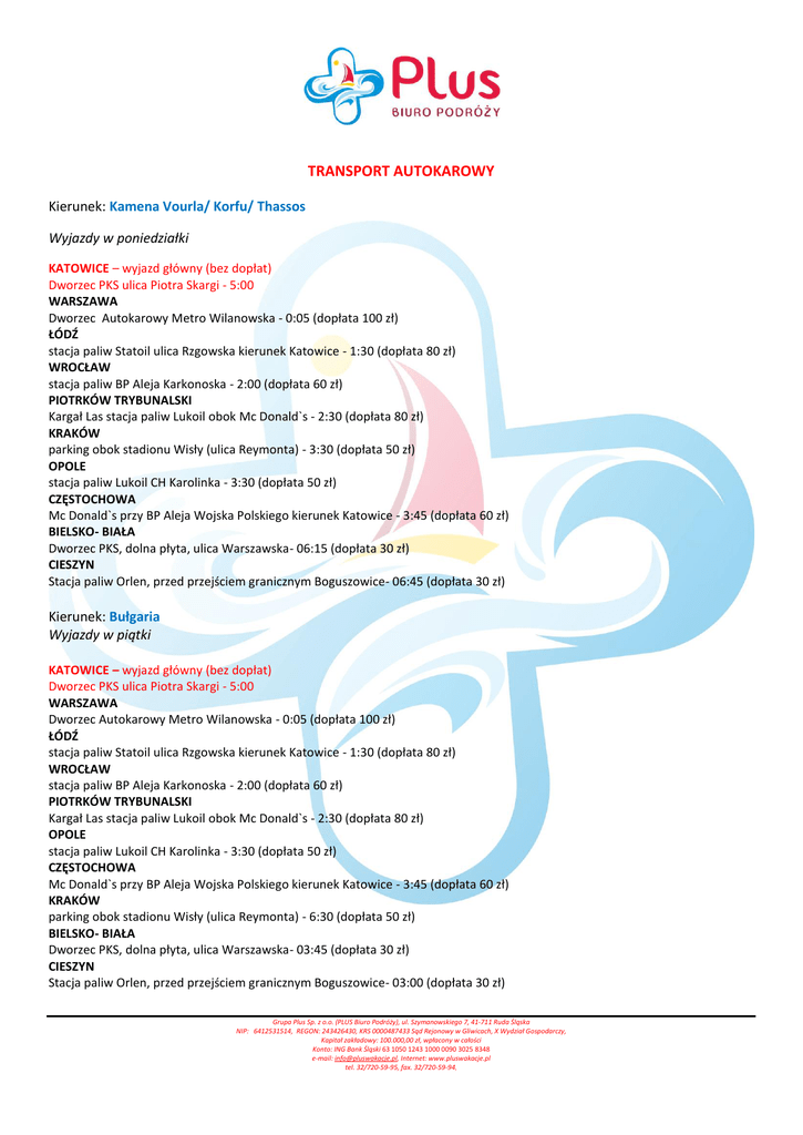 TRANSPORT AUTOKAROWY Kierunek: Kamena Vourla/ Korfu/ Thassos Wyjazdy w poniedziałki KATOWICE – wyjazd główny (bez dopłat) Dworzec PKS ulica Piotra Skargi - 5:00 WARSZAWA Dworzec Autokarowy Metro Wilanowska - 0:05 (dopłata 100 zł) ŁÓDŹ stacja paliw Statoil ulica Rzgowska kierunek Katowice - 1:30 (dopłata 80 zł) WROCŁAW stacja paliw BP Aleja Karkonoska - 2:00 (dopłata 60 zł) PIOTRKÓW TRYBUNALSKI Kargał Las stacja paliw Lukoil obok Mc Donald`s - 2:30 (dopłata 80 zł) KRAKÓW parking obok stadionu Wisły (ulica Reymonta) - 3:30 (dopłata 50 zł) OPOLE stacja paliw Lukoil CH Karolinka - 3:30 (dopłata 50 zł) CZĘSTOCHOWA Mc Donald`s przy BP Aleja Wojska Polskiego kierunek Katowice - 3:45 (dopłata 60 zł) BIELSKO- BIAŁA Dworzec PKS, dolna płyta, ulica Warszawska- 06:15 (dopłata 30 zł) CIESZYN Stacja paliw Orlen, przed przejściem granicznym Boguszowice- 06:45 (dopłata 30 zł) Kierunek: Bułgaria Wyjazdy w piątki KATOWICE – wyjazd główny (bez dopłat) Dworzec PKS ulica Piotra Skargi - 5:00 WARSZAWA Dworzec Autokarowy Metro Wilanowska - 0:05 (dopłata 100 zł) ŁÓDŹ stacja paliw Statoil ulica Rzgowska kierunek Katowice - 1:30 (dopłata 80 zł) WROCŁAW stacja paliw BP Aleja Karkonoska - 2:00 (dopłata 60 zł) PIOTRKÓW TRYBUNALSKI Kargał Las stacja paliw Lukoil obok Mc Donald`s - 2:30 (dopłata 80 zł) OPOLE stacja paliw Lukoil CH Karolinka - 3:30 (dopłata 50 zł) CZĘSTOCHOWA Mc Donald`s przy BP Aleja Wojska Polskiego kierunek Katowice - 3:45 (dopłata 60 zł) KRAKÓW parking obok stadionu Wisły (ulica Reymonta) - 6:30 (dopłata 50 zł) BIELSKO- BIAŁA Dworzec PKS, dolna płyta, ulica Warszawska- 03:45 (dopłata 30 zł) CIESZYN Stacja paliw Orlen, przed przejściem granicznym Boguszowice- 03:00 (dopłata 30 zł) Grupa Plus Sp. z o.o. (PLUS Biuro Podróży), ul. Szymanowskiego 7, 41-711 Ruda Śląska NIP: 6412531514, REGON: 243426430, KRS 0000487433 Sąd Rejonowy w Gliwicach, X Wydział Gospodarczy, Kapitał zakładowy: 100.000,00 zł, wpłacony w całości Konto: ING Bank Śląski 63 1050 1243 1000 0090 3025 8348 e-mail: [email protected], Internet: www.pluswakacje.pl tel. 32/720-59-95, fax. 32/720-59-94,