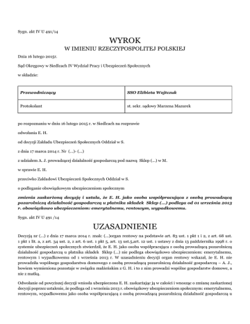 Sygn. akt IV U 491/14 WYROK W IMIENIU RZECZYPOSPOLITEJ POLSKIEJ Dnia 16 lutego 2015r. Sąd Okręgowy w Siedlcach IV Wydział Pracy i Ubezpieczeń Społecznych w składzie: Przewodniczący SSO Elżbieta Wojtczuk Protokolant st. sekr. sądowy Marzena Mazurek po rozpoznaniu w dniu 16 lutego 2015 r. w Siedlcach na rozprawie odwołania E. H. od decyzji Zakładu Ubezpieczeń Społecznych Oddział w S. z dnia 17 marca 2014 r. Nr (...)- (...) z udziałem A. J. prowadzącej działalność gospodarczą pod nazwą Sklep (...) w M. w sprawie E. H. przeciwko Zakładowi Ubezpieczeń Społecznych Oddział w S. o podleganie obowiązkowym ubezpieczeniom społecznym zmienia zaskarżoną decyzję i ustala, że E. H. jako osoba współpracująca z osobą prowadzącą pozarolniczą działalność gospodarczą u płatnika składek Sklep (...) podlega od 01 września 2013 r. obowiązkowo ubezpieczeniom: emerytalnemu, rentowym, wypadkowemu. Sygn. akt IV U 491 /14 UZASADNIENIE Decyzją nr (...) z dnia 17 marca 2014 r. znak: (...)organ rentowy na podstawie art. 83 ust. 1 pkt 1 i 2, z art. 68 ust. 1 pkt 1 lit. a, z art. 34 ust. 2, z art. 6 ust. 1 pkt 5, art. 13 ust.5,art. 12 ust. 1 ustawy z dnia 13 października 1998 r. o systemie ubezpieczeń społecznych stwierdził, że E. H. jako osoba współpracująca z osobą prowadzącą pozarolniczą działalność gospodarczą u płatnika składek Sklep (...) nie podlega obowiązkowo ubezpieczeniom: emerytalnemu, rentowym i wypadkowemu od 1 września 2013 r. W uzasadnieniu decyzji organ rentowy wskazał, że E. H. nie prowadziła wspólnego gospodarstwa domowego z osobą prowadzącą pozarolniczą działalność gospodarczą – A. J., bowiem wymieniona pozostaje w związku małżeńskim z G. H. i to z nim prowadzi wspólne gospodarstw domowe, a nie z matką. Odwołanie od powyższej decyzji wniosła ubezpieczona E. H. zaskarżając ją w całości i wnosząc o zmianę zaskarżonej decyzji poprzez ustalenie, że podlega od 1 września 2013 r. obowiązkowy ubezpieczeniom społecznym: emerytalnemu, rentowym, wypadkowemu jako osoba współpracującą z osobą prowadzącą pozarolniczą działalność gospodarczą u płatnika składek – Sklep (...). W uzasadnieniu odwołania ubezpieczona wskazała, że zawarcie przez nią związku małżeńskiego nie spowodowało prowadzenia przez nią odrębnego gospodarstwa domowego z mężem, a jedynie to, że jej mąż G. H. dołączył do prowadzonego wspólnie przez nią i jej rodziców gospodarstwa domowego. Ubezpieczona wskazała, że o wspólnym prowadzeniu z rodzicami gospodarstwa domowego świadczy to, że wspólnie z nimi mieszkają, mają wspólną kuchnię i łazienkę, rachunki za prąd, gaz przychodzą na cały dom, za które płacą jej rodzice, a ona z mężem w miarę możliwości dokłada się do opłat. Ubezpieczona wskazała również, że w artykuły spożywcze i chemiczne zaopatruje całą rodzinę jej matka, jedzą wspólnie posiłki i korzystają ze wszystkiego. Ubezpieczona podniosła również, że razem z mężem pozostaje na utrzymaniu jej rodziców, bowiem sami nie byliby wstanie się utrzymać samodzielnie (odwołanie k.5-8). W odpowiedzi na odwołanie organ rentowy wniósł o jego oddalenie powołując się na przepisy prawa i uzasadnienie zawarte w zaskarżonej decyzji i wnosił o zasądzenie kosztów zastępstwa procesowego według norm przepisanych (odpowiedź organu rentowego na odwołanie k.2-3). Sąd ustalił, co następuje: A. J. od dnia 21 sierpnia 1991 r. prowadzi działalność gospodarczą polegającą na sprzedaży detalicznej prowadzonej w niewyspecjalizowanych sklepach z przewagą żywności, napojów i wyrobów tytoniowych. A. J. prowadzi sklep spożywczo – przemysłowy w swoim domu w M. przy ul (...) ( (...) o działalności gospodarczej – k.4 akt organu rentowego). Córka A. E. wyszła za mąż za G. H. w dniu 8 czerwca 2013 r. Po ślubie E. H. w dalszym ciągu mieszkała razem z rodzicami i była na ich utrzymaniu a jej mąż pomieszkiwał z nią. Do dyspozycji małżonków były dwa pokoje w domu rodziców ubezpieczonej, z tym, że one nie tworzyły samodzielnej części domu. Małżonkowie H. nie mieli odrębnego wejścia, odrębnej kuchni, ani łazienki, nie mieli również odrębnych podliczników na prąd, wodę gaz. Korespondencja do nich przychodziła na ten sam adres co do rodziców ubezpieczonej i była odbierana w sklepie, przez tych, którzy w danym momencie świadczyli pracę. E. i G. H. po ślubie byli we wspólnym gospodarstwie domowym z rodzicami ubezpieczonej. Gotowane były wspólne posiłki dla wszystkich domowników przez A. J., jej męża, albo ubezpieczoną, w artykuły spożywcze i czystości zaopatrywała dom A. J.. Małżonkowie H. nie dokładali się do żywności, środków czystości, nie partycypowali w kosztach utrzymania nieruchomości, na której mieszkali. E. i G. H. po ślubie nie tworzyli odrębnego gospodarstwa domowego, bowiem nie byli wstanie samodzielnie się utrzymać. G. H. prowadził działalność gospodarczą w lokalu użyczonym mu przez teściów w M. i jego działalności w 2013 r. przyniosła dochód w kwocie 1427,38 zł rocznie (PIT/B k. 16). Od listopada 2013 r. G. H. został zatrudniony na ¼ etatu jako sprzedawca –dostawca w sklepie przez teściową (umowa o pracę k. 45) i z tego tytułu uzyskiwał ¼ najniższego wynagrodzenia. Jak działalność gospodarcza G. H. w danym miesiącu przynosiła jakiś dochód to wówczas, dokładał teściom kwotę rzędu 100 zł na opłaty. Koszty wizyt lekarskim E. H. u ginekologa, koszty wyprawki dla dziecka: ubranka, wózek, łóżeczko itp. ponieśli rodzice ubezpieczonej, bo małżonkowie H. nie posiadali środków finansowych na powyższe. E. H. jak potrzebowała środków finansowych na zakupy, to zwracała się o pieniądze do matki, a nie do męża. G. H. po ślubie nie interesował się z czego i jak utrzyma swoją rodzinę. Między małżonkami był konflikt na tle finansowym, a następni