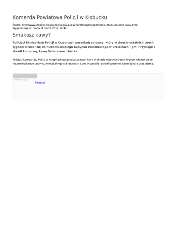 Komenda Powiatowa Policji w Kłobucku Źródło: http://www.klobuck.slaska.policja.gov.pl/k12/informacje/wiadomosci/37696,Smakosz-kawy.html Wygenerowano: Środa, 8 marca 2017, 12:44 Smakosz kawy? Policjaci Komisariatu Policji w Krzepicach poszukują sprawcy, który w okresie ostatnich trzech tygodni włamał się do niezamieszkałego budynku mieszkalnego w Brzezinach ( gm. Przystajń) i skradł konserwę, kawę Sahara oraz ciastka. Policjaci Komisariatu Policji w Krzepicach poszukują sprawcy, który w okresie ostatnich trzech tygodni włamał się do niezamieszkałego budynku mieszkalnego w Brzezinach ( gm. Przystajń) i skradł konserwę, kawę Sahara oraz ciastka. Ocena: 0/5 (0) Tweetnij