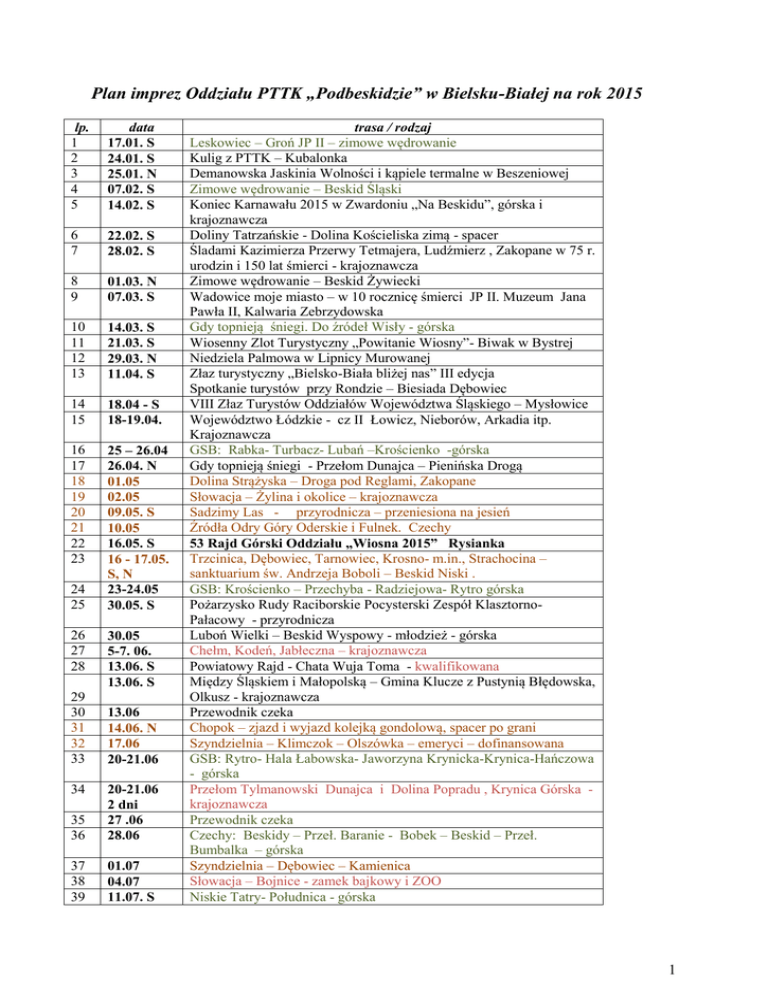 Plan imprez Oddziału PTTK „Podbeskidzie” w Bielsku-Białej na rok 2015 lp. 1 2 3 4 5 data 17.01. S 24.01. S 25.01. N 07.02. S 14.02. S 6 7 22.02. S 28.02. S 8 9 01.03. N 07.03. S 10 11 12 13 14.03. S 21.03. S 29.03. N 11.04. S 14 15 18.04 - S 18-19.04. 16 17 18 19 20 21 22 23 25 – 26.04 26.04. N 01.05 02.05 09.05. S 10.05 16.05. S 16 - 17.05. S, N 23-24.05 30.05. S 24 25 26 27 28 29 30 31 32 33 34 30.05 5-7. 06. 13.06. S 13.06. S 13.06 14.06. N 17.06 20-21.06 35 36 20-21.06 2 dni 27 .06 28.06 37 38 39 01.07 04.07 11.07. S trasa / rodzaj Leskowiec – Groń JP II – zimowe wędrowanie Kulig z PTTK – Kubalonka Demanowska Jaskinia Wolności i kąpiele termalne w Beszeniowej Zimowe wędrowanie – Beskid Śląski Koniec Karnawału 2015 w Zwardoniu „Na Beskidu”, górska i krajoznawcza Doliny Tatrzańskie - Dolina Kościeliska zimą - spacer Śladami Kazimierza Przerwy Tetmajera, Ludźmierz , Zakopane w 75 r. urodzin i 150 lat śmierci - krajoznawcza Zimowe wędrowanie – Beskid Żywiecki Wadowice moje miasto – w 10 rocznicę śmierci JP II. Muzeum Jana Pawła II, Kalwaria Zebrzydowska Gdy topnieją śniegi. Do źródeł Wisły - górska Wiosenny Zlot Turystyczny „Powitanie Wiosny”- Biwak w Bystrej Niedziela Palmowa w Lipnicy Murowanej Złaz turystyczny „Bielsko-Biała bliżej nas” III edycja Spotkanie turystów przy Rondzie – Biesiada Dębowiec VIII Złaz Turystów Oddziałów Województwa Śląskiego – Mysłowice Województwo Łódzkie - cz II Łowicz, Nieborów, Arkadia itp. Krajoznawcza GSB: Rabka- Turbacz- Lubań –Krościenko -górska Gdy topnieją śniegi - Przełom Dunajca – Pienińska Drogą Dolina Strążyska – Droga pod Reglami, Zakopane Słowacja – Żylina i okolice – krajoznawcza Sadzimy Las - przyrodnicza – przeniesiona na jesień Źródła Odry Góry Oderskie i Fulnek. Czechy 53 Rajd Górski Oddziału „Wiosna 2015” Rysianka Trzcinica, Dębowiec, Tarnowiec, Krosno- m.in., Strachocina – sanktuarium św. Andrzeja Boboli – Beskid Niski . GSB: Krościenko – Przechyba - Radziejowa- Rytro górska Pożarzysko Rudy Raciborskie Pocysterski Zespół KlasztornoPałacowy - przyrodnicza Luboń Wielki – Beskid Wyspowy - młodzież - górska Chełm, Kodeń, Jabłeczna – krajoznawcza Powiatowy Rajd - Chata Wuja Toma - kwalifikowana Między Śląskiem i Małopolską – Gmina Klucze z Pustynią Błędowska, Olkusz - krajoznawcza Przewodnik czeka Chopok – zjazd i wyjazd kolejką gondolową, spacer po grani Szyndzielnia – Klimczok – Olszówka – emeryci – dofinansowana GSB: Rytro- Hala Łabowska- Jaworzyna Krynicka-Krynica-Hańczowa - górska Przełom Tylmanowski Dunajca i Dolina Popradu , Krynica Górska krajoznawcza Przewodnik czeka Czechy: Beskidy – Przeł. Baranie - Bobek – Beskid – Przeł. Bumbalka – górska Szyndzielnia – Dębowiec – Kamienica Słowacja – Bojnice - zamek bajkowy i ZOO Niskie Tatry- Południca - górska 1 40 41 11.07 12.07. N 42 43 18.07. S 23.07 44 45 46 47 25.07 26.07. N 01.08. 02.08. N 48 49 50 51 52 53 54 55 56 57 05.08 08.08. S 08.08 14 -16.08. 16.08. N 19.08 22.08. S 22.08 29-30.08. 30.08. N 58 59 02.09 05-06.09N 60 61 05.09 06.09 62 11-13.09. 63 64 65 66 67 68 69 70 71 13.09. N 19.09. S 20.09. N 23.09 26.09. S 26.09 27.09. N 27.09 03- 04.10. 72 73 07.10 10.10 S 74 75 76 77 78 79 80 81 16-18.10 07 – 08.11 13.11.Pt 14 - 15.11. 21 - 22.11 05.12. S 05.12. N 12.12. S Przewodnik czeka Źródlana Jura z Wartą i Pilicą. Kromołów, Ogrodzieniec, Pilica krajoznawcza Czechy – Ostravice – Smrk ( 1173 m n.p.m.) – górska W Krainie Czarnego Pstrąga – Piekary Śląskie- ŚwierklaniecTarnowskie Góry Przewodnik czeka „Znam Bielsko-Białą” Niskie Tatry- Salatyn – górska Czechy: Litomyśl (UNESCO), Czeski Raj – Prachowskie Skały – odwołana. Zamiast tego wycieczka górska na Babią Górę Szyndzielnia – Przełęcz Kołowrót – Kozia Góra Słowacja: Wokół Tatr - Skansen Pribylina, Hrebieniok Przewodnik czeka „Znam Bielsko-Białą” Karkonoski Park Narodowy – bardziej krajoznawczo Wielka Fatra- Łysiec – górska Technika i nauka na Śląsku – Zabrze – Pławniowice i Gliwice Biskupia Kopa – górska Przewodnik czeka –„Znam Bielsko-Białą” Baranów Sandomierski, Sandomierz, Szydłów – krajoznawcza – Kuźnice-Dolina Jaworzynka –Hala Gąsienicowa-Kasprowy WierchMyślenickie Turnie-Kuźnice – górska Szyndzielnia – Klimczok – Błatnia –Wapienica GSB: Hańczowa- Bacówka PTTK w Bartnem- Przeł. Hałbowska górska Przewodnik czeka – „Znam Bielsko-Białą” Zdiar - Szeroka Przełęcz -Szalony Przechód -Przełęcz pod Kopą Schronisko pod Szarotką-Tatrzańska Kotlina - górska Muzeum Marii Konopnickiej w Żarnowcu, Stępina , Sanok – Zamek Królewski, Pętla Bieszczadzka + spacer – krajoznawcza Dolina Rohacka – Rakoń –Wołowiec – Dolina Łatana górska II Zlot Turystów „Gór – Szczyty 2015” Kudłacze Kraków – Ryglówka, Teatr Słowackiego - krajoznawcza Serce Górnego Ślaska – Katowice Złaz mieszkańców Bielska-Białej ŚDT - kwalifikowana Przewodnik czeka - „Znam Bielsko-Białą” Mała Fatra, Martinske Hole - Klak Eurorando 2015 – Hrcava – Trojmezi Góry Świętokrzyskie – Żeromszczyzna, Święty Krzyż, Oblęgorek Muzeum H. Sienkiewicza – krajoznawcza Katowice – Stare i Nowe - krajoznawcza Czechy – Roznov pod Radhostem – Kamenarka – Trojacka – Krhova górska Czechy: Praga, Pilzno, Pisek, Zamek – Krivoklat - krajoznawcza Warszawa – cz. II - (m.in.100 lat ur. ks. Jana Twardowskiego) Jubileuszowe Obchody 85 lat Oddziału Wycieczka dla Aktywu Andrzejki z PTTK – na wesoło, zabawowo Zimowy Zlot Młodzieżowy „Mikołajki 2015” Czechy: Mikołajkowy Jarmark - Valasskie Klobouky Kraków – świątecznie, Pokonkursowa Wystawa Szopek Krakowskich 2
