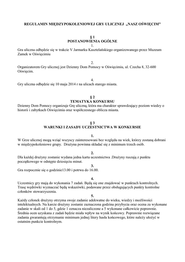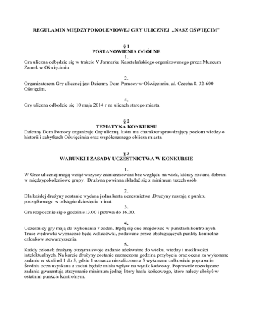 REGULAMIN MIĘDZYPOKOLENIOWEJ GRY ULICZNEJ „NASZ OŚWIĘCIM” §1 POSTANOWIENIA OGÓLNE 1. Gra uliczna odbędzie się w trakcie V Jarmarku Kasztelańskiego organizowanego przez Muzeum Zamek w Oświęcimiu 2. Organizatorem Gry ulicznej jest Dzienny Dom Pomocy w Oświęcimiu, ul. Czecha 8, 32-600 Oświęcim. 4. Gry uliczna odbędzie się 10 maja 2014 r na ulicach starego miasta. §2 TEMATYKA KONKURSU Dzienny Dom Pomocy organizuje Grę uliczną, która ma charakter sprawdzający poziom wiedzy o historii i zabytkach Oświęcimia oraz współczesnego oblicza miasta. §3 WARUNKI I ZASADY UCZESTNICTWA W KONKURSIE 1. W Grze ulicznej mogą wziąć wszyscy zainteresowani bez względu na wiek, którzy zostaną dobrani w międzypokoleniowe grupy. Drużyna powinna składać się z minimum trzech osób. 2. Dla każdej drużyny zostanie wydana jedna karta uczestnictwa .Drużyny ruszają z punktu początkowego w odstępie dziesięciu minut. 3. Gra rozpocznie się o godzinie13.00 i potrwa do 16.00. 4. Uczestnicy gry mają do wykonania 7 zadań. Będą się one znajdować w punktach kontrolnych. Trasę wędrówki wyznaczać będą wskazówki, podawane przez obsługujących punkty kontrolne członków stowarzyszenia. 5. Każdy członek drużyny otrzyma swoje zadanie adekwatne do wieku, wiedzy i możliwości intelektualnych. Na karcie drużyny zostanie zaznaczona godzina przybycia oraz ocena za wykonane zadanie w skali od 1 do 5, gdzie 1 oznacza niezaliczone a 5 wykonane całkowicie poprawnie. Średnia ocen uzyskana z zadań będzie miała wpływ na wynik końcowy. Poprawnie rozwiązane zadania gwarantują otrzymanie minimum jednej litery hasła końcowego, które należy ułożyć w ostatnim punkcie kontrolnym. 6. Grę uważa się za zakończoną w chwili oddania wypełnionej karty z hasłem końcowym. O zwycięstwie decyduje również czas dotarcia do mety i średnia ocen z wykonanych zadań. §4 NAGRODY 1. Nagrody w grze przewidziane są dla trzech pierwszych drużyn, które rozwiązały prawidłowo hasło końcowe, zdobyły najwięcej punktów oraz wykonały wszystkie zadania w najkrótszym czasie. 2. Wszyscy uczestnicy gry otrzymają pamiątkowe dyplomy. §5 DANE OSOBOWE UCZESTNIKÓW KONKURSU 1. Warunkiem udziału w Grze jest podanie prawdziwych danych osobowych, tj.: imienia i nazwiska uczestników gry. 2. Przystępując do Gry i akceptując niniejszy regulamin uczestnicy wyrażają także zgodę na przetwarzanie przez Organizatora danych osobowych. Dane będą przetwarzane w celu przeprowadzenia niniejszej Gry oraz w związku z wydaniem nagród. §6 POSTANOWIENIA KOŃCOWE Organizator jest uprawniony do zmiany postanowień niniejszego Regulaminu, o ile nie wpłynie to na pogorszenie warunków uczestnictwa w Grze ulicznej.