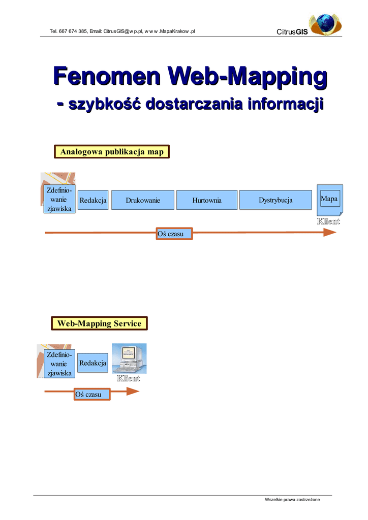 Tel. 667 674 385, Email: CitrusGIS@w p.pl, w w w .MapaKrakow .pl CitrusGIS Fenomen Web-Mapping - szybkość dostarczania informacji Analogowa publikacja map Zdefiniowanie zjawiska Redakcja Drukowanie Hurtownia Mapa Dystrybucja Klient Oś czasu Web-Mapping Service ZdefinioRedakcja wanie zjawiska Klient Oś czasu Wszelkie prawa zastrzeżone