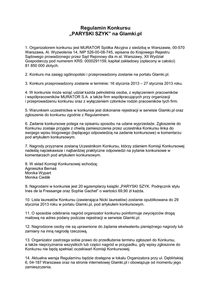 Regulamin Konkursu „PARYSKI SZYK” na Glamki.pl 1. Organizatorem konkursu jest MURATOR Spółka Akcyjna z siedzibą w Warszawie, 00-570 Warszawa, Al. Wyzwolenia 14, NIP 526-00-08-745, wpisana do Krajowego Rejestru Sądowego prowadzonego przez Sąd Rejonowy dla m.st. Warszawy, XII Wydział Gospodarczy pod numerem KRS: 0000291159, kapitał zakładowy (opłacony w całości) 81 850 000 złotych. 2. Konkurs ma zasięg ogólnopolski i przeprowadzony zostanie na portalu Glamki.pl. 3. Konkurs przeprowadzony zostanie w terminie: 16 stycznia 2013 – 27 stycznia 2013 roku. 4. W konkursie może wziąć udział każda pełnoletnia osoba, z wyłączeniem pracowników i współpracowników MURATOR S.A. a także firm współpracujących przy organizacji i przeprowadzeniu konkursu oraz z wyłączeniem członków rodzin pracowników tych firm. 5. Warunkiem uczestnictwa w konkursie jest dokonanie rejestracji w serwisie Glamki.pl oraz zgłoszenie do konkursu zgodnie z Regulaminem. 6. Zadanie konkursowe polega na opisaniu sposobu na udane wyprzedaże. Zgłoszenie do Konkursu zostaje przyjęte z chwilą zamieszczenia przez uczestnika Konkursu linka do swojego wpisu blogowego (będącego odpowiedzią na zadanie konkursowe) w komentarzu pod artykułem konkursowym. 7. Nagrody przyznane zostaną Uczestnikom Konkursu, którzy zdaniem Komisji Konkursowej nadeślą najciekawsze i najbardziej praktyczne odpowiedzi na pytanie konkursowe w komentarzach pod artykułem konkursowym. 8. W skład Komisji Konkursowej wchodzą: Agnieszka Bernaś Monika Wypart Monika Cieślik 9. Nagrodami w konkursie jest 20 egzemplarzy książki „PARYSKI SZYK. Podręcznik stylu Ines de la Fressange oraz Sophie Gachet” o wartości 69,90 zł każda. 10. Lista laureatów Konkursu (zawierająca Nicki laureatów) zostanie opublikowana do 29 stycznia 2013 roku w portalu Glamki.pl, pod artykułem konkursowym. 11. O sposobie odebrania nagród organizator konkursu poinformuje zwycięzców drogą mailową na adres podany podczas rejestracji w serwisie Glamki.pl. 12. Nagrodzone osoby nie są uprawnione do żądania ekwiwalentu pieniężnego nagrody lub zamiany na inną nagrodę rzeczową. 13. Organizator zastrzega sobie prawo do przedłużenia terminu zgłoszeń do Konkursu, a także nieprzyznania wszystkich lub części nagród w przypadku, gdy wpisy zgłoszone do Konkursu nie będą spełniać oczekiwań Komisji Konkursowej. 14. Aktualna wersja Regulaminu będzie dostępna w lokalu Organizatora przy ul. Dęblińskiej 6, 04-187 Warszawa oraz na stronie internetowej Glamki.pl i obowiązuje od momentu jego zamieszczenia. 15. Organizator konkursu zastrzega sobie prawo zmiany regulaminu pod warunkiem, że taka zmiana nie naruszy praw nabytych uczestników konkursu. Zmiana obowiązuje z chwilą opublikowania zmienionej wersji regulaminu na www.glamki.pl (na stronie z artykułem konkursowym). 16. Ewentualne reklamacje związane z Konkursem mogą być kierowane do Organizatora wyłącznie w formie pisemnej, na adres Organizatora w terminie 7 dni od daty ogłoszenia listy nagrodzonych. W przypadku przesłania reklamacji za pośrednictwem poczty decyduje data stempla pocztowego. 17. Reklamacja powinna zawierać imię, nazwisko, dokładny adres i numer telefonu, jak również dokładny opis i powód reklamacji. 18. Złożone przez Uczestników reklamacje będą rozpatrywane przez Komisję Sprawdzającą, powołaną przez Organizatora konkursu, nie później niż w terminie 21 dni od daty otrzymania reklamacji. 19. Zainteresowani Uczestnicy, zostaną powiadomieni o rozpatrzeniu reklamacji listem poleconym najpóźniej w ciągu 21 dni od daty rozpatrzenia reklamacji przez Komisję Sprawdzającą. 20. Decyzja Komisji Sprawdzającej co do zgłoszonej reklamacji jest ostateczna. 21. Niniejszy konkurs nie jest grą losową w rozumieniu ustawy z dnia 29 lipca 1992 roku o grach losowych i zakładach wzajemnych. 22. W razie sporów, które mogą powstać na tle stosowania niniejszego regulaminu, a które nie mogą zostać rozwiązane polubownie, każda ze stron może poddać rozstrzygnięciu przez właściwy rzeczowo i miejscowo sąd powszechny. W imieniu Organizatora Warszawa, 16 stycznia 2013 r. Agata Brzozowska