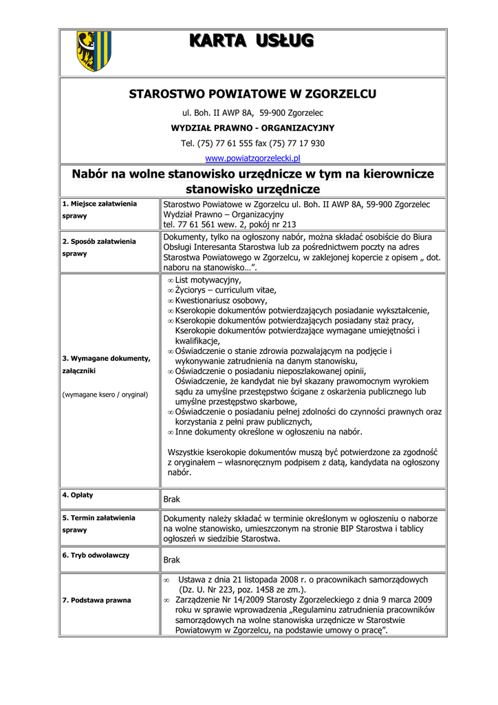 KARTA USŁUG STAROSTWO POWIATOWE W ZGORZELCU ul. Boh. II AWP 8A, 59-900 Zgorzelec WYDZIAŁ PRAWNO - ORGANIZACYJNY Tel. (75) 77 61 555 fax (75) 77 17 930 www.powiatzgorzelecki.pl Nabór na wolne stanowisko urzędnicze w tym na kierownicze stanowisko urzędnicze 1. Miejsce załatwienia sprawy 2. Sposób załatwienia sprawy Starostwo Powiatowe w Zgorzelcu ul. Boh. II AWP 8A, 59-900 Zgorzelec Wydział Prawno – Organizacyjny tel. 77 61 561 wew. 2, pokój nr 213 Dokumenty, tylko na ogłoszony nabór, można składać osobiście do Biura Obsługi Interesanta Starostwa lub za pośrednictwem poczty na adres Starostwa Powiatowego w Zgorzelcu, w zaklejonej kopercie z opisem „ dot. naboru na stanowisko…”. • • • • • • 3. Wymagane dokumenty, • załączniki (wymagane ksero / oryginał) • • List motywacyjny, Życiorys – curriculum vitae, Kwestionariusz osobowy, Kserokopie dokumentów potwierdzających posiadanie wykształcenie, Kserokopie dokumentów potwierdzających posiadany staż pracy, Kserokopie dokumentów potwierdzające wymagane umiejętności i kwalifikacje, Oświadczenie o stanie zdrowia pozwalającym na podjęcie i wykonywanie zatrudnienia na danym stanowisku, Oświadczenie o posiadaniu nieposzlakowanej opinii, Oświadczenie, że kandydat nie był skazany prawomocnym wyrokiem sądu za umyślne przestępstwo ścigane z oskarżenia publicznego lub umyślne przestępstwo skarbowe, Oświadczenie o posiadaniu pełnej zdolności do czynności prawnych oraz korzystania z pełni praw publicznych, Inne dokumenty określone w ogłoszeniu na nabór. Wszystkie kserokopie dokumentów muszą być potwierdzone za zgodność z oryginałem – własnoręcznym podpisem z datą, kandydata na ogłoszony nabór. 4. Opłaty 5. Termin załatwienia sprawy 6. Tryb odwoławczy Brak Dokumenty należy składać w terminie określonym w ogłoszeniu o naborze na wolne stanowisko, umieszczonym na stronie BIP Starostwa i tablicy ogłoszeń w siedzibie Starostwa. Brak • 7. Podstawa prawna Ustawa z dnia 21 listopada 2008 r. o pracownikach samorządowych (Dz. U. Nr 223, poz. 1458 ze zm.). • Zarządzenie Nr 14/2009 Starosty Zgorzeleckiego z dnia 9 marca 2009 roku w sprawie wprowadzenia „Regulaminu zatrudnienia pracowników samorządowych na wolne stanowiska urzędnicze w Starostwie Powiatowym w Zgorzelcu, na podstawie umowy o pracę”.