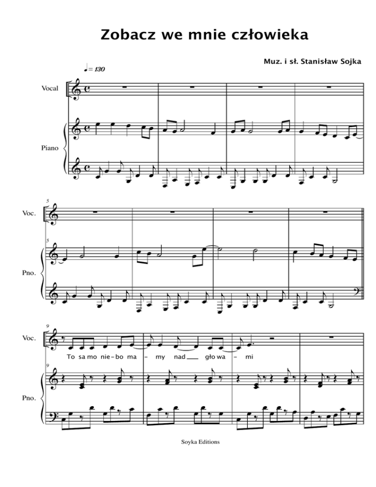 Zobacz we mnie człowieka »¡£º Muz. i sł. Stanisław Sojka q &c Vocal &c Piano 5 &œ Voc. 9 &‰ &Œ ∑ œ ∑ œ œ˙ ˙ ∑ œœ œ œœ œ œ œ œ ∑ œ œ ˙ œ j j & œ œ j œ œj j j j œ œ œ œ œ œ œ 9 Pno. œ œ œ œœ œ œ˙ ∑ & Pno. ∑ j c j & œ œ œ j œ œj j j j œ œj j j j œ œj j œ œj œ œ ˙ œ œ œ œ œ œ œ œ 5 Voc. ∑ œ œ œ œ œ œ To sa mo nie - bo ma j j ‰ Œ œœ ‰ œœ ?œœ ‰ œ œœ‰ œ œ ˙ Œ œ my nad j œœ ‰ œ œ ‰ ˙ œ œœ œ œœ j j j j j œ œj j œ œ œ œ œ œ ˙ œ œ j œ œ œj œ œ œ - ∑ gło wa j Œ œœ ‰ œœ‰ œ Soyka Editions j œ œ. - Œ mi Ó ? ∑ j j ‰ Œ œœ ‰ Œ j ‰ Œ œj ‰ œœ œ œœ œ‰ œœœ‰ œ œœ‰ œœœ‰ œ œ 2 &‰ Zobacz we mnie człowieka j Ó œ 13 Voc. &Œ ?œœ ‰ œ tak sa - mo &Œ . œ ?œ J - ˙ œ. œ J j œ j œ œ œ œ œ œ œ .. œœ J œœ œœ J &Œ ? œ œ. J ∑ j j j ‰ Œ œœ ‰ Œ œj ‰ Œ œœ ‰ œ œœ ˙ więc j j œ œ œ. chać Œ ko - cha - ni Pno. ko & œ œ œ œ Œ. 20 j œœ ‰ Œ j j œ œ œ œœ ˙˙ œ 20 Voc. da rzy Ó œ œ œ œ œ‰ œ œ œ œ œ ‰ œ œœ‰ œ œ œ ‰ œ ‰ œ ‰œ œ ‰ œ j œj œ œ & Œ. 17 Pno. pro mie nia mi j j ‰ Œ œœ ‰ Œ œj ‰ Œ œ œœ 17 Voc. j œ œ œ œ œ œ. to sa mo słoń - ce 13 Pno. œ œ œ œ. chce œ my chce -my œ ˙ œ œ ˙ nie œ J - Œ . œ œ J ˙ j j œ œ œ j œ j j œœ œœ œœ j œœ bój œ J się œ œ J Soyka Editions j œ œ Ó nie œ J być œœ ˙˙ œ ˙ j œ œ bój j œœ œœ œ J j œ œ j œ œ. się j œœ œœ .. œ J œ œ J j œ zo - œœ J œ J j & œ œ. Ó ∑ 23 Voc. 3 Zobacz we mnie człowieka Œ œ œ œ œ ba czyć œ Zo bacz we mnie czło - wie ka j œ œ j . œ œ œ œ ‰ Œ œ & œ œ . œ œ œ œ œœ œœ œœ œœ œœ œœ œ œ ‰ J œ 23 Pno. œ œ œ œ œ œ œ œ œ œ œ jœ ?œ J J J J J J J J œ j Œ Œ Ó œ & œ œ œ œj œ œ ja na li - tość nie & Œ œj ‰ Œ œ 27 Pno. œ œ ? œj œ œ œ J J J & j œ. œ 31 Voc. mi jam & Œ 31 Pno. j œœ ‰ Ó cze kam Œ œ œ J ∑ œ œœ J J Œ œ œ 27 Voc. œ œ tak jak j ‰ Œ œj ‰ Œ j ‰ œœ œ œœ œ œJ J œ œ jœ œ J œ J œ J j œ œ. ty œ J œ œ œ œ œ œ j œ œ œ ?œ J œ œ œ J œj œ JJ J JJ Soyka Editions œ œ J J œ œ œœ JJ œ œ œ. jes tem i œ œ J j œ prze œ œ œ œ œ œ J œ Jœ J J J œ œ œ zo bacz we mnie czło - wie ka j j ‰ Œ œœ ‰ Œ œj ‰ Œ œœj ‰ Œ j ‰ Œ œœ œœ œ j ‰ Œ œj ‰ œœ œ j j j Œ œœ ‰ Œ œœ ‰ Œ œœ ‰ œ J Œ œ œ œ Œ Œ Ó j œœ ‰ œ J Œ œ J œ Œ Ó j ‰ Œ œj ‰ œœ œ œœ JJ œ œ J 4 Zobacz we mnie człowieka j œ œ œ œ &Œ 35 Voc. zo - bacz u - wierz j ‰ Œ œœ &Œ 35 Pno. ? œj œ Voc. 3 w &Œ ?œ J œ j œœ ‰ Œ 42 Voc. & &œ œ˙ 42 Pno. œ œ œ J œ J ∑ j œ œ. nie zwle j œœ ‰ Œ œ J Œ tej po - dró ży 38 Pno. œ œ J J j Œ œ œ. & œ œ 38 j œ œ œ J œ ‰ Ty j‰ Œ œœ ˙˙ ∑ Œ - kaj j œœ ‰ Œ œ œ œ J J i œœ œœ œœ j œ œ œ œ œ œ œ œ œ œ œj ‰ œ œ œ œ‰ œ Soyka Editions bądź Œ jœ œ - j œj œ . œ my ra zem j‰ Œ œœ œ œ œ J J Ó œœ œ œ J œ. œ J ja Je - den œ œ œ œ j œ œ œ ?œ J œ J˙ JJ J j œœ ‰ j œ ˙ œ œ jœ œ jœ J œ Jœ Œ œ j œœ ‰ œ J ∑ œœ œœ œ ˙ œ œ j œ œ œ œ œJ œ œ œ œ œJ œ œ JJ J JJ nie Œ œ j j œ œ œ wi j œœ ‰ œ‰ œ - Œ dzi j œ œœ œ œ dru - gi nie ro j œœ ‰ Œ j œœ ‰ œ œ œ œ ‰ œ ‰ œ 5 Zobacz we mnie człowieka 46 Voc. & œ. zu - j Œ œ œ mie & Œ œj ‰ œ 46 Pno. œ ?œœ‰ ∑ j j Œ œœ ‰ Œ œj ‰ Œ œœ ‰ Œ j ‰ Œ œœ œ & œ œ œ œj . œ & Œ œj ‰ Œ œ 50 ? œœ‰ &Ó 54 Voc. œ . ˙ Œ. ∑ j œ œ œ œ a każ -dy jest j j j œœ ‰ Œ œœ ‰ Œ œœ ‰ Œ œ œœ ˙˙ œ‰ œ œ œ œ œ. œ ‰ œ ‰œ œ J u - ni kal œ ˙ & Œ œœ ˙ ?œœ J œ œ œ œ 54 Pno. j œœ ‰ Œ œ œ róż no j j ‰ Œ œ œœ œ ‰ œœ‰ œ œœ‰œœœ‰œ œ‰ œœœ ‰ œ œ œ‰ œœœ‰ œ œ rod - ne jed - no Pno. Œ 3 Róż ne róż - ni -ce 50 Voc. j œ œ. œ œ œ Ó j j œ œ œ ˙ œ œ œ œ - ny każ - dy czło Œ œ œœ œœ .. œ J œ. ˙ œœ J - j j œ œ œ ˙ waż - ny Œ ˙ œ J Œ wiek j œ œ. to jest œ ˙ œœ ˙ œ. ˙ œ œ œœ nie po ję te j j j j œœ œœ œœ œœ œœ œœ œœ œ œj œ . œ œ œ. J œ J œ œ œœ œ J J J Soyka Editions œœ J œ œ œJ œJ œ œJ J 6 Zobacz we mnie człowieka j & œ œ. ˙ Voc. sed - - Œ ˙. 58 Œ œ œ œ œ - no & œœ œœ .. œœ œœ œœ œœ œœ œœ œœ œœ œœ œœ œj ‰ Œ J œ ?œ J œ œ œ œ œ œ œ J œ J œ J œ œ œj œ J J J J j Œ Ó & Œ œ œ œ œ œj œ œ ja na li - tość nie &Œ 62 Pno. j‰ Œ œœ œ œ j œ œ œ ?œ J J J & j œ. œ 66 Voc. mi jam & Œ 66 Pno. j œœ ‰ Ó cze kam Œ œ œ J ∑ œ œ J J œ Œ œ œ 62 Voc. œ œ Zo bacz we mnie czło - wie ka 58 Pno. œ tak jak j ‰ Œ œj ‰ Œ j ‰ œœ œ œœ œ œ œ œJ J œj œ œJ J j œœ ‰ œ J j œ œ. Ty œ J œ œ œ œ œ ? œj œ œ œ J œ œ œ œ J œj œ JJ J JJ Soyka Editions œ œ J J œ œ œœ JJ œ œ œ. jes tem i œ œ J j œ prze œ œ œ œ œ œ J œ Jœ J J J œ œ œ zo bacz we mnie czło - wie ka j j ‰ Œ œœ ‰ Œ j ‰ Œ œj ‰ Œ j ‰ Œ œœ œ œœ œœ j ‰ Œ œj ‰ œœ œ j j Œ œœ ‰ Œ œœj ‰ Œ œœ ‰ œ J Œ œ œ œ Œ Œ Ó j œœ ‰ œ J Œ œ J œ Œ Ó j ‰ Œ œj ‰ œœ œ œœ JJ œ œ J 7 Zobacz we mnie człowieka j œ œ œ œ &Œ 70 Voc. zo - bacz u - wierz &Œ 70 Pno. ? œj œ &Œ œ 73 Voc. 3 w tej j ‰ Œ œœ œ œ J J j œ œ œ. pod-ró ży œ j œ nie j œœ ‰ œ J j œ œ. zwle Œ œ œ J - œ kaj j œœ ‰ Œ œ œ œ J J Ty j j Œ œ & œ ‰ Œ œœ ‰ Œ ˙ ˙ ?œ J œ & j œ. œ 77 Voc. wie ka Pno. œ J i ja œœ œœ ˙˙ Ó j œœ ‰ œ œ œ œ œ j œ 