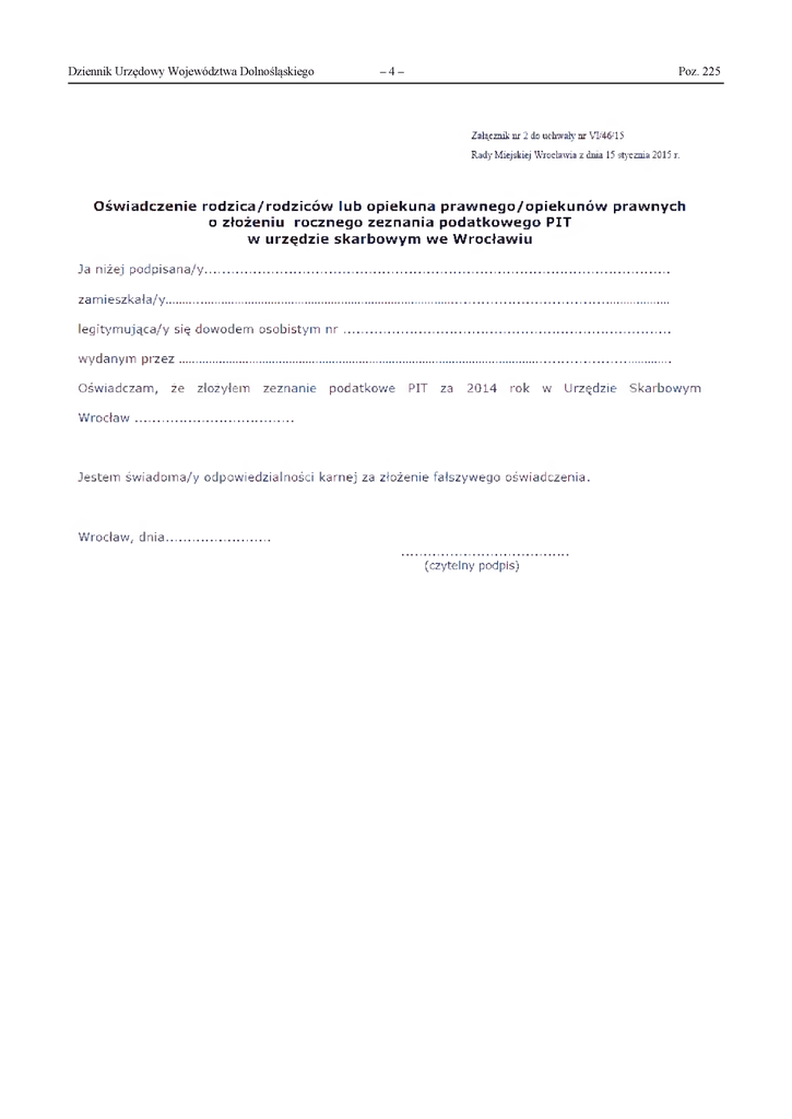 Dziennik Urzędowy Województwa Dolnośląskiego - 4- Poz. 225 Załącznik nr 2 do uchwały nr VL;46'15 Rady Miejskiej Wrocławia z dnia 15 stycznia 2013 r. O ś w i a d c z e n i e r o d z ic a / r o d z ic ó w lub o p i e k u n a p r a w n e g o / o p i e k u n ó w p r a w n y c h o z ło ż e n iu r o c z n e g o z e z n a n i a p o d a t k o w e g o PIT w u r z ę d z ie s k a r b o w y m w e W r o c ła w i u Ja n iże j p o d p is a n a /y ........................................................................................................................................ z a m ie s z k a ła /y .................................................................................................................................................... le g ity m u ją c a /y się d o w o d em o s o b is ty m n r ................................................................................................ w y d a n y m p r z e z ................................................................................................................................................ O ś w ia d c za m , że z ło ży łe m z e z n a n ie p o d a tk o w e PIT za 2014 ro k w U rzę d zie W r o c ła w .............................................. Jeste m ś w ia d o m a /y o d p o w ie d zia ln o śc i karn ej za zło że n ie fa łszy w e g o o św ia d cze n ia . W rocław , d n ia .............................. (czytelny podpis) S k a rb o w y m