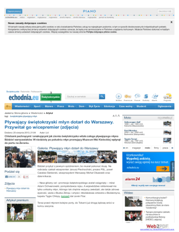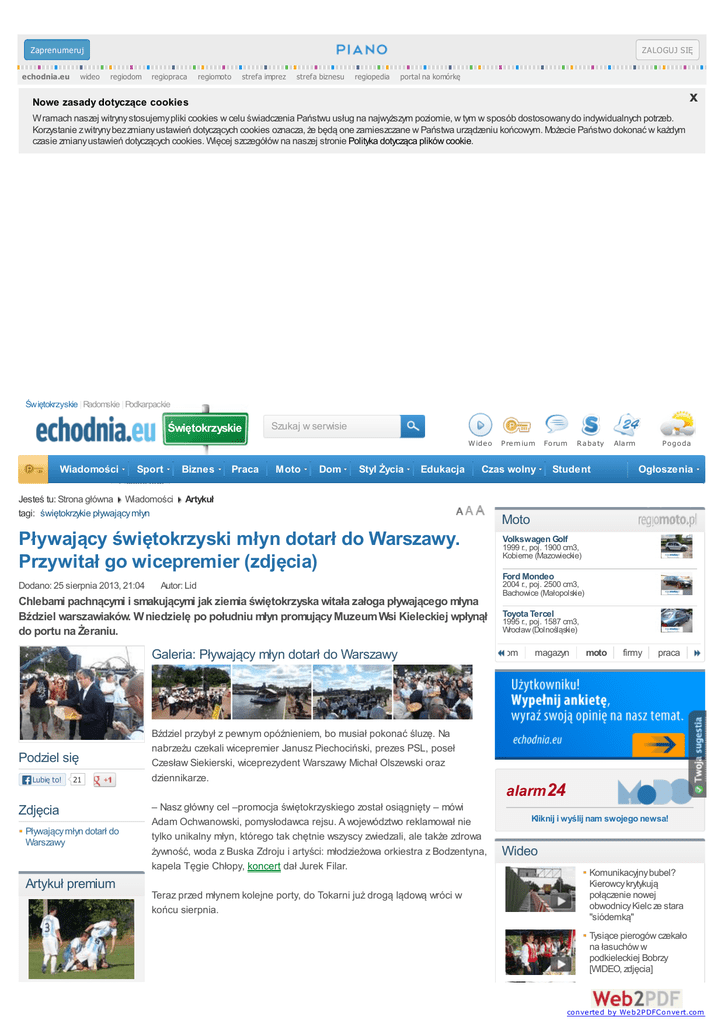 Zaprenumeruj echodnia.eu wideo ZALOGUJ SIĘ regiodom regiopraca regiomoto strefa imprez strefa biznesu regiopedia portal na komórkę x Nowe zasady dotyczące cookies W ramach naszej witryny stosujemy pliki cookies w celu świadczenia Państwu usług na najwyższym poziomie, w tym w sposób dostosowany do indywidualnych potrzeb. Korzystanie z witryny bez zmiany ustawień dotyczących cookies oznacza, że będą one zamieszczane w Państwa urządzeniu końcowym. Możecie Państwo dokonać w każdym czasie zmiany ustawień dotyczących cookies. Więcej szczegółów na naszej stronie Polityka dotycząca plików cookie. Świętokrzyskie | Radomskie | Podkarpackie Świętokrzyskie Szukaj w serwisie W ideo Wiadomości Sport Jesteś tu: Strona główna Wiadomości tagi: świętokrzykie pływający młyn Biznes Praca Moto Dom Styl Życia Edukacja Prem ium Czas wolny Forum Rabaty Student Alarm Pogoda Ogłoszenia Artykuł Pływający świętokrzyski młyn dotarł do Warszawy. Przywitał go wicepremier (zdjęcia) Moto Volkswagen Golf 1999 r., poj. 1900 cm3, Kobierne (Mazowieckie) Ford Mondeo Dodano: 25 sierpnia 2013, 21:04 Autor: Lid Chlebami pachnącymi i smakującymi jak ziemia świętokrzyska witała załoga pływającego młyna Bździel warszawiaków. W niedzielę po południu młyn promujący Muzeum Wsi Kieleckiej wpłynął do portu na Żeraniu. Galeria: Pływający młyn dotarł do Warszawy Podziel się Lubię to! 21 Zdjęcia Pływający młyn dotarł do Warszawy Bździel przybył z pewnym opóźnieniem, bo musiał pokonać śluzę. Na nabrzeżu czekali wicepremier Janusz Piechociński, prezes PSL, poseł Czesław Siekierski, wiceprezydent Warszawy Michał Olszewski oraz dziennikarze. – Nasz główny cel –promocja świętokrzyskiego został osiągnięty – mówi Adam Ochwanowski, pomysłodawca rejsu. A województwo reklamował nie tylko unikalny młyn, którego tak chętnie wszyscy zwiedzali, ale także zdrowa żywność, woda z Buska Zdroju i artyści: młodzieżowa orkiestra z Bodzentyna, kapela Tęgie Chłopy, koncert dał Jurek Filar. Artykuł premium Teraz przed młynem kolejne porty, do Tokarni już drogą lądową wróci w końcu sierpnia. 2004 r., poj. 2500 cm3, Bachowice (Małopolskie) Toyota Tercel 1995 r., poj. 1587 cm3, Wrocław (Dolnośląskie) dom magazyn moto firmy praca ceneo alarm 24 Kliknij i wyślij nam swojego newsa! Wideo Komunikacyjny bubel? Kierowcy krytykują połączenie nowej obwodnicy Kielc ze stara "siódemką" Tysiące pierogów czekało na łasuchów w podkieleckiej Bobrzy [WIDEO, zdjęcia] converted by Web2PDFConvert.com Leniwa niedziela - niewielu kielczan ćwiczyło z reebokiem [WIDEO] Klasa okręgowa. Udany finisz Neptuna Końskie (zdjęcia) Gra piłkarska ekstraklasa. Zobacz wyniki 5 kolejki, filmowe relacje z każdego meczu (VIDEO, zdjęcia) Sprawdź treści Premium. Zarejestruj się już dziś » Czytaj e-wydanie » Kup online Dodaj do: Facebook Wykop [VIDEO] Premier Tusk wygrał z Gowinem. Ale wynik byłego ministra całkiem niezły Newsletter Zamów najnowsze wiadomości Google Śledzik Drukuj GG Wyślij Zgłoś błąd więcej wideo » To również cię zainteresuje: Najczęściej czytane Air Show LIVE z Radomia. Co dzieje się na lotnisku na Sadkowie? Niedziela, 25 sierpnia, to drugi i zarazem ostatni dzień Międzynarodowych Pokazów Lotniczych Air Show Radom 2013. To największa impreza lotnicza w Polsce! TYLKO U NAS! WSZYTKO O AIR SHOW więcej S P O N Dzisiaj S Wyprzedaż kawalerek! Już od 58 000 zł! Sprawdź najlepsze ofert na rynku nieruchomości. więcej Końskie: Wypadek w Odrowążu w powiecie koneckim. Nie żyje 59-letni pieszy Do dramatu, jak opowiadają stróże prawa - doszło w niedzielę przed godziną 21. Ze wstępnych ustaleń wynika, że trzeźwy, 27-letni kierowca audi a6 potrącił pieszego przechodzącego przez jezdnię. więcej Nowe! Tragiczne dachowanie. Nie żyje kierowca opla Nowe! Śmiertelne potrącenie. Pieszy zginął na miesjcu Komunikacyjny bubel? Kierowcy krytykują połączenie nowej obwodnicy Kielc ze stara "siódemką" Miss Lata w Kaniowie 2013 - zobacz kandydatki w kostiumach kąpielowych Pływający świętokrzyski młyn dotarł do Warszawy. O W AgoNwicepremier E Przywitał (zdjęcia) Miss Lata w Strawczynie. Oto kandydatki w strojach kąpielowych (zdjęcia, video) Fałszywi krewni zaatakowali. Wszystkie próby kradzieży nieudane Motocyklista ze Świętokrzyskiego zginął w wypadku Forum Nowe Polecamy Air Show Radom 2013. Zobacz filmy z niedzielnych akrobacji echodnia.eu Air Show Radom 2013. Zobacz sobotnie pokazy pilotów [Wideo] echodnia.eu Po 11 latach wyszedł z więzienia. Mówi: Za zabójstwo skazali niewinnego człowieka! pomorska.pl Tragedia na drodze. Nie żyje 59-letni pieszy Tysiące pierogów czekało na łasuchów w podkieleckiej Bobrzy [WIDEO, zdjęcia] R Artykuły premium Nie żyje poseł Konstanty Miodowicz (zdjęcia) [VIDEO] Niedzielne pokazy podczas Air Show w Radomiu - zobacz filmy! Międzynarodowe Pokazy Lotnicze Air Show Radom 2013: najciekawsze występy drugiego dnia imprezy. więcej Najnowsze wiadomości O Tydzień Popularne Dziewczyny z Obic ugaszą każdy pożar przedstawiamy świetną damską drużynę strażacką Miss Lata w Strawczynie. Oto kandydatki w strojach kąpielowych (zdjęcia, video) Wieża na Świętym Krzyżu juz powstaje! Zobacz jak jest budowana [VIDEO, zdjęcia] Referendum w Piekoszowie. Nieoficjalnie - wójt odwołany Regiopedia - świętokrzyskie Serwisy tematyczne Jaskinia Odstrzelona w Kowali Góra Berberysówka Kim są z zawodu prezydenci miast? Sprawdź wykształcenie samorządowców Wasze komentarze Na razie brak komentarzy, Twój może być pierwszy. Jak zabezpieczyć się przed awariami zasilania forum.echodnia.eu Fotoradar strzela zza barierki, czyli straż miejska w akcji Echo Dnia Świętokrzyskie Echo Dnia w Obserwuj Like 22,115 people like Echo Dnia Świętokrzyskie. +205 DołączdonaswGoogle+ Sonda Czy nowy trener Korony Kielce Jose Rojo Martin osiąg