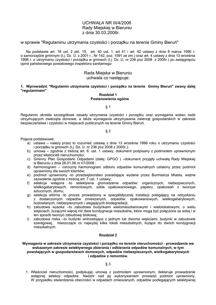 UCHWAŁA NR III/4/2006 Rady Miejskiej w Bieruniu z dnia 30.03.2006r. w sprawie "Regulaminu utrzymania czystości i porządku na terenie Gminy Bieruń" Na podstawie art. 18 ust. 2 pkt. 15, art. 40 ust. 1, art 41 i art. 42 ustawy z dnia 8 marca 1990 r. o samorządzie gminnym (t.j. Dz. U. z 2001 r., Nr 142, poz. 1591 ze zm.) oraz art. 4 ustawy z dnia 13 września 1996 r. o utrzymaniu czystości i porządku w gminach (t.j. Dz. U. nr 236 poz 2008 z 2005r.) po zasięgnięciu opinii państwowego powiatowego inspektora sanitarnego Rada Miejska w Bieruniu uchwala co następuje: 1. Wprowadzić "Regulamin utrzymania czystości i porządku na terenie Gminy Bieruń" zwany dalej "regulaminem" Rozdział 1 Postanowienia ogólne §1 Regulamin określa szczegółowe zasady utrzymania czystości i porządku oraz wymagania wobec osób utrzymujących zwierzęta domowe, a także wymagania utrzymywania zwierząt gospodarskich w zakresie bezpieczeństwa i czystości w miejscach publicznych na terenie Gminy Bieruń. §2 Pojęcia podstawowe: a) ustawa – należy przez to rozumieć ustawę z dnia 13 września 1996 roku o utrzymaniu czystości i porządku w gminach (t.j. Dz. U. nr 236 poz 2008 z 2005r.); b) umowa – zgodnie z treścią art. 6. ust. 1 ustawy, dokument podpisany z podmiotem uprawnionym przez właścicieli nieruchomości; c) Gminny Plan Gospodarki Odpadami (dalej: GPGO ) –dokument przyjęty uchwałą Rady Miejskiej w Bieruniu z dnia 26.01.06 nr I/7/2006 ; d) harmonogram – coroczny harmonogram odbioru odpadów komunalnych ustalony przez podmiot uprawniony dla swoich klientów; e) podmiot uprawniony -to przedsiębiorstwo posiadające wydane przez Burmistrza Miasta, ważne zezwolenie zgodnie z treścią art. 7 ust. 1 ustawy; f) selekcja wstępna -to selektywne gromadzenie odpadów: organicznych, niebezpiecznych, wielkogabarytowych, remontowych, szkła opakowaniowego, papieru, opakowań z tworzyw sztucznych, złomu; g) selekcja wtórna -to proces prowadzony w specjalistycznej instalacji polegający na odzyskaniu z dostarczonych odpadów zmieszanych, odpadów: opakowaniowych, wielkogabarytowych, budowlanych, niebezpiecznych i ulegających biodegradacji; h) zabudowa wysoka –to zabudowa budynkami wielomieszkaniowymi i wielolokalowymi, o wielu wejściach, liczącymi więcej niż dwie kondygnacje mieszkalne, które mogą być połączone ze sobą i w ten sposób tworzyć zabudowę blokową; i) zabudowa niska –to budynki wolnostojące z jednym lub dwoma wejściami, budynki w zabudowie szeregowej, mieszczące co najwyżej kilka lokali mieszkalnych, liczące do dwóch kondygnacji mieszkalnych. Rozdział 2 Wymagania w zakresie utrzymania czystości i porządku na terenie nieruchomości - prowadzenie we wskazanym zakresie selektywnego zbierania i odbierania odpadów komunalnych, w tym powstających w gospodarstwach domowych, odpadów niebezpiecznych, wielkogabarytowych i odpadów z remontów. §3 1. Właściciel nieruchomości, podpisując umowę z podmiotem uprawnionym, deklaruje prowadzenie wstępnej selekcji odpadów. Nadzór nad jej wykonywaniem prowadzi podmiot uprawniony. W przypadku stwierdzenia obecności w odpadach zmieszanych, odpadów podlegających selektywnej zbiórce, podmiot uprawniony przekazuje je do selekcji wtórnej na koszt właściciela nieruchomości. 2. Jeżeli właściciel nieruchomości nie złoży deklaracji wstępnej selekcji odpadów tj. nie zamierza lub nie ma możliwości jej prowadzenia, zleca za dodatkową opłatą selekcję wtórną podmiotowi uprawnionemu. §4 Cena odbioru odpadów opakowaniowych wstępnie posegregowanych ujęta będzie w cenie odbioru pozostałych odpadów zmieszanych. §5 Właściciel nieruchomości w zabudowie niskiej może prowadzić kompostowanie bioodpadów na swojej posesji. Rozdział 3 Wymagania w zakresie utrzymania czystości i porządku na terenie nieruchomości - uprzątanie błota, śniegu, lodu i innych zanieczyszczeń z części nieruchomości służących do użytku publicznego §6 W okresie zimowym, w części nieruchomości służącej do użytku publicznego, należy niezwłocznie usuwać śnieg, błoto pośniegowe, lód oraz zapobiegać śliskości. §7 Poza okresem zimowym, w części nieruchomości służącej do użytku publicznego, należy usuwać zanieczyszczenia, a w szczególności: a) oczyścić pas drogowy, chodniki i place z zanieczyszczeń nagromadzonych w okresie zimowym w terminie do końca maja; b) zamiatać mechanicznie ulice okrawężnikowane z częstotliwością raz na miesiąc, a w październiku i listopadzie raz na dwa tygodnie; c) usuwać odpady i liście z poboczy, przydrożnych rowów, trawników, zieleńców z częstotliwością raz na miesiąc; d) oczyszczać chodniki z zanieczyszczeń sypkich, odpadów, darni, przerostów zieleni i liści z częstotliwością raz na miesiąc; e) interwencyjnie oczyszczać drogi, place i chodniki w przypadku zalegania odpadów mogących utrudnić ich użytkowanie. Rozdział 4 Wymagania w zakresie utrzymania czystości i porządku na terenie nieruchomości - mycie i naprawy pojazdów samochodowych poza myjniami i warsztatami naprawczymi §8 1. Mycie pojazdów samochodowych można przeprowadzać tylko na terenie utwardzonym. Zabrania się odprowadzania ścieków bezpośrednio do zbiorników i cieków wodnych lub do ziemi. 2. Dopuszcza się naprawę pojazdów w obrębie indywidualnych nieruchomości, jeżeli nie spowodują zanieczyszczenia wód i gleby oraz uciążliwości dla sąsiadów. Rozdział 5 Rodzaj i minimalna pojemność urządzeń przeznaczonych do zbierania odpadów komunalnych na terenie nieruchomości oraz na drogach publicznych, warunki rozmieszczenia tych urządzeń i ich utrzymania w odpowiednim stanie sanitarnym, porządkowym i technicznym. §9 1. Właściciele nieruchomości w zabudowie niskiej mają obowiązek wyposażenia jej w: a) minimum 1 pojemnik o pojemności 120 l do gromadzenia odpadów zmieszanych, na każde dwie osoby z niego korzystające ; b) minimum 