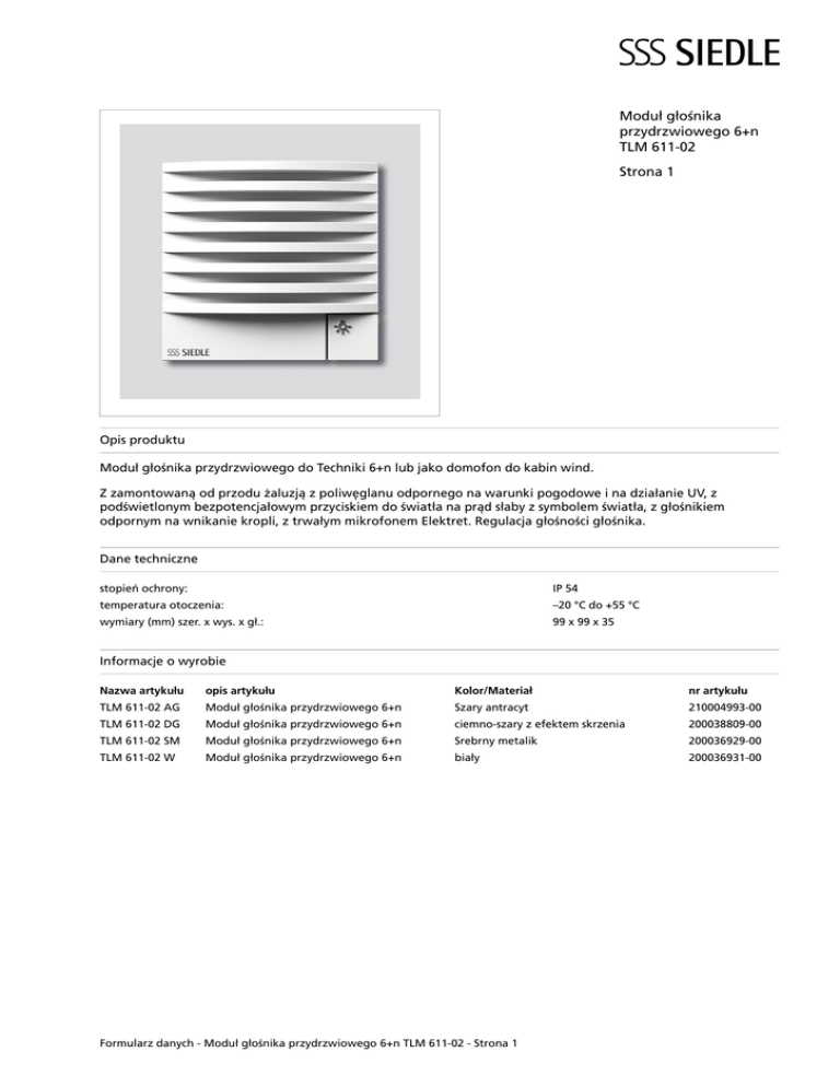 Moduł głośnika przydrzwiowego 6+n TLM 611-02 Strona 1 Opis produktu Moduł głośnika przydrzwiowego do Techniki 6+n lub jako domofon do kabin wind. Z zamontowaną od przodu żaluzją z poliwęglanu odpornego na warunki pogodowe i na działanie UV, z podświetlonym bezpotencjałowym przyciskiem do światła na prąd słaby z symbolem światła, z głośnikiem odpornym na wnikanie kropli, z trwałym mikrofonem Elektret. Regulacja głośności głośnika. Dane techniczne stopień ochrony: IP 54 temperatura otoczenia: –20 °C do +55 °C wymiary (mm) szer. x wys. x gł.: 99 x 99 x 35 Informacje o wyrobie Nazwa�artykułu opis�artykułu Kolor/Materiał nr�artykułu TLM 611-02 AG Moduł głośnika przydrzwiowego 6+n Szary antracyt 210004993-00 TLM 611-02 DG Moduł głośnika przydrzwiowego 6+n ciemno-szary z efektem skrzenia 200038809-00 TLM 611-02 SM Moduł głośnika przydrzwiowego 6+n Srebrny metalik 200036929-00 TLM 611-02 W Moduł głośnika przydrzwiowego 6+n biały 200036931-00 Formularz danych - Moduł głośnika przydrzwiowego 6+n TLM 611-02 - Strona 1 Moduł głośnika przydrzwiowego 6+n TLM 611-02 Strona 2 Osprzęt Nazwa�artykułu opis�artykułu Kolor/Materiał nr�artykułu Vario 611 AG Lakier naprawczy Szary antracyt 210005171-00 Vario 611 DG Lakier naprawczy ciemno-szary z efektem skrzenia 200039946-01 Vario 611 SM Lakier naprawczy Srebrny metalik 200039937-01 Vario 611 W Lakier naprawczy biały 200039936-01 Części zamienne Nazwa�artykułu opis�artykułu Kolor/Materiał nr�artykułu TLM 611-... Kostka zaciskowa czarny 200016574-01 TLM 611/612-01, BTLM 650 DG Przycisk do światła z symbolem światła ciemno-szary z efektem skrzenia 200029980-00 TLM 611/612-01, BTLM 650 SM Przycisk do światła z symbolem światła Srebrny metalik 200029098-00 TLM 611/612-01, BTLM 650 W Przycisk do światła z symbolem światła biały 200029096-00 TLM 611/612/640/650-... Głośnik pozostałe 200029074-00 TLM 611/650 Mikrofon pozostałe 200029078-00 Formularz danych - Moduł głośnika przydrzwiowego 6+n TLM 611-02 - Strona 2 Moduł głośnika przydrzwiowego 6+n TLM 611-02 Strona 3 Formularz danych - Moduł głośnika przydrzwiowego 6+n TLM 611-02 - Strona 3 Moduł głośnika przydrzwiowego 6+n TLM 611-02 Strona 4 Informacja o produktach TLM 611-... 691 kB Pobieranie Deklaracja Zgodności 601 kB Pobieranie Podręcznik systemowy 1,4 MB Pobieranie Formularz danych - Moduł głośnika przydrzwiowego 6+n TLM 611-02 - Strona 4