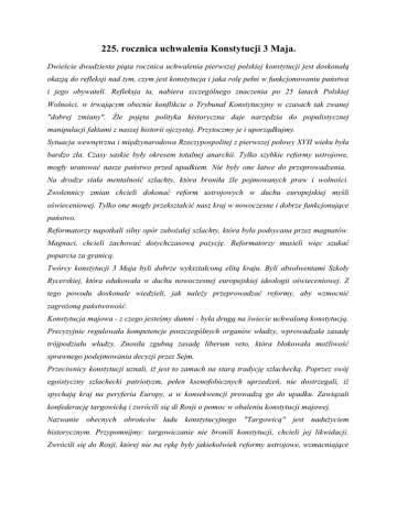 225. rocznica uchwalenia Konstytucji 3 Maja. Dwieście dwudziesta piąta rocznica uchwalenia pierwszej polskiej konstytucji jest doskonałą okazją do refleksji nad tym, czym jest konstytucja i jaka rolę pełni w funkcjonowaniu państwa i jego obywateli. Refleksja ta, nabiera szczególnego znaczenia po 25 latach Polskiej Wolności, w trwającym obecnie konflikcie o Trybunał Konstytucyjny w czasach tak zwanej "dobrej zmiany". Źle pojęta polityka historyczna daje narzędzia do populistycznej manipulacji faktami z naszej historii ojczystej. Przytoczmy je i uporządkujmy. Sytuacja wewnętrzna i międzynarodowa Rzeczypospolitej z pierwszej połowy XVII wieku była bardzo zła. Czasy saskie były okresem totalnej anarchii. Tylko szybkie reformy ustrojowe, mogły uratować nasze państwo przed upadkiem. Nie były one łatwe do przeprowadzenia. Na drodze stała mentalność szlachty, która broniła źle pojmowanych praw i wolności. Zwolennicy zmian chcieli dokonać reform ustrojowych w duchu europejskiej myśli oświeceniowej. Tylko one mogły przekształcić nasz kraj w nowoczesne i dobrze funkcjonujące państwo. Reformatorzy napotkali silny opór zubożałej szlachty, która była podsycana przez magnatów. Magnaci, chcieli zachować dotychczasową pozycję. Reformatorzy musieli więc szukać poparcia za granicą. Twórcy konstytucji 3 Maja byli dobrze wykształconą elitą kraju. Byli absolwentami Szkoły Rycerskiej, która edukowała w duchu nowoczesnej europejskiej ideologii oświeceniowej. Z tego powodu doskonale wiedzieli, jak należy przeprowadzać reformy, aby wzmocnić zagrożoną państwowość. Konstytucja majowa - z czego jesteśmy dumni - była drugą na świecie uchwaloną konstytucją. Precyzyjnie regulowała kompetencje poszczególnych organów władzy, wprowadzała zasadę trójpodziału władzy. Znosiła zgubną zasadę liberum veto, która blokowała możliwość sprawnego podejmowania decyzji przez Sejm. Przeciwnicy konstytucji uznali, iż jest to zamach na starą tradycję szlachecką. Poprzez swój egoistyczny szlachecki patriotyzm, pełen ksenofobicznych uprzedzeń, nie dostrzegali, iż spychają kraj na peryferia Europy, a w konsekwencji prowadzą go do upadku. Zawiązali konfederację targowicką i zwrócili się di Rosji o pomoc w obaleniu konstytucji majowej. Nazwanie obecnych obrońców ładu konstytucyjnego "Targowicą" jest nadużyciem historycznym. Przypomnijmy: targowiczanie nie bronili konstytucji, chcieli jej likwidacji. Zwrócili się do Rosji, której nie na rękę były jakiekolwiek reformy ustrojowe, wzmacniające pozycję naszego kraju. W Rosji rządzonej w sposób absolutystyczny, myśl oświeceniowa była zupełnie obca i akceptowana tylko pozornie. Czyż dzisiaj nie jest podobnie? To właśnie Rosji zależy najbardziej na słabej Unii Europejskiej, na słabej Polsce, na marginalizacji naszego kraju we Wspólnocie Europejskiej. Instytucje unijne, ludzie nauki, jaki i Rada Europy, bronią ładu konstytucyjnego w Polsce. Ich głos nie jest ingerencją w naszą suwerenność. Silna i solidarna Europa to silna Polska. Tylko mocno zaślepiony ideologicznie człowiek nie dostrzega pozytywnych zmian w Polsce wynikających z naszej integracji europejskiej. Obrona Trybunału Konstytucyjnego przed paraliżem jego funkcjonowania trwająca od grudnia 2015 r. jest naszym patriotycznym, dobrze rozumianym obowiązkiem. Nie pozwólmy sobie wmówić, iż zamieszanie wokół Trybunału Konstytucyjnego nic nie obchodzi większości Polaków. Nikt nie broni obecnej władzy wprowadzać zmian. Ale nikt nie dał jej politycznego mandatu do zmian konstytucyjnych. Zwykłą większością nie można zmieniać konstytucji. Trybunał ma własnie dlatego, pilnować ładu konstytucyjnego, przed nadmiernymi zakusami władzy. Nikt z nas nie chce żyć w zanarchizowanym państwie. Dlatego myślę i mam nadzieję, że wszystkim nam zależy na pomyślnym rozwiązaniu patu konstytucyjnego. Można go przezwyciężyć jedynie, w wyniku kompromisu, gdyż jak mówi jedno z japońskich powiedzeń "Mądry kompromis jest wart więcej, niż tysiąc zwycięstw. Niestety, jak kiedyś zauważył, polski dyplomata, historyk - świętej pamięci Stefan Meller: "Defektem polskiego myślenia o polityce, jest rozumienie kompromisu według schematu: "nasze zwycięstwo, ich klęska". Nie, na kompromisie każdy musi coś zyskać i każdy z czegoś ustąpić". Ale dla demokracji i bezpieczeństwa obywateli Polski warto. Niech się święci 3 Maja!