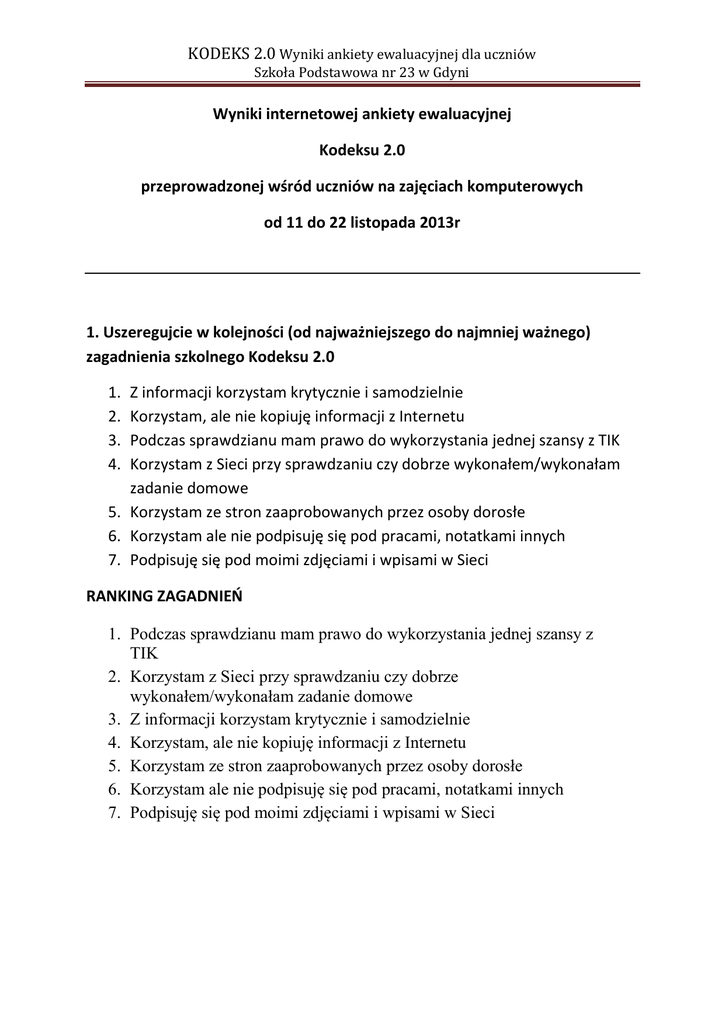 KODEKS 2.0 Wyniki ankiety ewaluacyjnej dla uczniów Szkoła Podstawowa nr 23 w Gdyni Wyniki internetowej ankiety ewaluacyjnej Kodeksu 2.0 przeprowadzonej wśród uczniów na zajęciach komputerowych od 11 do 22 listopada 2013r 1. Uszeregujcie w kolejności (od najważniejszego do najmniej ważnego) zagadnienia szkolnego Kodeksu 2.0 1. 2. 3. 4. Z informacji korzystam krytycznie i samodzielnie Korzystam, ale nie kopiuję informacji z Internetu Podczas sprawdzianu mam prawo do wykorzystania jednej szansy z TIK Korzystam z Sieci przy sprawdzaniu czy dobrze wykonałem/wykonałam zadanie domowe 5. Korzystam ze stron zaaprobowanych przez osoby dorosłe 6. Korzystam ale nie podpisuję się pod pracami, notatkami innych 7. Podpisuję się pod moimi zdjęciami i wpisami w Sieci RANKING ZAGADNIEŃ 1. Podczas sprawdzianu mam prawo do wykorzystania jednej szansy z TIK 2. Korzystam z Sieci przy sprawdzaniu czy dobrze wykonałem/wykonałam zadanie domowe 3. Z informacji korzystam krytycznie i samodzielnie 4. Korzystam, ale nie kopiuję informacji z Internetu 5. Korzystam ze stron zaaprobowanych przez osoby dorosłe 6. Korzystam ale nie podpisuję się pod pracami, notatkami innych 7. Podpisuję się pod moimi zdjęciami i wpisami w Sieci KODEKS 2.0 Wyniki ankiety ewaluacyjnej dla uczniów Szkoła Podstawowa nr 23 w Gdyni 2. Czy uważacie, że następujące zapisy Kodeksu powinny w nim pozostać? 1. Nauczyciele wykorzystują TIK jako wsparcie dydaktyczne 56,2% 2. Wychowawca i gospodarz klasy komunikują się za pomoca poczty elektronicznej i innych narzędzi TIK 66% 3. Każda klasa prowadzi swój blog 66% 4. Linki do bezpiecznych stron edukacyjnych publikowane są na stronie szkoły 75% 5. Mogę wysyłać pracę domową pocztą elektroniczną 53% 6. Modernizujemy stronę internetową szkoły aby korzystanie z niej było łatwiejsze 75% 3. Jakie inne zapisy wprowadzilibyście do Kodeksu 2.0 (zapis zgodny z oryginałem) Zmienić – z nauczycielami raczej nie powinniśmy komunikować się smsem wylogować ze strony/poczty itp. – jeśli ktoś zapomniał 1.Wprowadzamy do kółek szkoły kółko Informatyczne tak, aby na lekcji zapoznać się z urządzeniami w środku komputera. 2.Pozwalamy uczniom wchodzić na strony portalowe na których mają konto ale na ich korzyść. żeby było możliwe 2 podpowiedzi na sprawdzanie (klasówce ,pracy klasowej ) Na komputerach szkolnych można wyświetlać uczące (edukacyjne) strony internetowe. nie wchodzić na nieznane strony 6x Każdy uczeń ma swój tablet zamiast książek. Mogę mieć jedną szansę na całe 6 lat na zrezygnowanie z jednego sprawdzianu KODEKS 2.0 Wyniki ankiety ewaluacyjnej dla uczniów Szkoła Podstawowa nr 23 w Gdyni EWALUACJA – Jak Kodeks 2.0 funkcjonuje w szkole? 4. Czy w szkole stosowane są następujące zapisy szkolnego Kodeksu 2.0? 1. Możliwość skorzystania z "podpowiedzi" w czasie sprawdzianów (z użyciem TIK) TAK 28% NIE 65%, NIE WIEM 12% 2. Komunikowanie się z nauczycielem za pomocą poczty elektronicznej/komunikatora TAK 53% NIE 47% NIE WIEM 3% 3. Możliwość przesyłania prac domowych pocztą elektroniczną TAK 69% NIE 9% NIE WIEM 22% 4. Używanie komputerów w czasie lekcji TAK 30% NIE 53% NIE WIEM 20% 5. Używanie tablicy interaktywnej TAK 97% NIE 0% NIE WIEM 3% KODEKS 2.0 Wyniki ankiety ewaluacyjnej dla uczniów Szkoła Podstawowa nr 23 w Gdyni 120% 97% 100% 80% 69% 65% 60% 53% 47% 53% 40% 30% 28% 22% 20% 12% TAK 9% 3% 0% 20% 0 3% NIE NIE WIEM 5. Na jakich zajęciach najczęściej stosowane są zapisy Kodeksu 2.0 (uczniowie podają przedmioty) J. POLSKI 19% J. ANG. 9% HISTORIA 13% RELIGIA 16% MATEMATYKA 16% PRZYRODA 16% PLASTYKA 9% KODEKS 2.0 Wyniki ankiety ewaluacyjnej dla uczniów Szkoła Podstawowa nr 23 w Gdyni MUZYKA 9% ZAJĘCIA KOMPUTEROWE 97% STOSOWANIE KODEKSU 2.0 NA ZAJĘCIACH 120% 97% 100% 80% 60% 40% 20% 19% 9% 13% 16% 16% 16% 9% 9% 0% 6. Czy w szkole omawiane są zasady bezpieczeństwa w Sieci? (TAK, NIE) TAK 91% NIE 6% NIE WIEM 3% KODEKS 2.0 Wyniki ankiety ewaluacyjnej dla uczniów Szkoła Podstawowa nr 23 w Gdyni 100% 91% 90% 80% TAK 70% 60% 50% NIE 40% 30% NIE WIEM 20% 10% 0% Czy w szkole omawiane są zasady bezpieczeństwa w Sieci? Ankieta została opracowana przez p. Marcina Wiśniewskiego za pomocą aplikacji dostępnej na stronie https://www.surveymonkey.com/home/ i udostępniona uczniom za pomocą linku.