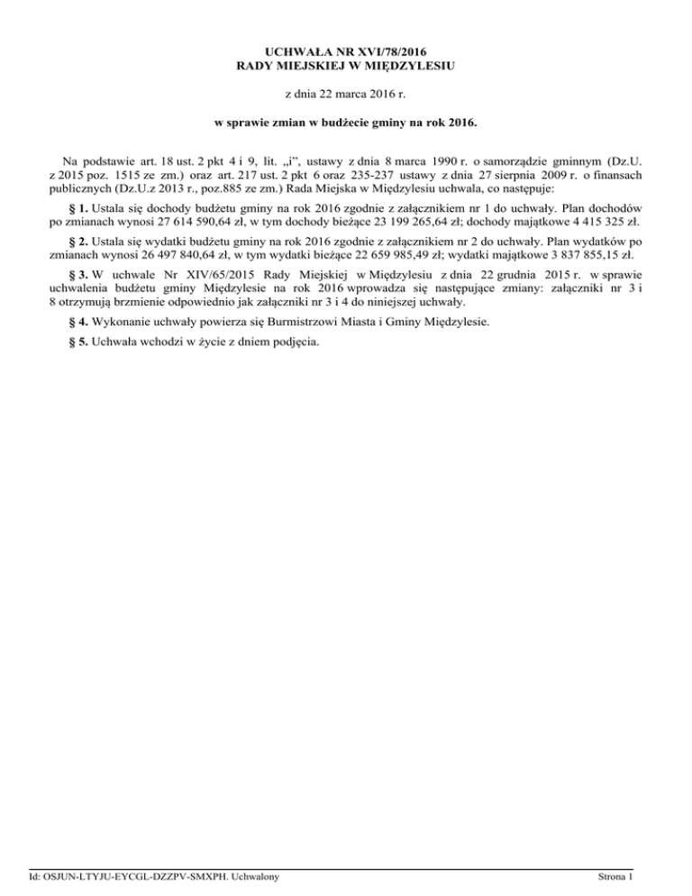 UCHWAŁA NR XVI/78/2016 RADY MIEJSKIEJ W MIĘDZYLESIU z dnia 22 marca 2016 r. w sprawie zmian w budżecie gminy na rok 2016. Na podstawie art. 18 ust. 2 pkt 4 i 9, lit. „i”, ustawy z dnia 8 marca 1990 r. o samorządzie gminnym (Dz.U. z 2015 poz. 1515 ze zm.) oraz art. 217 ust. 2 pkt 6 oraz 235-237 ustawy z dnia 27 sierpnia 2009 r. o finansach publicznych (Dz.U.z 2013 r., poz.885 ze zm.) Rada Miejska w Międzylesiu uchwala, co następuje: § 1. Ustala się dochody budżetu gminy na rok 2016 zgodnie z załącznikiem nr 1 do uchwały. Plan dochodów po zmianach wynosi 27 614 590,64 zł, w tym dochody bieżące 23 199 265,64 zł; dochody majątkowe 4 415 325 zł. § 2. Ustala się wydatki budżetu gminy na rok 2016 zgodnie z załącznikiem nr 2 do uchwały. Plan wydatków po zmianach wynosi 26 497 840,64 zł, w tym wydatki bieżące 22 659 985,49 zł; wydatki majątkowe 3 837 855,15 zł. § 3. W uchwale Nr XIV/65/2015 Rady Miejskiej w Międzylesiu z dnia 22 grudnia 2015 r. w sprawie uchwalenia budżetu gminy Międzylesie na rok 2016 wprowadza się następujące zmiany: załączniki nr 3 i 8 otrzymują brzmienie odpowiednio jak załączniki nr 3 i 4 do niniejszej uchwały. § 4. Wykonanie uchwały powierza się Burmistrzowi Miasta i Gminy Międzylesie. § 5. Uchwała wchodzi w życie z dniem podjęcia. Id: OSJUN-LTYJU-EYCGL-DZZPV-SMXPH. Uchwalony Strona 1 Uzasadnienie 1) I. Zmian w budżecie w zakresie dochodów dokonano z tytułu: - dział 600 rozdział 60016 – zwiększenia o kwotę 26 070 zł, w tym: 1 070 zł – z tytułu odszkodowania od ubezpieczyciela za uszkodzone mienie oraz 25 000 zł z tytułu planowanej dotacji z budżetu Województwa Dolnośląskiego w ramach Odnowy Dolnośląskiej Wsi na realizację zadania pn. „Remont nawierzchni dojazdu przy budynkach nr 4-6, 8-10 na ulicy Kolejowej w Międzylesiu na dz. Nr 334/21 dr”, - dział 750 rozdział 75023 – zwiększenia o kwotę 62 zł z tytułu odszkodowania od ubezpieczyciela za uszkodzone mienie gminne, - dział 754 rozdział 75412 zwiększenia o kwotę 1 217 zł z tytułu odszkodowania od ubezpieczyciela za uszkodzone mienie gminne - dział 900 rozdział 90002 – zwiększenia o kwotę 31 246,64 zł, w tym: 24 112 zł z tytułu planowanej dotacji z Wojewódzkiego Funduszu Ochrony Środowiska i Gospodarki Wodnej na realizację zadania p.n. „Realizacja Programu usuwania azbestu i wyrobów zawierających azbest z terenu gminy Międzylesie” oraz 7 134,64 zł z tytułu odszkodowania od ubezpieczyciela za uszkodzone mienie gminne. 2) II. Zmian w budżecie w zakresie wydatków dokonano z tytułu: - dział 600 rozdział 60014 – wydzielenia w budżecie gminy dotacji dla Starostwa Powiatowego w Kłodzku na dofinansowanie zadania pn. "Przebudowa drogi powiatowej nr 3273D Roztoki-Nagodzice-Międzylesie"- dział 600 rozdział 60016 – zmniejszenie wydatków bieżących o kwotę 19 123,36 oraz zwiększenie wydatków inwestycyjnych o kwotę 83 419 zł, w tym: 60 419 zł na realizację zadania pn. „Remont nawierzchni dojazdu przy budynkach nr 4-6, 8-10 na ulicy Kolejowej w Międzylesiu na dz. Nr 334/21 dr”, 9 600 zł na dokumentację projektowo-kosztorysową na zadanie pn. "Odbudowa drogi gminnej nr 119970D łączącej z drogą powiatową miejscowości Jaworek i Nowa Wieś", 3 500 zł na dokumentację projektowo-kosztorysową na zadanie pn. "Odbudowa drogi gminnej w m. Pisary na dz. Nr 35,52/5 w km-0+000-0+310 (intensywne opady deszczu z gradobiciem 2015 rok), 9 900 zł na dokumentację projektowo-kosztorysową na odbudowę drogi nr 80 obręb Domaszków nr 37,167,186 obręb Długopole Górne, w km 0+000-1+975 w ramach projektu pn. "Drobne zabytki sakralne jako ślady w krajobrazie" w ramach Interreg V-A Republika Czeska - Polska, Przekraczamy granice 2014-2020,- dział 700 rozdział 70095 – zmniejszenia wydatków majątkowych o kwotę 24 500 zł,- dział 900 rozdział 90002 – zmniejszenia wydatków bieżących o kwotę 47 000 zł , zwiększenia o kwotę 24 112 zł na zadanie pn. „Realizacja Programu usuwania azbestu i wyrobów zawierających azbest z terenu gminy Międzylesie” oraz zwiększenie wydatków inwestycyjnych o kwotę 6 740 zł na zadanie pn.”Rekultywacja gminnego nieczynnego wysypiska śmieci”,- dział 900 rozdział 90015 – zwiększenia o kwotę 4 149 zł na remont uszkodzonego oświetlenia ulicznego, - dział 900 rozdział 90095 – zwiększenia wydatków inwestycyjnych o kwotę 799 zł na realizację zadania pn.”Budowa placu zabaw na terenie rekreacyjnym w Gajniku na dz.nr 127/2”. 3) Zmiany w załączniku nr 3 - Wykaz zadań inwestycyjnych planowanych przez gminę do realizacji w 2016 roku: - w poz. „1” – dodano zadanie pn. Dotacja celowa dla Powiatu Kłodzkiego na dofinansowanie zadania pn. "Przebudowa drogi powiatowej nr 3273D Roztoki-Nagodzice-Międzylesie" - wartość 30 000 zł, w poz. „5” – dodano zadanie pn.”Dokumentacja projektowo-kosztorysowa na zadanie pn. "Odbudowa drogi gminnej nr 119970D łączącej z drogą powiatową miejscowości Jaworek i Nowa Wieś" - wartość 9 600 zł, w poz. „6” – dodano zadanie pn. "Dokumentacja projektowo-kosztorysowa na zadanie pn. "Odbudowa drogi gminnej w m. Pisary na dz. Nr 35, 52/5 w km-0+000-0+310 (intensywne opady deszczu z gradobiciem 2015 rok) - wartość 3 500 zł, - w poz. „8” – dodano zadanie pn. „Remont nawierzchni dojazdu przy budynkach nr 4-6, 8-10 na ulicy Kolejowej W Międzylesiu na dz. Nr 334/21 dr” – wartość 60 419 zł, - w poz. „13” – zmniejszono zadanie o kwotę 24 500 zł - wartość zadania po zmianie 14 500 zł, - w poz. „19” – zwiększono zadanie o kwotę 6 740 zł - wartość zadania po zmianie 46 740 zł, - w poz. „23” – zwiększono zadanie o kwotę 799 zł – wartość zadania po zmianie 10 799 zł, 4) Zmiany w załączniku nr 4 - Dotacje udzielone z budżetu gminy w 2016 roku: 1. dla jednostek sektora finansów publicznych dodano dotację celową dla Starostwa Powiatowego 