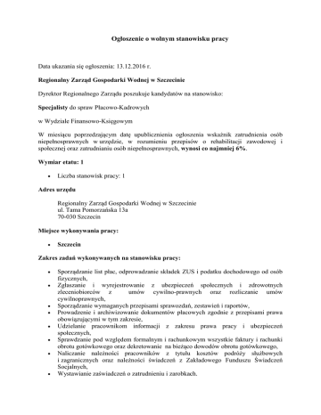 Ogłoszenie o wolnym stanowisku pracy Data ukazania się ogłoszenia: 13.12.2016 r. Regionalny Zarząd Gospodarki Wodnej w Szczecinie Dyrektor Regionalnego Zarządu poszukuje kandydatów na stanowisko: Specjalisty do spraw Płacowo-Kadrowych w Wydziale Finansowo-Księgowym W miesiącu poprzedzającym datę upublicznienia ogłoszenia wskaźnik zatrudnienia osób niepełnosprawnych w urzędzie, w rozumieniu przepisów o rehabilitacji zawodowej i społecznej oraz zatrudnianiu osób niepełnosprawnych, wynosi co najmniej 6%. Wymiar etatu: 1 • Liczba stanowisk pracy: 1 Adres urzędu Regionalny Zarząd Gospodarki Wodnej w Szczecinie ul. Tama Pomorzańska 13a 70-030 Szczecin Miejsce wykonywania pracy: • Szczecin Zakres zadań wykonywanych na stanowisku pracy: • • • • • • • • Sporządzanie list płac, odprowadzanie składek ZUS i podatku dochodowego od osób fizycznych, Zgłaszanie i wyrejestrowanie z ubezpieczeń społecznych i zdrowotnych zleceniobiorców z umów cywilno-prawnych oraz rozliczanie umów cywilnoprawnych, Sporządzanie wymaganych przepisami sprawozdań, zestawień i raportów, Prowadzenie i archiwizowanie dokumentów płacowych zgodnie z przepisami prawa obowiązującymi w tym zakresie, Udzielanie pracownikom informacji z zakresu prawa pracy i ubezpieczeń społecznych, Sprawdzanie pod względem formalnym i rachunkowym wszystkie faktury i rachunki obrotu gotówkowego oraz dekretowanie na bieżąco dowodów obrotu gotówkowego, Naliczanie należności pracowników z tytułu kosztów podróży służbowych i zagranicznych oraz należności świadczeń z Zakładowego Funduszu Świadczeń Socjalnych, Wystawianie zaświadczeń o zatrudnieniu i zarobkach. Warunki pracy Warunki dotyczące charakteru pracy na stanowisku i sposobu wykonywania zadań • • • • Praca biurowa w siedzibie Regionalnego Zarządu Gospodarki Wodnej w Szczecinie, Większość czynności wykonywana jest w pozycji siedzącej, Obsługa komputera powyżej 4 godzin na dobę, Czas pracy – zgodnie z przepisami ustawy o służbie cywilnej. Miejsce i otoczenie organizacyjno-techniczne stanowiska pracy • • Siedziba Urzędu znajduje się w Szczecinie przy ul. Tama Pomorzańska 13a i jest budynkiem wielokondygnacyjnym, niewyposażonym w windy. Podstawowe wyposażenie stanowiska to: zestaw komputerowy, meble biurowe oraz elektryczne urządzenia biurowe. Wymagania związane ze stanowiskiem pracy niezbędne • wykształcenie: minimum średnie o profilu ekonomicznym lub administracyjnym • doświadczenie zawodowe/staż pracy: : min. 3 lata doświadczenia zawodowego na stanowisku związanym z obsługą płacowo-kadrową i księgową • pozostałe wymagania niezbędne: - znajomość przepisów: prawa pracy, podatkowego, ubezpieczeń społecznych oraz aktualnych przepisów wykonawczych, - wiedza i praktyczna znajomość prawidłowego naliczania wynagrodzeń, - sprawna obsługa programów kadrowo-płacowych (np. Płatnik, Symfonia, QNT itp.) - dobra znajomość i obsługa pakietu programu Microsoft Office i Excel, wymagania dodatkowe: - znajomość przepisów Ustawy o służbie cywilnej, - skrupulatność i dokładność w działaniu, - umiejętność interpretacji przepisów, - doskonała organizacja pracy i umiejętność pracy pod presją czasu, - wysokie umiejętności interpersonalne i chęć pracy w zespole, - samodzielność, komunikatywność, odpowiedzialność, - rzetelność, terminowość i sumienność. Wymagane dokumenty i oświadczenia: • • • • • • • życiorys i list motywacyjny oświadczenie kandydata o wyrażeniu zgody na przetwarzanie danych osobowych do celów rekrutacji oświadczenie kandydata o korzystaniu z pełni praw publicznych oświadczenie kandydata o nieskazaniu prawomocnym wyrokiem za umyślne przestępstwo lub umyślne przestępstwo skarbowe kopie dokumentów potwierdzających wykształcenie kopia dokumentu potwierdzającego posiadanie polskiego obywatelstwa lub oświadczenie o posiadaniu obywatelstwa polskiego kopie dokumentów potwierdzających doświadczenie zawodowe. Termin składania dokumentów : 24.12.2016 r. (do końca dnia, liczy się data stempla pocztowego) Miejsce składania dokumentów: Regionalny Zarząd Gospodarki Wodnej Tama Pomorzańska 13a 70-030 Szczecin z dopiskiem "Oferta pracy: : EK/EW-S/1" Inne informacje: Oferty należy składać w zaklejonych kopertach. Dokumenty aplikacyjne powinny zawierać oświadczenia o treści wskazanej w ogłoszeniu, własnoręcznie podpisane i opatrzone aktualną datą. List motywacyjny powinien być podpisany własnoręcznym podpisem. Zakwalifikowani kandydaci zostaną powiadomieni o terminie dalszych etapów rekrutacji. Prosimy o podanie możliwie pełnych danych kontaktowych – adres do korespondencji, adres e-mail, numer telefonu. Nie zwracamy przesłanych dokumentów aplikacyjnych. Oferty osób wskazanych w protokole z naboru jako najlepsze, a nie zakwalifikowanych do zatrudnienia niszczone są komisyjnie po upływie 3 miesięcy od zatrudnienia osoby wyłonionej w postępowaniu. Proponowane wynagrodzenie: 2.500 zł. brutto. Dodatkowe informacje można uzyskać pod nr tel.: 91/ 44-11-204 p. Jolanta Bukowska. …………………………………….. (podpis Kierownika Wydziału/Zespołu)