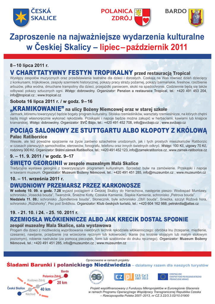 ČESKÁ SKALICE POLANICA ZDRÓJ BARDO Zaproszenie na najważniejsze wydarzenia kulturalne w Českiej Skalicy – lipiec – październik 2011 8 – 10 lipca 2011 r. V CHARYTATYWNY FESTYN TROPIKALNY przed restauracją Tropical Występy zespołów muzycznych oraz przedstawienia teatralne dla dzieci i dorosłych. Czekają na Was również dzień dziecięcy z konkursami, trójkołowce, zespoły szermierki historycznej, pokazy pracy straży pożarnej, pokazy barmańskie, fireshow, rzeźbienie arbuzów, piłka wodna, dmuchane trampoliny dla dzieci, przejażdki parowcem, skoki na spadochronie. Codziennie będą się także odbywać pokazy sztucznych ogni. Wstęp: dobrowolny. Organizator: Penzion a restaurace Tropical, tel.: +420 491 453 204, [email protected] ; www.tropical.cz Sobota 16 lipca 2011 r. / w godz. 9 – 16 „KRAMIKOWANIE” na ulicy Bożeny Niemcowej oraz w starej szkołe Jarmark, któremu towarzyszyć będzie bogaty program kulturalny. Stoiska rzemieślników, warsztaty rzemieślnicze, na których chętni będą mogli własnoręcznie wykonać rękodzieła. Przekąski i napoje będzie można zakupić w herbaciarni, kawiarni lub knajpce kramarskiej. Wstęp: dobrowolny. Organizator: SVČ Bájo, tel.: +420 491 452 708, [email protected] ; www.svcbajo.cz POCIĄG SALONOWY ZE STUTTGARTU ALBO KŁOPOTY Z KRÓLOWĄ Pałac Ratiborzice Wesołe, ale też poważne spojrzenie na życie zarówno szlachetnie urodzonych, jak i tych prostych mieszkańców Ratiborzic w czasach pierwszych samochodów, sterowców, fonografu, telefonu oraz innych świetnych odkryć. Wstęp: 100 Kč, ulgowy 70 Kč, rodzinny 300 Kč. Organizator: Státní zámek Ratibořice, tel.: +420 491 452 123, [email protected] , www.zamek-ratiborice.cz 9. – 11. 9. 2011 / w godz. 9–17 ŚWIĘTO GEORGINII w zespole muzealnym Malá Skalice Tradycyjna wystawa georginii z towarzyszącym programem kulturalnym. Sprzedaż bulw na zamówienie. Przekąski i napoje w kawiarni muzeum. Organizator: Muzeum Boženy Němcové, tel.: +420 491 451 285, [email protected] ; www.muzeumbn.cz 10. – 11. września 2011 r. DWUDNIOWY PRZEMARSZ PRZEZ KARKONOSZE W sobotę 10. 09. o godz. 7.28 wyjazd pociągiem z Českiej Skalicy do Harrachova, następnie pieszo: Wodospad Mumlawy, schronisko „Vosecká bouda”, Twarożnik, Śnieżne Kotły, Czeskie Kamienie, Śląskie Kamienie, schronisko „Petrova bouda”. Niedziela 11. 09.: schronisko „Špindlerova bouda”, Słonecznik, byłe schronisko „Obří bouda”, Snieżka, szczyt Růžová hora, schronisko „Růžohorky”, Pec pod Sněžkou. Organizator: Klub českých turistů, tel.: +420 604 162 988, [email protected] 19. - 21. 10. i 24. - 25. 10. 2011 r. RZEMIOSŁA WŁÓKIENNICZE ALBO JAK KRECIK DOSTAŁ SPODNIE zespół muzealny Mala Skalice, sala wystawowa Progam dla dzieci z możliwością wypróbowania niektórych technik rękodzieła włókienniczego: obróbka lnu (trzepanie, międlenie, czesanie), nawijanie, przędzenie (na wrzecionie ręcznym lub kołowrocie), tkanie (na krośnie stojącym lub małym stołowym poziomym), robienie nadruków (za pomocą pieczątek, form lub szablonów do druku ręcznego). Organizator: Muzeum Boženy Němcové, tel.: +420 491 451 285, [email protected] ; www.muzeumbn.cz Opracowane w ramach projektu Śladami Barunki i polanickiego Niedźwiedzia – działamy razem dla naszych turystów Bardo Polanica Zdrój Kudowa Zdrój 20 km Česká Skalice Náchod 40 km EVROPSKÁ UNIE EVROPSKÝ FOND PRO REGIONÁLNÍ ROZVOJ PŘEKRAČUJEME HRANICE Projekt współfinansowany z Funduszu Mikroprojektów w Euroregionie Glacensis w ramach Programu Operacyjnego Współpracy Transgranicznej Republika Czeska – Rzeczpospolita Polska 2007–2013, nr CZ.3.22/3.3.02/10.01900