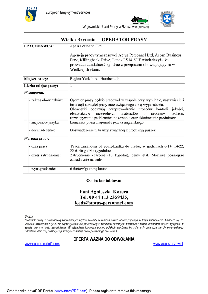European Employment Services Wojewódzki Urząd Pracy w Rzeszowie (Katowice) Wielka Brytania – OPERATOR PRASY PRACODAWCA: Aptus Personnel Ltd Agencja pracy tymczasowej Aptus Personnel Ltd, Acorn Business Park, Killingbeck Drive, Leeds LS14 6UF oświadczyła, że prowadzi działalność zgodnie z przepisami obowiązującymi w Wielkiej Brytanii. Miejsce pracy: Region Yorkshire i Humberside Liczba miejsc pracy: 1 Wymagania: - zakres obowiązków: - znajomość języka: Operator prasy będzie pracował w zespole przy wymianie, nastawianiu i instalacji narzędzi prasy oraz związanego z nią wyposażenia. Obowiązki obejmują przeprowadzanie procedur kontroli jakości, identyfikację niezgodnych materiałów i procesów izolacji, rozwiązywanie problemów, pakowanie oraz składowanie produktów. komunikatywna znajomość języka angielskiego - doświadczenie: Doświadczenie w branży związanej z produkcją puszek. Warunki pracy: - czas pracy: - okres zatrudnienia: - wynagrodzenie: Praca zmianowa od poniedziałku do piątku, w godzinach 6-14, 14-22, 22-6. 40 godzin tygodniowo. Zatrudnienie czasowe (13 tygodni), pełny etat. Możliwe późniejsze zatrudnienie na stałe. 6 funtów/godzinę brutto Osoba kontaktowa: Pani Agnieszka Kozera Tel. 00 44 113 2359435, [email protected] Uwaga: Stosunek pracy z pracodawcą zagranicznym będzie zawarty w ramach prawa obowiązującego w kraju zatrudnienia. Oznacza to, że wszelkie roszczenie z tytułu nie wywiązywania się pracodawcy z warunków zawartych w umowie o pracę, dochodzić można wyłącznie w sądzie pracy w kraju zatrudnienia. W sytuacjach losowych pomoc polskich placówek konsularnych ogranicza się do ewentualnego udzielenia doraźnej pomocy ( np. kredytu na zakup biletu powrotnego do Polski ). OFERTA WAŻNA DO ODWOŁANIA www.europa.eu.int/eures Created with novaPDF Printer (www.novaPDF.com). Please register to remove this message. www.wup-rzeszow.pl