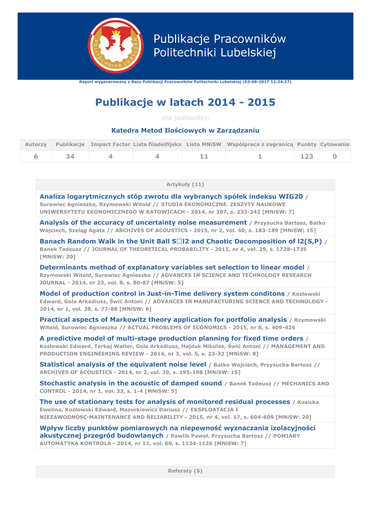 Raport wygenerowany z Bazy Publikacji Pracowników Politechniki Lubelskiej (03-08-2017 12:34:27) Publikacje w latach 2014 - 2015 dla jednostki: Katedra Metod Ilościowych w Zarządzaniu Autorzy Publikacje 6 34 Impact Factor Lista filadelfijska 4 4 Lista MNiSW Współpraca z zagranicą Punkty Cytowania 11 1 123 0 Artykuły (11) Analiza logarytmicznych stóp zwrotu dla wybranych spółek indeksu WIG20 / Surowiec Agnieszka, Rzymowski Witold // STUDIA EKONOMICZNE. ZESZYTY NAUKOWE UNIWERSYTETU EKONOMICZNEGO W KATOWICACH - 2014, nr 207, s. 233-242 [MNiSW: 7] Analysis of the accuracy of uncertainty noise measurement / Przysucha Bartosz, Batko Wojciech, Szeląg Agata // ARCHIVES OF ACOUSTICS - 2015, nr 2, vol. 40, s. 183-189 [MNiSW: 15] Banach Random Walk in the Unit Ball S⊂l2 and Chaotic Decomposition of l2(S,P) / Banek Tadeusz // JOURNAL OF THEORETICAL PROBABILITY - 2015, nr 4, vol. 29, s. 1728-1735 [MNiSW: 20] Determinants method of explanatory variables set selection to linear model / Rzymowski Witold, Surowiec Agnieszka // ADVANCES IN SCIENCE AND TECHNOLOGY RESEARCH JOURNAL - 2014, nr 23, vol. 8, s. 80-87 [MNiSW: 5] Model of production control in Just-in-Time delivery system conditons / Kozłowski Edward, Gola Arkadiusz, Świć Antoni // ADVANCES IN MANUFACTURING SCIENCE AND TECHNOLOGY 2014, nr 1, vol. 38, s. 77-88 [MNiSW: 6] Practical aspects of Markowitz theory application for portfolio analysis / Rzymowski Witold, Surowiec Agnieszka // ACTUAL PROBLEMS OF ECONOMICS - 2015, nr 8, s. 409-426 A predictive model of multi-stage production planning for fixed time orders / Kozłowski Edward, Terkaj Walter, Gola Arkadiusz, Hajduk Mikulas, Świć Antoni // MANAGEMENT AND PRODUCTION ENGINEERING REVIEW - 2014, nr 3, vol. 5, s. 23-32 [MNiSW: 8] Statistical analysis of the equivalent noise level / Batko Wojciech, Przysucha Bartosz // ARCHIVES OF ACOUSTICS - 2014, nr 2, vol. 39, s. 195-198 [MNiSW: 15] Stochastic analysis in the acoustic of damped sound / Banek Tadeusz // MECHANICS AND CONTROL - 2014, nr 1, vol. 33, s. 1-4 [MNiSW: 5] The use of stationary tests for analysis of monitored residual processes / Kosicka Ewelina, Kozłowski Edward, Mazurkiewicz Dariusz // EKSPLOATACJA I NIEZAWODNOSC-MAINTENANCE AND RELIABILITY - 2015, nr 4, vol. 17, s. 604-609 [MNiSW: 20] Wpływ liczby punktów pomiarowych na niepewność wyznaczania izolacyjności akustycznej przegród budowlanych / Pawlik Paweł, Przysucha Bartosz // POMIARY AUTOMATYKA KONTROLA - 2014, nr 12, vol. 60, s. 1124-1126 [MNiSW: 7] Referaty (5) Analiza statystyczna wyników pomiarów poziomów w ruchu drogowym / Przysucha Bartosz, Batko Wojciech // W: XLI Ogólnopolskie Sympozjum, Diagnostyka Maszyn,poświęcone Pamięci Prof.dr.hab.inż.Zbigniewa Engela, 03.-07.marca 2014,Wisła : [książka streszczeń] - 2014, s. 32-32 Analysis of asymmetry of probability distributions of the sound level measurement results / Batko Wojciech, Przysucha Bartosz, Tekiel Mariusz // W: 7th Forum Acusticum, 7 -12 września 2014, Kraków - 2014 Analysis of the accuracy of uncertainty in noise measurements / Przysucha Bartosz, Batko Wojciech, Szeląg Agata // W: 7th International Symposium on Environmental Effects on Buildings and People. Actions, Influences, interaction, Discomfort, 20-22 October 2014, Krakow - 2014, s. 115-116 Efekt wygładzania wyników pomiarów poziomów dźwięku w monitoringu akustycznym / Przysucha Bartosz, Batko Wojciech, Szeląg Agata // W: 1 Międzynarodowa Konferencja Naukowa " Nauka w Technice, Środowisku, Medycynie i Sporcie" oraz XI Ogólnopolska Konferencja " Problemy Naukowo-Techniczne w wyczynowym Sporcie Żeglarskim", 6-16 maj 2015,pokład STS 'Pogoria" Palermo-Civitavecchia - 2015, s. 61-62 Wpływ liczby puntków pomiarowych na niepewność wyznaczania izolacyjności akustycznej przegród budowlanych / Pawlik Paweł, Przysucha Bartosz // W: X Konferencja Naukowo Techniczna " Podstawowe Problemy Metrologii" - PPM '14, 15-18 czerwca 2014, Kościelisko 2014, s. 198-201 Monografie (2) Analiza i identyfikacja szeregów czasowych / Kozłowski Edward / .- Lublin: Politechnika Lubelska , 2015, 272 s. Probability in action / Banek Tadeusz, Kozłowski Edward / [Red:] Banek Tadeusz, Kozłowski Edward .- Lublin: Politechnika Lubelska , 2014, 134 s. Rozdziały (16) Analiza promocyjnych taryf przewozowych w regionalnym kolejowym ruchu pasażerskim w województwie lubelskim / Kowalik Przemysław // W: Region i edukacja a procesy rozwojowe, [Red:] Bojar Ewa, Żminda Tomasz, Bis Jakub - Lublin: Politechnika Lubelska , 2014, s. 48-59 Analysis of average exchange rates / Rzymowski Witold, Surowiec Agnieszka // W: Probability in action, [Red:] Banek Tadeusz, Kozłowski Edward - Lublin: Politechnika Lubelska, 2014, s. 51-61 Averaging discrete-time signals having finite energy / Banek Tadeusz, Zapała Tadeusz // W: Probability in action. Vol. 2, [Red:] Łagodowski Zbigniew - Lublin: Politechnika Lubelska, 2015, s. 7-21 Bluff in games / Rzymowski Witold, Warowny Tomasz // W: Probability in action, [Red:] Banek Tadeusz, Kozłowski Edward - Lublin: Politechnika Lubelska, 2014, s. 63-71 A causal construction of diffusion processes / Banek Tadeusz // W: Probability in action, [Red:] Banek Tadeusz, Kozłowski Edward - Lublin: Politechnika Lubelska , 2014, s. 9-17 Coupling in dynamical systems and its propabilistic consequences / Banek Tadeusz, Kozłowski Edward // W: Probability in action, [Red:] Banek Tadeusz, Kozłowski Edward - Lublin: Politechnika Lubelska, 2014, s. 19-30 Deterministic versus stochastic in the free horizon LQG problem / Banek Tadeusz, Kozłowski Edward // W: Aktualne problemy automatyki i robotyki, [Red:] Malinowski Krzysztof, Józefczyk Jerzy, Świątka Jerzy - Warszawa: Akademicka Oficyna Wydzwnicza EXIT, 2014, s. 94-101 Differences between optimal routes for linear quadratic problems with fixed and optimally stopped horizon / Kozłowski Edward // W: Probability in action. Vol. 2, [Red:] Łagodowski Zbigniew - Lublin: Politechnika Lub