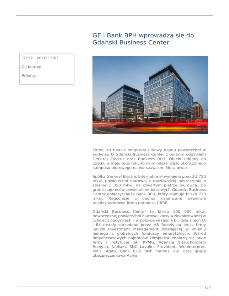 GE i Bank BPH wprowadzą się do Gdański Business Center 10:32 2016-12-01 CIJ Journal Přílohy: Firma HB Reavis podpisała umowy najmu powierzchni w budynku D Gdański Business Center z polskim oddziałem General Electric oraz Bankiem BPH. Obiekt oddany do użytku w maju tego roku to najmłodsza część ukończonego kampusu biurowego na warszawskim Muranowie. Spółka General Electric International wynajęła ponad 2 750 mkw. powierzchni biurowej z możliwością poszerzenia o kolejne 1 350 mkw. na czwartym piętrze biurowca. Do grona najemców powierzchni biurowych Gdański Business Center dołączył także Bank BPH, który zajmuje blisko 730 mkw. Negocjacje z oboma najemcami wspierała międzynarodowa firma doradcza CBRE. Gdański Business Center to blisko 100 000 mkw. nowoczesnej powierzchni biurowej klasy A zlokalizowanej w czterech budynkach – w połowie września br. dwa z nich (A i B) zostały sprzedane przez HB Reavis na rzecz firmy Savills Investment Management działającej w imieniu jednego z globalnych funduszy emerytalnych. Wśród dotychczasowych najemców kompleksu znalazły się takie firmy i instytucje jak: KPMG, Agencja Nieruchomości Rolnych, Nielsen, SNC Lavalin, Provident, WebInterpret, KMD, Agito, Bank BGŻ BNP Paribas S.A. oraz grupa ubezpieczeniowa Aviva. 1/1