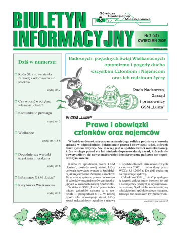 Nr 2 (41) KWIECIEŃ 2009 ISSN 1640-114X Dziś w numerze: ❐ Ruda Śl. - nowe stawki za wodę i odprowadzenie ścieków. Radosnych, pogodnych Świąt Wielkanocnych optymizmu i pogody ducha wszystkim Członkom i Najemcom oraz ich rodzinom życzy Rada Nadzorcza, Zarząd i pracownicy GSM „Luiza” czytaj str. 2 ❐ Czy wnosić o odrębną własność lokalu? ❐ Komunikat o przetargu W GSM ,,Luiza” czytaj str. 3 ❐ Wielkanoc czytaj str. 4-5-6 ❐ Dogodniejsze warunki uzyskania mieszkania czytaj str. 6 ❐ Informator GSM „Luiza” ❐ Krzyżówka Wielkanocna czytaj str. 8 Prawa i obowiązki członków oraz najemców W każdym demokratycznym systemie jego solidną podstawę stanowią spisane w odpowiednim dokumencie prawa i obowiązki ludzi, których tenże system dotyczy. Nie inaczej jest w spółdzielczości mieszkaniowej, która w ciągu ponad stu lat istnienia dopracowała się zasad, których nie powstydziłoby się nawet najbardziej demokratyczne państwo we współczesnym świecie. Każda ze spółdzielń, także GSM „Luiza”, posiada swój statut, który uchwala najwyższa władza w Spółdzielni jakim jest Walne Zebranie Członków. To w nim są spisane prawa i obowiązki członków oraz najemców zamieszkujących w zasobach naszej Spółdzielni. W statucie GSM „Luiza” prawa i obowiązki członków spisane są w rozdziale II, paragrafach 8 i 9. W naszej Spółdzielni obowiązuje statut, który został uaktualniony zgodnie z ustawą o spółdzielniach mieszkaniowych z czerwca 2007 r. i uchwalony przez WZCz 8.11.2007 r. Do dziś czeka on na rejestrację sądową. Członkom GSM „Luiza” przysługuje szeroki zakres praw bowiem to oni a nie najemcy (którym są wynajmowane w naszej Spółdzielni mieszkania) są właścicielami spółdzielczego majątku. Dlatego też członkom (w przeciwieńDokończenie na str. 2 Dokończenie ze str. 1 stwie do najemców) przysługuje m.in. czynne i bierne prawo wyborcze do organów spółdzielni, prawo zgłaszania wniosków w sprawach związanych z jej działalnością, prawo do udziału z głosem decydującym na zgromadzeniach lub zebraniach, prawo zwołania Walnego Zgromadzenia i zamieszczenia w porządku obrad określonych spraw. Prawa i obowiązki członków oraz najemców Na członkach Spółdzielni ciążą także liczne obowiązki, m.in. są oni zobowiązani wnieść wkład mieszkaniowy lub ponieść koszty ustanowienia prawa odrębnej własności lokalu, ponosić wydatki związane z utrzymaniem jego lokalu i uczestniczyć w pokrywaniu peł nych kosz tów eksploatacji zgodnie z regulaminem uchwalonym przez Radę Nadzorczą, a także uiszczać regularnie wymagane należ no ści na po kry cie kosztów eksploatacyjnych oraz spłatę kredytu wraz z od set ka mi w terminie do 10-go każdego miesiąca. Członek Spółdzielni jest zobowiązany uczestniczyć w kosztach budowy, eksploatacji i utrzyma nia nie ru cho mo ści spółdzielczych, działalności społecznej, oświaNajbardziejzasobnew lokalemieszkalnesąbudynkiznajdutowej i kulturalnej oraz jące się w Rudzie Śląskiej przy ul. Piernikarczyka 6 - 110 mieszkańorazprzy ul.Ks.Niedzieli 59-59F(nazdjęciu)-105 zo bo wią za niach spół dzielni z innych tytumieszkań. 2 łów poprzez wniesienie wkładu na zasadach określonych w umowie i statucie oraz przez uiszczanie opłat związanych z używaniem lokalu, a także w zobowiązaniach spółdzielni z innych tytułów. Ponadto musi on uzupełnić wkład mieszkaniowy lub budowlany w wypadku modernizacji budynku, w którym członkowi przysługuje spółdzielcze prawo do lokalu. Za modernizację uważa się trwałe ulepszenie (unowocześnienie) istniejącego budynku lub lokalu, przez co zwiększa się wartość użytkowa budynku lub lokalu. PraWa i oboWiązki NajemcóW Znaczącą część mieszkańców naszych zasobów stanowią najemcy. Oni także posiadają spisane w statucie i umowie najmu swoje prawa oraz obowiązki. Mówi o nich paragraf 32, pkt. 3,4,5. statutu. O prawach i obowiązkach najemców mówi pkt. 3 par. 32 cyt. „Prawai obowiązkinajemców, wysokość czynszu i innych opłat,czastrwanianajmu,przedmiot najmu,określająpostanowieniaumowy,którązawieraz najemcąZarząd Spółdzielni”.W pkt. 5 ww. paragrafu czytamy, że „W sprawachnieobjętychniniejszymstatutemi umową majązastosowanieprzepisyKodeksu cywilnego,ustawyo ochroniepraw lokatorów, mieszkaniowym zasobie gminyorazo zmianieKodeksucywilnego”. W umowie najmu, w par. 3, pkt. 1 czytamy, że „Przed zasiedleniem mieszkania najemca zobowiązany jestdo uiszczeniakaucji,którapodlegarozliczeniupo zakończeniustosunkunajmu–na zasadachustalonych przez przepisy obowiązujące w dacierozwiązaniaumowynajmu. Spółdzielniazastrzegasobieprawo potrąceniaz kwotyzabezpieczenianależnościz tytułuzaległościczynszowych”. BIULETYN INFORMACYJNY GSM ,,LUIZA” NR 2 (41) 2009 ● WyjaśniaMy WątPLiWośCi CzłonkóW SPółdzieLni... Czy wnosić o odrębną własność lokalu? NajwyższymibudynkamiGSM„Luiza”sąbudynki 11.kondygnacyjnewys.ok. 33mpołożoneprzy ul.Banachiewicza 17w Zabrzu(na zdjęciu)orazw RudzieŚląskiejprzy ul.Paderewskiego 17/17a-KątyJankowskie. W par. 3 w pkt. 7, 8 i 9 ww. umowy najmu określone są obowiązki najemcy w odniesieniu do uiszczania czynszu. Natomiast w par. 5 stwierdza się, że „zakres obowiązków stron umowywynikającychz eksploatacjilokaluokreślaRegulaminużytkowania lokalui porządkudomowego”. W kolejnych paragrafach umowy najmu określone są sytuacje odnoszące się do: podnajmu części lub całości lokalu wynajmowanego, udostępnienia lokalu w określonych przypadkach, wprowadzania w wynajmowanym lokalu ulepszeń, trybu i warunków zakończenia najmu, w tym rozliczeń pomiędzy Spółdzielnią a najemcą. koMUnikat Dnia 31 marca br. w siedzibie GSm „Luiza” odbył się przetarg na lokatorskie prawo do lokalu. Do przetargu Spółdzielnia zaoferowała 10 mieszkań typu M-2 i M-3 położonych na terenie Zabrza i Rudy Ś