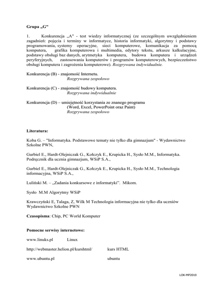 Grupa „G" 1. Konkurencja „A" - test wiedzy informatycznej (ze szczególnym uwzględnieniem zagadnień: pojęcia i terminy w informatyce, historia informatyki, algorytmy i podstawy programowania, systemy operacyjne, sieci komputerowe, komunikacja za pomocą komputera, grafika komputerowa i multimedia, edytory tekstu, arkusze kalkulacyjne, podstawy obsługi baz danych, arytmetyka komputera, budowa komputera i urządzeń peryferyjnych, zastosowania komputerów i programów komputerowych, bezpieczeństwo obsługi komputera i zagroŜenia komputerowe). Rozgrywana indywidualnie. Konkurencja (B) - znajomość Internetu. Rozgrywana zespołowo Konkurencja (C) - znajomość budowy komputera. Rozgrywana indywidualnie Konkurencja (D) – umiejętność korzystania ze znanego programu (Word, Excel, PowerPoint oraz Paint) Rozgrywana zespołowo Literatura: Koba G. – "Informatyka. Podstawowe tematy nie tylko dla gimnazjum" - Wydawnictwo Szkolne PWN, Gurbiel E., Hardt-Olejniczak G., Kołczyk E., Krupicka H., Sysło M.M., Informatyka. Podręcznik dla ucznia gimnazjum, WSiP S.A., Gurbiel E., Hardt-Olejniczak G., Kołczyk E., Krupicka H., Sysło M.M., Technologia informacyjna, WSiP S.A., Luliński M. – „Zadania konkursowe z informatyki”. Mikom. Sysło M.M Algorytmy WSiP Krawczyński E, Talaga, Z, Wilk M Technologia informacyjna nie tylko dla uczniów Wydawnictwo Szkolne PWN Czasopisma: Chip, PC World Komputer Pomocne serwisy internetowe: www.linuks.pl Linux http://webmaster.helion.pl/kurshtml/ kurs HTML www.ubuntu.pl ubuntu LOK-MP2010 Grupa „S" 1. Konkurencja „A" — test wiedzy informatycznej (ze szczególnym uwzględnieniem zagadnień: pojęcia i terminy informatyczne, historia informatyki i tendencje rozwojowe, algorytmika, języki programowania, systemy operacyjne, sieci komputerowe, transmisje cyfrowe, grafika komputerowa i multimedia, edytory tekstu, bazy danych, arkusze kalkulacyjne, oprogramowanie narzędziowe, reprezentacja danych i przetwarzanie informacji w komputerze, architektura i działanie komputera oraz urządzeń peryferyjnych, zastosowania komputerów i programów komputerowych, prawne, etyczne i społeczne aspekty informatyki). Rozgrywana indywidualnie. Konkurencja (B) - znajomość Internetu. Rozgrywana zespołowo Konkurencja (C) - znajomość budowy komputera. Rozgrywana indywidualnie Konkurencja (D) - umiejętność programowania (Pascal). Rozgrywana zespołowo Literatura: GraŜyna Koba – " Technologia informacyjna dla szkół ponadgimnazjalnych" - Wydawnictwo „MIGRA”, Gurbiel E., Hardt-Olejniczak G., Kołczyk E., Krupicka H., Sysło M.M., technologia informacyjna, WSiP S.A.. Sysło M.M Algorytmy WSiP Krawczyński E, Talaga, Z, Wilk M Technologia informacyjna nie tylko dla uczniów Wydawnictwo Szkolne PWN Czasopisma: Chip, PC World Komputer Pomocne serwisy internetowe: www.linuks.pl Linux www.damnsmalllinux.org Damn Small Linux webmaster.helion.pl/kurshtml/ kurs HTML www.linux-educd.pl/ Linux-EduCD www.ubuntu.pl ubuntu LOK-MP2010