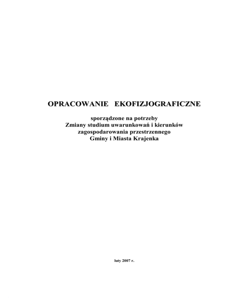 OPRACOWANIE EKOFIZJOGRAFICZNE sporządzone na potrzeby Zmiany studium uwarunkowań i kierunków zagospodarowania przestrzennego Gminy i Miasta Krajenka luty 2007 r. Opracowanie ekofizjograficzne składa się z: 1) części opisowej, 2) części kartograficznej, obejmujące następujące mapy w skali 1:25 000: - Rzeźba terenu, hydrografia, - Litologia, hydrologia, - Elementy środowiska przyrodniczego, kulturowego i ich ochrona, - Ogólna ocen przydatności terenów. autor opracowania: dr Andrzej Kucharczyk EKOFIZJOGRAFIA do Zmiany studium ... gm. Krajenka Spis treści 1. Wstęp 2. Podstawy prawne 3. Postępowanie metodyczne 4. Położenie 5. Charakterystyka wybranych elementów środowiska przyrodniczego 6. Ogólna diagnoza stanu i funkcjonowania środowiska przyrodniczego 7. Wstępna prognoza dalszych zmian zachodzących w środowisku przyrodniczym 8. Ogólna ocena przydatności terenów dla różnych sposobów zagospodarowania 9. Rola elementów środowiska przyrodniczego w kształtowaniu struktury funkcjonalnoprzestrzennej gminy 10. Materiały źródłowe 3 EKOFIZJOGRAFIA do Zmiany studium ... gm. Krajenka 1 . Wst ęp Opracowanie ekofizjograficzne w skali 1:25 000 zostało wykonane na potrzeby sporządzenia Zmiany studium uwarunkowań i kierunków zagospodarowania przestrzennego Gminy i Miasta Krajenka. Zrównoważony rozwój i ochrona środowiska to jedne z podstawowych zasad, które powinny być przestrzegane przy przyszłym zagospodarowaniu gminy. Zasady te powinny być realizowane między innymi poprzez: a) zapewnienie warunków utrzymania równowagi przyrodniczej i racjonalnej gospodarki zasobami środowiska; b) zachowanie prawidłowych proporcji przy przeznaczaniu terenów na poszczególne cele oraz przy określaniu zadań związanych z ich zagospodarowaniem, pozwalające na zachowanie lub przywrócenie na nich równowagi przyrodniczej i prawidłowych warunków życia; c) określenie sposobów zagospodarowania obszarów zdegradowanych w wyniku działalności człowieka i klęsk żywiołowych. Wyżej wymienione wymagania w stosunku do Zmiany studium, powinny być określone na podstawie niniejszego opracowania ekofizjograficznego. Realizacja wymienionego celu będzie realizowana poprzez przeprowadzenie na obszarze gminy Krajenka diagnozy stanu i funkcjonowania poszczególnych elementów środowiska przyrodniczego, określenie wstępnej prognozy dalszych ich zmian, a w dalszej kolejności poprzez przedstawienie ogólnej oceny przydatności terenów dla różnych sposobów zagospodarowania i ich roli w kształtowaniu struktury funkcjonalno-przestrzennej gminy. 2. Podstawy prawne Obowiązek prawny sporządzenia opracowania ekofizjograficznego dla Zmiany studium uwarunkowań i kierunków zagospodarowania przestrzennego Gminy i Miasta Krajenka wynika z art. 72 ust. 4 i 5 ustawy z dnia 27 kwietnia 2001 r. – Prawo ochrony środowiska (Dz. U. Nr 62 poz. 627, z późniejszymi zmianami, j.t. z dnia 4 lipca 2006 r., Dz. U. Nr 129 poz. 902). Zakres opracowania określa Rozporządzenie Ministra Środowiska z dnia 9 września 2002 r. w sprawie opracowań ekofizjograficznych (Dz. U. Nr 155 poz.1298). 4 EKOFIZJOGRAFIA do Zmiany studium ... 3. gm. Krajenka Postępowanie metodyczne Postępowanie metodyczne niniejszego opracowania zostało podzielone na cztery etapy: a) prace kameralne polegające na przestudiowaniu między innymi następujących materiałów archiwalnych: - materiałów planistycznych – głównie miejscowych planów zagospodarowania przestrzennego oraz dotychczas obowiązującego Studium uwarunkowań i kierunków zagospodarowania przestrzennego Gminy i Miasta Krajenka, - map topograficznych w skalach 1:10 000 i 1:25 000 oraz map zasadniczych w skalach 1:1000, - mapy kompleksów glebowo-rolniczych w skali 1:5 000, - map hydrograficznych w skali 1:50 000, - map geośrodowiskowych w skali 1:50 000, - map hydrogeologicznych w skali 1:50 000, - map sozologicznych w skali 1:50 000, - dokumentacji geologicznych i geotechnicznych, - raportów o stanie środowiska WIOŚ, - prognoz oddziaływania ustaleń miejscowych planów zagospodarowania przestrzennego na środowisko przyrodnicze, - programów ochrony przyrody, - innych opracowań branżowych i naukowych; b) wizję w terenie, inwentaryzację przyrodniczą i urbanistyczną umożliwiającą weryfikację uzyskanych wcześniej danych archiwalnych w zakresie aktualizacji stanu poszczególnych elementów środowiska przyrodniczego oraz sposobu zagospodarowania; c) opracowanie tekstowe ujmujące diagnozę stanu i funkcjonowania elementów środowiska przyrodniczego, zidentyfikowanych w granicach opracowania, w którym znalazła się ocena ogólna terenów dla różnych sposobów użytkowania; d) przedstawienie problematyki uwarunkowań ekofizjograficznych na 4 planszach tematycznych wykonanych na aktualnej kopii mapy topograficznej w skali 1:50 000, zmienionej do skali 1:25 000, ujmujących w sposób syntetyczny zagadnienia ujęte w części tekstowej. 5 EKOFIZJOGRAFIA do Zmiany studium ... gm. Krajenka 4. Położenie Gmina Krajenka położona jest w północnej części województwa wielkopolskiego, w południowej części powiatu złotowskiego. W obrębie powiatu, gmina Krajenka graniczy od północnego zachodu – z gminą Tarnówka, a od północnego wschodu - z gminą Złotów. Od strony południowej gmina Krajenka graniczy z gminami powiatu pilskiego: Szydłowem, Piłą, Kaczorami i Wysoką. Łączna powierzchnia gminy wynosi 19118 ha, w tym miasta 376 ha1. Gminę Krajenka składa się z 20 miejscowości: w tym 1 miasta, 16 wsi tworzących sołectwa oraz 2 integralnych części miejscowości i 1 osady. Według podziału fizycznogeograficznego J. Kondrackiego, gmina Krajenka położona jest w podprowincji Pojezierza Południowobałtyckiego (314), w makroregionie Pojezierzy Południowopomorskich (314.6) i w granicach dwóch mezoregionów: Doliny Gwdy (314,68) oraz Pojezierza Krajeńskiego (314,69). Według podziału geomorfologicznego