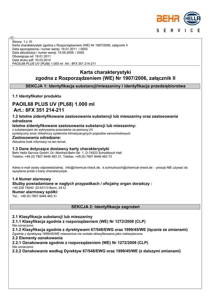 Strona 1 z 10 Karta charakterystyki zgodna z Rozporządzeniem (WE) Nr 1907/2006, załącznik II Data sporządzenia / numer wersji: 19.01.2011 / 0003 Data aktualizacji / numer wersji: 15.05.2009 / 0002 Obowiązuje od: 19.01.2011 Data druku pdf: 10.03.2014 PAOIL68 PLUS UV (PL68) 1.000 ml Art.: 8FX 351 214-211 Karta charakterystyki zgodna z Rozporządzeniem (WE) Nr 1907/2006, załącznik II SEKCJA 1: Identyfikacja substancji/mieszaniny i identyfikacja przedsiębiorstwa 1.1 Identyfikator produktu PAOIL68 PLUS UV (PL68) 1.000 ml Art.: 8FX 351 214-211 1.2 Istotne zidentyfikowane zastosowania substancji lub mieszaniny oraz zastosowania odradzane Istotne zidentyfikowane zastosowania substancji lub mieszaniny: z substancjami do wykrywania przecieków za pomocą UV syntetyczny smar chłodniczy systemów klimatyzacyjnych pojazdów samochodowych Zastosowania odradzane: Aktualnie brak informacji na ten temat. 1.3 Dane dotyczące dostawcy karty charakterystyki Behr Hella Service GmbH, Dr.-Manfred-Behr-Str. 1, D-74523 Schwäbisch Hall Telefon: +49 (0) 7907 9446 483 31, Telefax: +49 (0) 7907 9446 483 73 Adres e-mail osoby odpowiedzialnej: [email protected], [email protected] - proszę NIE używać do wysyłania próśb o karty charakterystyki. 1.4 Numer alarmowy Służby powiadamiane w nagłych przypadkach / oficjalny organ doradczy : +49 228 19240 (D-53113 Bonn, 24 h) Numer alarmowy spółki: Tel.: +49 (0) 7907 9446 483 31 SEKCJA 2: Identyfikacja zagrożeń 2.1 Klasyfikacja substancji lub mieszaniny 2.1.1 Klasyfikacja zgodnie z rozporządzeniem (WE) Nr 1272/2008 (CLP) Nie oznaczono 2.1.2 Klasyfikacja zgodnie z dyrektywami 67/548/EWG oraz 1999/45/WE (łącznie ze zmianami) Zgodnie z dyrektywą 1999/45/WE mieszanina nie została sklasyfikowana jako niebezpieczna. 2.2 Elementy oznakowania 2.2.1 Oznakowanie zgodnie z rozporządzeniem (WE) Nr 1272/2008 (CLP) Nie oznaczono 2.2.2 Oznakowanie według Dyrektyw 67/548/EWG oraz 1999/45/WE (z dalszymi zmianami) Strona 2 z 10 Karta charakterystyki zgodna z Rozporządzeniem (WE) Nr 1907/2006, załącznik II Data sporządzenia / numer wersji: 19.01.2011 / 0003 Data aktualizacji / numer wersji: 15.05.2009 / 0002 Obowiązuje od: 19.01.2011 Data druku pdf: 10.03.2014 PAOIL68 PLUS UV (PL68) 1.000 ml Art.: 8FX 351 214-211 Symbol ostrzegawczy: Odpada Określenia niebezpieczeństwa: --Określenia zagrożeń (R): Określenia dotyczące prawidłowego postępowania (S): Dodatki/składniki niebezpieczne: Zawiera tris-organo-tritiofosforan Może powodować wystąpienie reakcji alergicznej. 2.3 Inne zagrożenia Mieszanina nie zawiera substancji vPvB (PBT = very persistent, very bioaccumulative) bądź nie jest wykazana w załączniku XIII rozporządzenia (WE) 1907/2006. Mieszanina nie zawiera substancji PBT (PBT = persistent, bioaccumulative, toxic) bądź nie jest wykazana w załączniku XIII rozporządzenia (WE) 1907/2006. Możliwość uszkodzenia wód przez węglowodory. Możliwe zagrożenie wody pitnej. Możliwość wystąpienia reakcji alergicznej. SEKCJA 3: Skład/informacja o składnikach Poliolefiny 3.1 Substancja n.s. 3.2 Mieszanina -Numer rejestracji (REACH) Index EINECS, ELINCS, NLP CAS Stęż.% Klasyfikacja zgodnie z dyrektywą 67/548/EWG Klasyfikacja zgodnie z rozporządzeniem (WE) Nr 1272/2008 (CLP) ------ SEKCJA 4: Środki pierwszej pomocy 4.1 Opis środków pierwszej pomocy Drogi oddechowe Osobę usunąć z zagrożonej strefy. Osobie zapewnić dopływ świeżego powietrza, w zależności od objawów skonsultować się z lekarzem. Kontakt ze skórą Zanieczyszczone, nasączone ubranie należy niezwłocznie zdjąć, dokładnie wyprać w wodzie z mydłem, w razie podrażnienia skóry (zaczerwienienie itd.), zasięgnać porady lekarskiej. Kontakt z oczami Przez kilka minut dokładnie spłukać dużą ilością wody, jeżeli potrzeba, udać się do lekarza. Drogi pokarmowe Jamę ustną dokładnie przepłukać wodą. Nie wywoływać wymiotów, natychmiast udać się do lekarza. 4.2 Najważniejsze ostre i opóźnione objawy oraz skutki narażenia Jeśli dotyczy, objawy występujące z opóźnieniem i działanie podane są w punkcie 11. lub wśród dróg wchłaniania w punkcie 4.1. Mogą wystąpić: łzawienie oczu Przy dłuższym kontakcie: Strona 3 z 10 Karta charakterystyki zgodna z Rozporządzeniem (WE) Nr 1907/2006, załącznik II Data sporządzenia / numer wersji: 19.01.2011 / 0003 Data aktualizacji / numer wersji: 15.05.2009 / 0002 Obowiązuje od: 19.01.2011 Data druku pdf: 10.03.2014 PAOIL68 PLUS UV (PL68) 1.000 ml Art.: 8FX 351 214-211 Dermatitis (zapalenie skóry) Możliwość wystąpienia reakcji alergicznej. Połknięcie większych ilości: Wymioty Biegunka W procesie tworzenia pary: Podrażnienie śluzówki nosa i gardła W określonych przypadkach objawy zatrucia mogą pojawić się dopiero po dłuższym czasie/po kilku godzinach. 4.3 Wskazania dotyczące wszelkiej natychmiastowej pomocy lekarskiej i szczególnego postępowania z poszkodowanym Wskazówki dla lekarza: Leczenie objawowe Połknięcie: Niebezpieczeństwo aspiracji SEKCJA 5: Postępowanie w przypadku pożaru 5.1 Środki gaśnicze Odpowiednie środki gaśnicze Suchy środek gaśniczy. Piana gaśnicza odporna na działanie alkoholu Rozpylony strumień wody Niewłaściwe środki gaśnicze Pełny strumień wody 5.2 Szczególne zagrożenia związane z substancją lub mieszaniną W przypadku pożaru mogą powstać: Dym Tlenki węgla Toksyczne produkty rozkładu termicznego. 5.3 Informacje dla straży pożarnej Sprzęt ochrony dróg oddechowych niezależny od powietrza otoczenia. Według wielkości pożaru W razie potrzeby - pełna ochrona. Zagrożone pojemniki chłodzić wodą. Skażoną wodę gaśniczą zneutralizować zgodnie z przepisami administracyjnymi SEKCJA 6: Postępowanie w przypadku niezamierzonego uwolnienia do środowiska 6.1 Indywidualne środki ostrożności, wyposażenie ochronne i procedury w sytuacjach awaryjnych Dbać o wystarczającą wentylację nawiewną. Unikać kontaktu z oczami