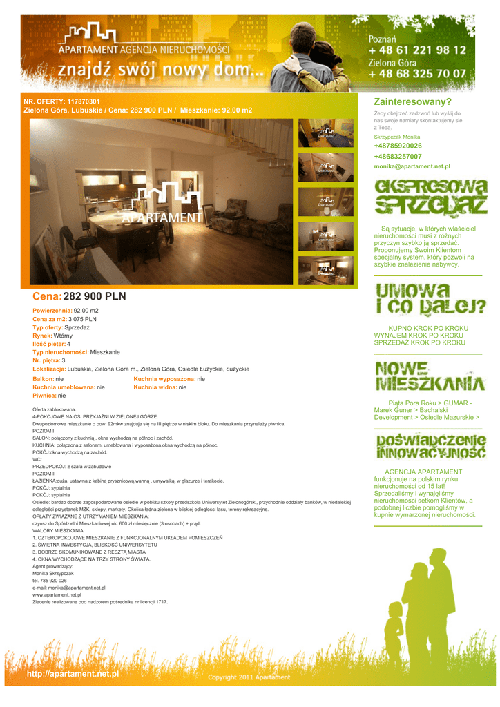 Zainteresowany? NR. OFERTY: 117870301 Zielona Góra, Lubuskie / Cena: 282 900 PLN / Mieszkanie: 92.00 m2 Żeby obejrzeć zadzwoń lub wyślij do nas swoje namiary skontaktujemy sie z Tobą. Skrzypczak Monika +48785920026 +48683257007 [email protected] Są sytuacje, w których właściciel nieruchomości musi z różnych przyczyn szybko ją sprzedać. Proponujemy Swoim Klientom specjalny system, który pozwoli na szybkie znalezienie nabywcy. Cena: 282 900 PLN Powierzchnia: 92.00 m2 Cena za m2: 3 075 PLN Typ oferty: Sprzedaż Rynek: Wtórny Ilość pieter: 4 Typ nieruchomości: Mieszkanie Nr. piętra: 3 Lokalizacja: Lubuskie, Zielona Góra m., Zielona Góra, Osiedle Łużyckie, Łużyckie Balkon: nie Kuchnia umeblowana: nie Piwnica: nie Kuchnia wyposażona: nie Kuchnia widna: nie Oferta zablokowana. 4-POKOJOWE NA OS. PRZYJAŹNI W ZIELONEJ GÓRZE. Dwupoziomowe mieszkanie o pow. 92mkw znajduje się na III piętrze w niskim bloku. Do mieszkania przynależy piwnica. POZIOM I SALON: połączony z kuchnią , okna wychodzą na północ i zachód. KUCHNIA: połączona z salonem, umeblowana i wyposażona,okna wychodzą na północ. POKÓJ:okna wychodzą na zachód. WC: PRZEDPOKÓJ: z szafa w zabudowie POZIOM II ŁAZIENKA:duża, ustawna z kabiną prysznicową,wanną , umywalką, w glazurze i terakocie. POKÓJ: sypialnia POKÓJ: sypialnia Osiedle: bardzo dobrze zagospodarowane osiedle w pobliżu szkoły przedszkola Uniwersytet Zielonogórski, przychodnie oddziały banków, w niedalekiej odległości przystanek MZK, sklepy, markety. Okolica ładna zielona w bliskiej odległości lasu, tereny rekreacyjne. OPŁATY ZWIĄZANE Z UTRZYMANIEM MIESZKANIA: czynsz do Spółdzielni Mieszkaniowej ok. 600 zł miesięcznie (3 osobach) + prąd. WALORY MIESZKANIA: 1. CZTEROPOKOJOWE MIESZKANIE Z FUNKCJONALNYM UKŁADEM POMIESZCZEŃ 2. ŚWIETNA INWESTYCJA, BLISKOŚĆ UNIWERSYTETU 3. DOBRZE SKOMUNIKOWANE Z RESZTĄ MIASTA 4. OKNA WYCHODZĄCE NA TRZY STRONY ŚWIATA. Agent prowadzący: Monika Skrzypczak tel. 785 920 026 e-mail: [email protected] www.apartament.net.pl Zlecenie realizowane pod nadzorem pośrednika nr licencji 1717. http://apartament.net.pl KUPNO KROK PO KROKU WYNAJEM KROK PO KROKU SPRZEDAŻ KROK PO KROKU Piąta Pora Roku > GUMAR Marek Guner > Bachalski Development > Osiedle Mazurskie > AGENCJA APARTAMENT funkcjonuje na polskim rynku nieruchomości od 15 lat! Sprzedaliśmy i wynajęliśmy nieruchomości setkom Klientów, a podobnej liczbie pomogliśmy w kupnie wymarzonej nieruchomości.