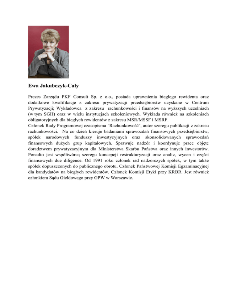 Ewa Jakubczyk-Cały Prezes Zarządu PKF Consult Sp. z o.o., posiada uprawnienia biegłego rewidenta oraz dodatkowe kwalifikacje z zakresu prywatyzacji przedsiębiorstw uzyskane w Centrum Prywatyzacji; Wykładowca z zakresu rachunkowości i finansów na wyŜszych uczelniach (w tym SGH) oraz w wielu instytucjach szkoleniowych. Wykłada równieŜ na szkoleniach obligatoryjnych dla biegłych rewidentów z zakresu MSR/MSSF i MSRF. Członek Rady Programowej czasopisma "Rachunkowość", autor szeregu publikacji z zakresu rachunkowości. Na co dzień kieruje badaniami sprawozdań finansowych przedsiębiorstw, spółek narodowych funduszy inwestycyjnych oraz skonsolidowanych sprawozdań finansowych duŜych grup kapitałowych. Sprawuje nadzór i koordynuje prace objęte doradztwem prywatyzacyjnym dla Ministerstwa Skarbu Państwa oraz innych inwestorów. Ponadto jest współtwórcą szeregu koncepcji restrukturyzacji oraz analiz, wycen i części finansowych due diligence. Od 1991 roku członek rad nadzorczych spółek, w tym takŜe spółek dopuszczonych do publicznego obrotu. Członek Państwowej Komisji Egzaminacyjnej dla kandydatów na biegłych rewidentów. Członek Komisji Etyki przy KRBR. Jest równieŜ członkiem Sądu Giełdowego przy GPW w Warszawie.