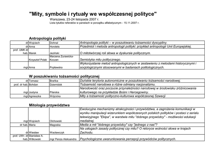 "Mity, symbole i rytuały we współczesnej polityce" Warszawa, 23-24 listopada 2007 r. Lista tytułów referatów w panelach w porządku alfabetycznym - 15.11.2007 r. Antropologia polityki dr Wojciech dr Anna prof. UMK dr hab. Marek Krzysztof Polak mgr Anna Dohnal Horolets Antropologia polityki – w poszukiwaniu toŜsamości dyscypliny. Przedmiot i metoda antropologii polityki: przykład antropologii Unii Europejskiej. Jeziński Marzena śurawickaKoczan O mitotwórczej roli słowa w dyskursie politycznym. Popławska Semiotyka mitu politycznego. Wykorzystanie metod antropologicznych w zestawieniu z metodami historycznymi i socjologicznymi stosowanymi w badaniach politologicznych. W poszukiwaniu toŜsamości politycznej dr Tomasz prof. dr hab. Bohdan mgr Justyna mgr Agnieszka Brańka Dziemidok Pilarska Wójcicka Duńskie terytoria autonomiczne w poszukiwaniu toŜsamości narodowej. ToŜsamość narodowa a róŜne odmiany nacjonalizmu. Narodowość oraz poczucie przynaleŜności narodowej w środowisku zróŜnicowania kulturowego na przykładzie Bośni i Hercegowiny. Mity a toŜsamość polityczno-kulturowa współczesnej Szwecji Mitologia przywództwa mgr Wojciech dr hab. Maria dr Wiesław prof. UWr. dr Stanisław A. hab. Witkowski Wacławczyk Ewolucyjne mechanizmy atrakcyjności i przywództwa, a zagroŜenia komunikacji w wyniku manipulacji wizerunkiem współczesnych polskich polityków i postaci z serialu telewizyjnego "Ekipa", w warstwie mitu "dobrego przywódcy" - moŜliwości edukacji medialnej. Media a mit "dobrego przywódcy" czy "jednego z nas"? Na usługach zasady politycznej czy mitu? O retoryce wolności słowa w krajach Zachodu. mgr Penza Aleksandra Psychologiczne uwarunkowania percepcji przywódców politycznych. Olchowski Magoska Polityka jako spektakl mgr Michał B. dr Piotr Bukowski Grabowiec mgr Karolina mgr Łukasz dr Barbara Lewicka Orylski Rogowska Symbole polityczne na rządowych witrynach WWW. Wstępne wyniki analizy. Znaczenie religii obywatelskiej w kształtowaniu toŜsamości politycznej. Konwersacjonalizacja i popkulturyzacja polityki w kontekście kampanii wyborczej do parlamentu w 2007 r. Stygmatyzacja jako kategoria analizy politologicznej. Przemiany form rytualnych NZSS "Solidarność" w latach 1980-2007. Mitologia IV RP mgr Joanna ChmielewskaGnojewska mgr Rafał Jaźwiński mgr Radosław mgr Łukasz Marzęcki Michoń Mit IV RP jako narzędzie manipulacji w kampanii wyborczej Prawa i Sprawiedliwości w wyborach parlamentarnych 2005 r. Historiozoficzne meandry mitu „nowego państwa” (mitu załoŜycielskiego). Próba interpretacji schematu dziejowego IV RP. IV RP i mit liberalizmu - analiza mitów polskiej polityki w świetle teorii G. Sorela, R. Girardeta, E. Cassirera i R. Barthesa O dialektyce rytualnej polityków Prawa i Sprawiedliwości. Rytualny charakter polityki mgr Karolina Mateusz mgr Rafał Maryna Churska Dąsal Kleśta-Nawrocki śesławska Rytuały polityczne w warunkach demokracji masowej. Rytuał polityczny czy „rytuał” w polityce. Mityczno-rytualny aspekt demokracji. Rola rytuałów we współczesnej polityce. Mit w rywalizacji politycznej mgr Bogusław mgr Agnieszka dr Dariusz Pronobis Połynkiewicz Wadowski Język wojny w prasie. Podział lewica-prawica, mit czy rzeczywistość? W poszukiwaniu autorytetu. Europa w przestrzeni mitu politycznego. Obrzędy polityczne prof. nadzw. dr hab. Maciej Agnieszka dr Stępińska mgr Marcin Szczurowski Marta WrześniewskaPietrzak Zaborski Odwołanie do przeszłości w obrzędowości i promocji urzędów i instytucji publicznych. Telewizyjna debata prezydencka jako rytuał. Analiza debat: L. Kaczyński – D. Tusk z 2005 r. Kreacja wizerunku 1-majowego święta w materiałach Polskiej Kroniki Filmowej. Wokół mitologii liberalnej demokracji mgr mgr mgr dr Karolina Leszek Hanna Zbigniew Starego Ślepowroński Szczerbak Widera Mitologizacja konsensusu a idea konfliktu jako podstawa myślenia o rzeczywistości społecznej. Między mitem poprawności politycznej a wolnością debaty publicznej. Trwałość i zmienność symboli politycznych w ikonografii wladcy. Unia Europejska - idea potrzebna przywódcom politycznym czy ich wyborcom? Mity i symbole w pejzaŜu po imperium mgr Siarhiei prof. dr hab Włodzimierz mgr Anna mgr Aleksandra Liubimau Marciniak Political Mythologies and Urban Space: The Imagery of ‘Plaza’ in Belarusian Intellectual Discourse. Kult Pobiedy a legitymizacja władzy w Rosji. Skibińska Zamarajewa Operacja "Następca" - praktyczne wykorzystanie symboli i mitów w polityce rosyjskiej. Fenomen alternatywnej historii i źródła jego popularności w Rosji. Między ideą, mitem i praktyką mgr Lidia Godek mgr Radosław Walczak mgr Krzysztof Michałowski Racja stanu jako polityka bezwarunkowcy roszczeń. Rzecz o symbolicznym wymiarze interesów. Nowy, lepszy polityk: Ocena wizerunku polityka rozszerzonego za pomocą społecznie akceptowanych symboli. Rola mitu Krwi i Ziemi w Państwie Platona, czyli o relacjach między ideą, mitem i praktyką na przykładzie „mitu” okrągłego stołu i IV RP. Mit jako fundament nowego początku prof. UW dr hab. Jerzy mgr Marcin mgr Agnieszka Bartkowski Gajek Kampka Mit politycznego oczyszczenia i nowego początku na przykładzie komunistycznej polityki kadrowej w latach 50-ych. North vs. South or New Jerusalem vs. New Troy. American Founding Myths. Exposé jako inscenizacja nowego początku. Motyw wroga w polityce dr hab. Iwona Łukasz Sebastian Krzysztof dr Artur Jakubowska-Branicka Tomicki Leszczyński Lipiński Znaczenie figury "wroga obiektywnego" w języku propagandy politycznej. Mit wrogów politycznych na przykładzie niebezpieczeństw związanych z łączeniem pojęcia terroryzmu i walki narodowowyzwoleńczej. Terroryzm jako wspolczesny mit i rytual polityczny Mitologizacja czy dyskuryswna reprezentacja? Okrągły Stół, Magdalenka i "gruba kreska" jako kategorie dyskursu prawicy. Polityka symboli dr Magdalena dr Ewa mgr Marta Małgor