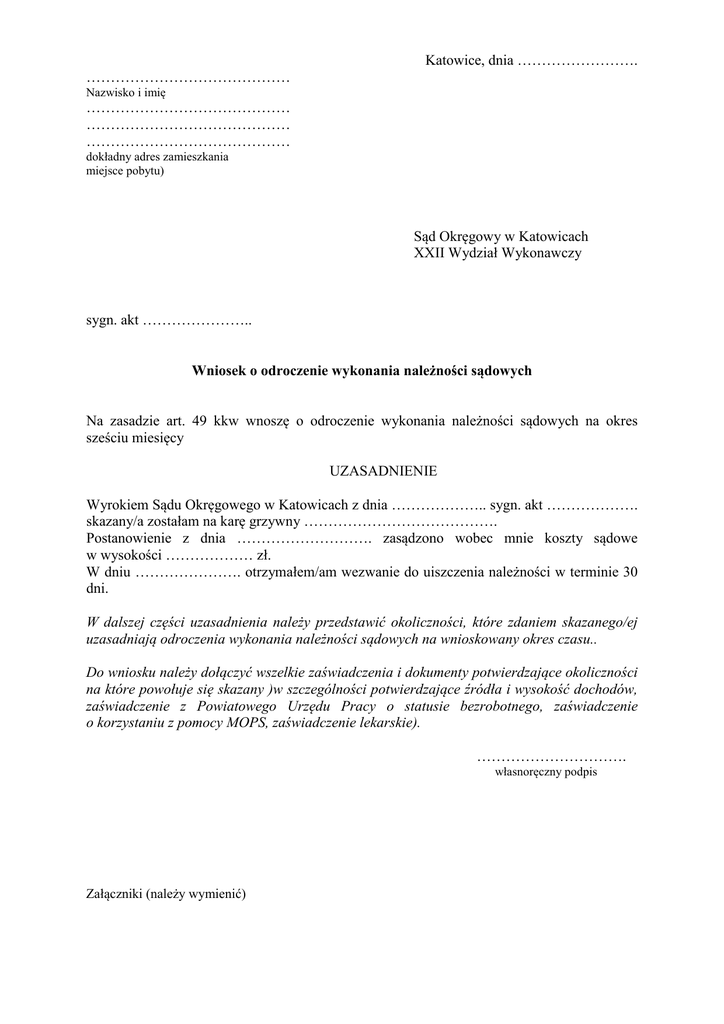 Katowice, dnia ……………………. …………………………………… Nazwisko i imię …………………………………… …………………………………… …………………………………… dokładny adres zamieszkania miejsce pobytu) Sąd Okręgowy w Katowicach XXII Wydział Wykonawczy sygn. akt ………………….. Wniosek o odroczenie wykonania należności sądowych Na zasadzie art. 49 kkw wnoszę o odroczenie wykonania należności sądowych na okres sześciu miesięcy UZASADNIENIE Wyrokiem Sądu Okręgowego w Katowicach z dnia ……………….. sygn. akt ………………. skazany/a zostałam na karę grzywny …………………………………. Postanowienie z dnia ………………………. zasądzono wobec mnie koszty sądowe w wysokości ……………… zł. W dniu …………………. otrzymałem/am wezwanie do uiszczenia należności w terminie 30 dni. W dalszej części uzasadnienia należy przedstawić okoliczności, które zdaniem skazanego/ej uzasadniają odroczenia wykonania należności sądowych na wnioskowany okres czasu.. Do wniosku należy dołączyć wszelkie zaświadczenia i dokumenty potwierdzające okoliczności na które powołuje się skazany )w szczególności potwierdzające źródła i wysokość dochodów, zaświadczenie z Powiatowego Urzędu Pracy o statusie bezrobotnego, zaświadczenie o korzystaniu z pomocy MOPS, zaświadczenie lekarskie). …………………………. własnoręczny podpis Załączniki (należy wymienić)