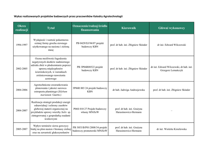 Wykaz realizowanych projektów badawczych przez pracowników Katedry Agrotechnologii Okres realizacji Tytuł Oznaczenie/rodzaj/źródło finansowania Kierownik Główni wykonawcy 1994-1997 Wydajność i wartość pokarmowa ozimej formy grochu siewnego użytkowanego na nasiona i zieloną masę PB 0429/S3/94/07 projekt badawczy KBN prof. dr hab. inż. Zbigniew Skinder dr inż. Edward Wilczewski 2002-2005 Ocena możliwości łagodzenia negatywnych skutków nadmiernego udziału zbóż w płodozmianie poprzez uprawę międzyplonów ścierniskowych, w warunkach zróżnicowanego nawożenia azotowego PB 3P06R08522 projekt badawczy KBN prof. dr hab. inż. Zbigniew Skinder dr inż. Edward Wilczewski, dr hab. inż. Grzegorz Lemańczyk 2004-2006 Agrotechniczne uwarunkowania plonowania i jakości surowca ostropestu plamistego (Silybum marianum Gaertn.) 3P06R 003 24 projekt badawczy KBN dr hab. Jadwiga Andrzejewska prof. dr hab. inż. Zbigniew Skinder 2004-2007 Realizacja strategii produkcji energii odnawialnej i ochrony zasobów glebowej materii organicznej na przykładzie uprawy wierzby Salix sp. zintegrowanej z gospodarką osadami ściekowymi P06S 010 27 Projekt badawczy własny MNiSzW prof. dr hab. inż. Grażyna Harasimowicz-Hermann – 2005-2007 Wpływ terminów siewu gorczycy PB 3053/B/P01/2008/34 projekt białej na plon nasion i biomasy zielnej badawczy promotorski MNiSzW oraz na zawartość glukozynolanów prof. dr hab. inż. Grażyna Harasimowicz-Hermann dr inż. Wioletta Kisielewska 2008-2011 Reakcja jęczmienia jarego na uprawę po międzyplonie ścierniskowym w zróżnicowanych warunkach glebowych i agrotechnicznych NN310 1441 35 projekt badawczy własny MNiSzW /NCN dr inż. Edward Wilczewski dr inż. Edward Wilczewski, dr hab. inż. Grzegorz Lemańczyk, dr hab. inż. Anna Piotrowska-Długosz 2008-2011 Azot mineralny vs azot cząsteczkowy w uprawie roślin strączkowych PB N N310 148135 prof. dr hab. inż. Janusz Prusiński dr inż. Magdalena Borowska, dr inż. Ewa Kaszkowiak, Grażyna Olszak 2008-2012 Agrotechniczne uwarunkowania rozwoju i plonowania zróżnicowanych odmian kostrzewy trzcinowej (Festuca arundinacea Schreb.) uprawianej na nasiona NN310 3061 34 projekt habilitacyjny MNiSzW /NCN dr inż. Małgorzata Szczepanek – 2010-2012 Plon i jakość surowca odmian rumianku pospolitego (Chamomille recutita L. Rauschert) w zależności od nawożenia azotem i uprawy po międzyplonach ścierniskowych NN310 103239 projekt promotorski MNiSW /NCN dr hab. inż. Jadwiga Andrzejewska – 2010-2014 Trifolium ambiguum M. Bieb. jako alternatywna roślina pastewna do uprawy w Polsce w siewie jednogatunkowym i współrzędnym z życicą wielokwiatową lub zbożami ozimymi przeznaczonymi na zielonkę NN 310104389 projekt własny MNiSW /NCN dr hab. inż. Jadwiga Andrzejewska prof. dr hab. Grażyna HarasimowiczHermann 2010-2014 BZ 28/2010/WRiB Ocena możliwości pozyskiwania POIG.01.03.01-00-132/08 biomasy na cele energetyczne z współfinansowany ze środków jednorocznych gatunków w uprawie Europejskiego Funduszu polowej w zależności od poziomu Rozwoju Regionalnego w ramach nawożenia azotem (sorgo, kukurydza, Programu Operacyjnego ślazowiec pensylwański, żyto ozime, Innowacyjna Gospodarka, 2007pszenżyto ozime, słonecznik) 2013 dr inż. Ewa Kaszkowiak – 2011-2012 Optymalizacja stosowania biostymulatorów i nawozów dolistnych w uprawie rzepaku ozimego BZ 22/2011/WRiB dr inż. Małgorzata Szczepanek – 2011-2014 Wpływ sposobu siewu rzepaku ozimego w płytkich bruzdach na jego zimotrwałość, zdrowotność plonowanie NN310 7310 40 projekt badawczy NCN prof. dr hab. inż. Grażyna Harasimowicz-Hermann dr inż. Edward Wilczewski, dr hab. inż. Grzegorz Lemańczyk 2011-2015 Przyrodnicze, produkcyjne i ekonomiczne skutki różnej intensywności uprawy łubinu w regionie kujawsko-pomorskim HOR 3.2.1/2012 - finansowany z funduszy MRiRW prof. dr hab. inż. Janusz Prusiński dr inż. Magdalena Borowska, dr inż. Ewa Kaszkowiak, Grażyna Olszak Rolnicza i ekonomiczna waloryzacja przedplonów strączkowych w uprawie HOR 3.3.2/2012 - finansowany z pszenżyta ozimego w regionie funduszy MRiRW kujawsko-pomorskim prof. dr hab. inż. Janusz Prusiński dr inż. Magdalena Borowska, dr inż. Ewa Kaszkowiak, Grażyna Olszak 2011-2015 2011-2015 Siew punktowy jako nowy trend w agrotechnice roślin strączkowych w regionie kujawsko-pomorskim HOR 3.7.2/2012 - finansowany z funduszy MRiRW prof. dr hab. inż. Janusz Prusiński dr inż. Magdalena Borowska, dr inż. Ewa Kaszkowiak, Grażyna Olszak 2011-2015 Jesienny siew grochu i łubinu białego jako kierunek do większego wykorzystania potencjału biologicznego tych roślin HOR 3.4. - finansowany z funduszy MRiRW prof. dr hab. inż. Janusz Prusiński dr inż. Magdalena Borowska, dr inż. Ewa Kaszkowiak, dr inż. S. Ignaczak, Grażyna Olszak 2013 Środowiskowe i agrotechniczne uwarunkowania wydajności i jakości plonów wybranych roślin rolniczych BS 4/2013 prof. dr hab. inż. Zbigniew Skinder dr hab. inż. Jadwiga Andrzejewska, prof. dr hab. inż. Grażyna HarasimowiczHermann, dr inż. Małgorzata Szczepanek, dr inż. Stanisław Ignaczak, dr inż. Edward Wilczewski, dr inż. Ł. Klóska, mgr inż. A. Pastuszka 2014 Wpływ dolistnego nawożenia P, K, B i Mo na kształtowanie i wielkość plonu rzepaku ozimego BZ 11/2014/WRiB dr inż. Małgorzata Szczepanek – 2015 Wpływ nawozu dolistnego Phostrade BMo na kształtowanie i wielkość plonu rzepaku ozimego BZ 43/2015/WRiB dr inż. Małgorzata Szczepanek – 2016-2020 Rozmieszczenie roślin w łanie a rozwój, plonowa-nie i jakość nasion naj-plenniejszych odmian grochu, bobiku, łubinu i soi w różnych regionach kraju Program wieloletni MRiRW na lata 2016-2020 prof. dr hab. inż. Janusz Prusiński dr inż. Magdalena Borowska, dr inż. Ewa Kaszkowiak, dr inż. S. Ignaczak, Grażyna Olszak 2016-2020 Zwiększenie wykorzystania Określenie możliwości uprawy krajowego białka paszowego dla ozimych form strączkowy