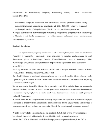 Objaśnienia do Wieloletniej Prognozy Finansowej Gminy Rawa Mazowiecka na lata 2011-2016 Wieloletnia Prognoza Finansowa jest opracowano w celu przeprowadzenia oceny sytuacji finansowej jednostki na podstawie art. 226, 227,228 ustawy o finansach publicznych z dnia 27 sierpnia 2009r ( Dz.U. Nr 157, poz.1240 z późn.zm.) WPF jest dokumentem zapewniającym wieloletnią perspektywę prognozowania finansowego w Gminie i jest ściśle zintegrowany z realizowanymi zadaniami oraz zamierzeniami inwestycyjnymi jednostki. Dochody i wydatki. Do opracowania prognozy dochodów na 2011 rok wykorzystano dane z Ministerstwa Finansów o wysokości subwencji oraz udziałach w podatku dochodowym od osób fizycznych, pisma z Łódzkiego Urzędu Wojewódzkiego oraz z Krajowego Biura Wyborczego o wysokości dotacji oraz dane na podstawie wykonania planu dochodów za rok 2010 . Dochody ustalone na 2011 rok to kwota 20.611.739 zł w tym: dochody bieżące to kwota 17.952.395 zł , dochody majątkowe 2.659.344 zł. Od roku 2012 oraz w kolejnych latach zaplanowano wzrost dochodów bieżących w związku z planowanym wzrostem stawek podatku od nieruchomości oraz zwiększeniem się liczby podmiotów podatkowych. Na główne źródła dochodów bieżących w latach 2012 do 2016 składać będą się subwencje, dotacje, dochody własne, w tym z tytułu podatków, wpływów z czynszów dzierżawnych i mieszkaniowych, wpływów z opłaty skarbowej, dochodów z podatku od osób prawnych i od osób fizycznych. W latach 2011 do 2014 zaplanowano dochody majątkowe do uzyskania ze środków unijnych z związku z realizowanymi projektami, przekształcenia prawa użytkowania wieczystego w prawo własności oraz wpływy ze sprzedaży składników majątkowych (byłe obiekty oświatowe) W 2011 roku wydatki ogółem ustalono na kwotę 25.474.418 zł, w tym wydatki bieżące bez odsetek i prowizji od kredytów kwota 17.661.418zł , wydatki majątkowe kwota 7.657.000 zł W ramach wydatków bieżących wyodrębniono kwotę 8.101.797 zł . z przeznaczeniem na wynagrodzenia wraz z pochodnymi. Do opracowania planowanych wydatków dotyczących wynagrodzeń wraz z pochodnymi w kolejnych latach tj. 2012 – 2014 zaplanowano wzrost o 2 %, uwzględniono nagrody jubileuszowe oraz przewidywane odprawy emerytalne Do wydatków związanych z funkcjonowaniem organów JST przyjęto rozdziały 75022, 75023, 75075, 75095 na kwotę 2.845.400 zł Do kalkulacji wydatków związanych z funkcjonowaniem organów JST w latach 2012 do 2014 uwzględniono wskaźnik wzrostu cen towarów i usług w wysokości 2 %. Na główne grupy wydatków bieżących składają się: wydatki na obsługę długu, świadczenia na rzecz osób fizycznych, dotacje, wydatki związane z realizacją zadań statutowych oraz wydatki na wynagrodzenia wraz z pochodnymi. Ich wzrost skalkulowano o wskaźnik 2% w stosunku do roku poprzedniego. Wydatki majątkowe zaplanowano w wysokości 7.657.000 zł z czego: - infrastruktura wodociągowa i sanitacyjn wsi 2.500.000 zł – budowa kanalizacji Konopnica-Żydomice 2.450.000 zł , dofinansowanie budowy przydomowych oczyszczalni ścieków 50.000 zł - transport i łączność 250.000 zł – przebudowa dróg gminnych we wsi Konopnica i Podlas. - gospodarka mieszkaniowa 596.000 zł – zakup działki w Boguszycach – 360.000 zł , urządzenia placów zabaw w Bogusławkach Dużych i Rossocha – 236.000 zł - administracja 20.000 zł – zakup sprzętu informatycznego - ochotnicze straże pożarne 60.000 zł – termomodernizacja strażnicy OSP w Konopnicy - oświata i wychowanie 2.901.000 zł – urządzenie placów zabaw przy szkołach podstawowych i ogrodzenie terenu SP w Konopnicy 170.000 zł , opracowanie projektu rozbudowy ZSO w Boguszycach 31.000 zł , budowa Sali gimnastycznej z łącznikiem przy ZSO w Starej Wojskiej 1.800.000 zł, rozbudowa i remont ZSO w Kurzeszynie 900.000 zł - pozostałe zadania w zakresie kultury 980.000 zł – rozbudowa budynku OSP na potrzeby społeczno kulturalne mieszkańców wsi Wilkowice - kultura fizyczna 350.000 zł – dokończenie budowy boiska ORLIK w Pukininie. W latach 2012 do 2016 wydatki majątkowe będą realizowane w miarę posiadanych środków. Przychody i rozchody budżetu. Opracowując przychody i rozchody budżetu na lata 2011 do 2016 wzięto pod uwagę zawarte umowy kredytowe, harmonogramy spłat oraz przewidziane do zaciągnięcia zobowiązania w następnych latach. W 2011 roku zaplanowano do zaciągnięcia kredyt w wysokości 4.474.412 zł. Dług gminy na koniec 2011 roku będzie wynosił 8.035.441 zł co daje 38,98 % planowanych dochodów, natomiast wskaźnik spłat wynosi 4,44% planowanych dochodów. W kolejnych latach nie planowano do zaciągnięcia kredytów. Dług gminy w latach 2012 do 2016 przedstawia się następująco: - na koniec 2012 roku kwota 6.485.441 zł, tj.: 31,53%, - na koniec 2013 roku kwota 5.85.441zł, tj.: 24,45%, - na koniec 2014 roku kwota 3.685.441 zł tj.: 16,92%, - na koniec 2015 roku kwota 1.835.441zł, tj.: 8,39%, - na koniec 2016 brak zadłużenia Wskaźnik zadłużenia jednostki w poszczególnych latach jest zgodny z ustawą o finansach publicznych i nie przekracza 60 % planowanych dochodów. Planowana łączna kwota spłaty zobowiązań do dochodów ogółem w latach 2011-2014 nie przekracza 15% w poszczególnych latach przedstawia się następująco: 2011 r. – 4,44%, 2012 r. – 8,22%, 2013 r. – 7,35 %. Od roku 2014 obowiązywać będzie wskaźnik zgodnie z art.243 ustawy o finansach publicznych z 2009 r. W związku z tym w latach 2014 do 2016 wskaźniki będą kształtować się następująco: - 2014 rok – dopuszczalny wskaźnik 6,93 %, planowany 6,89 %, - 2015 rok – dopuszczalny wskaźnik 9,79%, planowany 8,82 %, - 2016 rok – dopuszczalny wskaźnik 12,52 %, planowany 8,31 %, Przedsięwzięcia. Wykaz przedsięwzięć stanowi integralną część uchwały w sprawie wieloletniej prognozy finansowej i przedstawia się nastawia się następująco: 