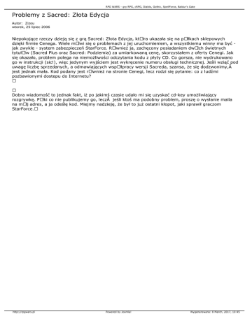 RPG WARS - gry RPG, cRPG, Diablo, Gothic, SpellForce, Baldur's Gate Problemy z Sacred: Złota Edycja Autor: Zizou wtorek, 25 lipiec 2006 Niepokojące rzeczy dzieją się z grą Sacred: Złota Edycja, ktÃłra ukazała się na pÃłłkach sklepowych dzięki firmie Cenega. Wiele mÃłwi się o problemach z jej uruchomieniem, a wszystkiemu winny ma być jak zwykle - system zabezpieczeń StarForce. RÃłwnież ja, zachęcony posiadaniem dwÃłch świetnych tytułÃłw (Sacred Plus oraz Sacred: Podziemia) za umiarkowaną cenę, skorzystałem z oferty Cenegi. Jak się okazało, problem polega na niemożliwości odczytania kodu z płyty CD. Co gorsza, nie wydrukowano go w instrukcji (sic!), więc jedynym wyjściem jest wykręcenie numeru obsługi technicznej. Jeśli wziąć pod uwagę liczbę sprzedanych, a odmawiających wspÃłłpracy wersji Sacreda, szansa, że się dodzwonimy, jest jednak mała. Kod podany jest rÃłwnież na stronie Cenegi, lecz rodzi się pytanie: co z ludźmi pozbawionymi dostepu do Internetu? Dobra wiadomość to jednak fakt, iż po jakimś czasie udało mi się uzyskać cd-key umożliwiający rozgrywkę. PÃłki co nie publikujemy go, lecz jeśli ktoś ma podobny problem, proszę o wysłanie maila na mÃłj adres, a ja odeślę kod. Miejmy nadzieję, że był to już ostatni kłopot, jaki sprawił graczom StarForce. http://rpgwars.pl Powered by Joomla! Wygenerowano: 8 March, 2017, 10:45