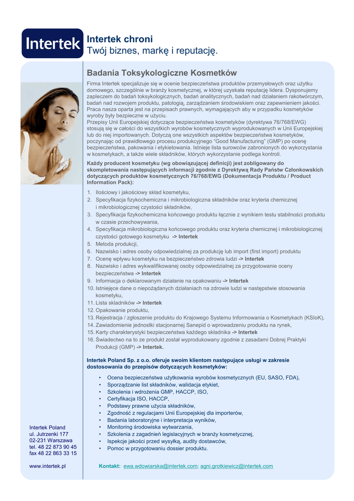 Intertek chroni Twój biznes, markę i reputację. Badania Toksykologiczne Kosmetków Firma Intertek specjalizuje się w ocenie bezpieczeństwa produktów przemysłowych oraz uŜytku domowego, szczególnie w branŜy kosmetycznej, w której uzyskała reputację lidera. Dysponujemy zapleczem do badań toksykologicznych, badań analitycznych, badań nad działaniem rakotwórczym, badań nad rozwojem produktu, patologią, zarządzaniem środowiskiem oraz zapewnieniem jakości. Praca nasza oparta jest na przepisach prawnych, wymagających aby w przypadku kosmetyków wyroby były bezpieczne w uŜyciu. Przepisy Unii Europejskiej dotyczące bezpieczeństwa kosmetyków (dyrektywa 76/768/EWG) stosują się w całości do wszystkich wyrobów kosmetycznych wyprodukowanych w Unii Europejskiej lub do niej importowanych. Dotyczą one wszystkich aspektów bezpieczeństwa kosmetyków, poczynając od prawidłowego procesu produkcyjnego “Good Manufacturing” (GMP) po ocenę bezpieczeństwa, pakowania i etykietowania. Istnieje lista surowców zabronionych do wykorzystania w kosmetykach, a takŜe wiele składników, których wykorzystanie podlega kontroli. KaŜdy producent kosmetyku (wg obowiązującej definicji) jest zobligowany do skompletowania następujących informacji zgodnie z Dyrektywą Rady Państw Członkowskich dotyczących produktów kosmetycznych 76/768/EWG (Dokumentacja Produktu / Product Information Pack): 1. Ilościowy i jakościowy skład kosmetyku, 2. Specyfikacja fizykochemiczna i mikrobiologiczna składników oraz kryteria chemicznej i mikrobiologicznej czystości składników, 3. Specyfikacja fizykochemiczna końcowego produktu łącznie z wynikiem testu stabilności produktu w czasie przechowywania, 4. Specyfikacja mikrobiologiczna końcowego produktu oraz kryteria chemicznej i mikrobiologicznej czystości gotowego kosmetyku -> Intertek 5. Metoda produkcji, 6. Nazwisko i adres osoby odpowiedzialnej za produkcję lub import (first import) produktu 7. Ocenę wpływu kosmetyku na bezpieczeństwo zdrowia ludzi -> Intertek 8. Nazwisko i adres wykwalifikowanej osoby odpowiedzialnej za przygotowanie oceny bezpieczeństwa -> Intertek 9. Informacja o deklarowanym działanie na opakowaniu -> Intertek 10. Istniejęce dane o niepoŜądanych działaniach na zdrowie ludzi w następstwie stosowania kosmetyku, 11. Lista skladników -> Intertek 12. Opakowanie produktu, 13. Rejestracja / zgłoszenie produktu do Krajowego Systemu Informowania o Kosmetykach (KSIoK), 14. Zawiadomienie jednostki stacjonarnej Sanepid o wprowadzeniu produktu na rynek, 15. Karty charakterystyki bezpieczeństwa kaŜdego składnika -> Intertek 16. Świadectwo na to ze produkt został wyprodukowany zgodnie z zasadami Dobrej Praktyki Produkcji (GMP) -> Intertek. Intertek Poland Sp. z o.o. oferuje swoim klientom następujące usługi w zakresie dostosowania do przepisów dotyczących kosmetyków: Intertek Poland ul. Jutrzenki 177 02-231 Warszawa tel. 48 22 873 90 45 fax 48 22 863 33 15 www.intertek.pl • • • • • • • • • • • Ocena bezpieczeństwa uŜytkowania wyrobów kosmetycznych (EU, SASO, FDA), Sporządzanie list składników, walidacja etykiet, Szkolenia i wdroŜenia GMP, HACCP, ISO, Certyfikacja ISO, HACCP, Podstawy prawne uŜycia składników, Zgodność z regulacjami Unii Europejskiej dla importerów, Badania laboratoryjne i interpretacja wyników, Monitoring środowiska wytwarzania, Szkolenia z zagadnień legislacyjnych w branŜy kosmetycznej, Ispekcje jakości przed wysyłką, audity dostawców, Pomoc w przygotowaniu dossier produktu. Kontakt: [email protected]; [email protected]