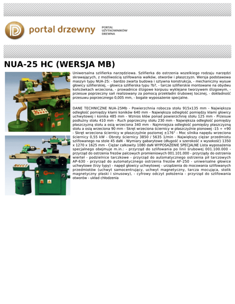 NUA-25 HC (WERSJA MB) Uniwersalna szlifierka narzędziowa. Szlifierka do ostrzenia wszelkiego rodzaju narzędzi skrawających, z możliwością szlifowania wałków, otworów i płaszczyzn. Wersja podstawowa maszyn typu NUA-25: - bardzo zwarta budowa i sztywna konstrukcja, - mechaniczny wysuw głowicy szlifierskiej, - głowica szlifierska typu ?b?, - tarcze szlifierskie montowane na obydwu końcówkach wrzeciona, - prowadnice ślizgowe korpusu wyklejane tworzywem ślizgowym, przesuw poprzeczny sań realizowany za pomocą przekładni śrubowej tocznej, - dokładność przesuwu poprzecznego 0,005 mm, - bogate wyposażenie specjalne. DANE TECHNICZNE NUA-25Mb - Powierzchnia robocza stołu 915x135 mm - Największa odległość pomiędzy kłami koników 640 mm - Największa odległość pomiędzy kłami głowicy uchwytowej i konika 485 mm - Wznios kłów ponad powierzchnię stołu 125 mm - Przesuw podłużny stołu 410 mm - Ruch poprzeczny stołu 230 mm - Największa odległość pomiędzy płaszczyzną stołu a osią wrzeciona 340 mm - Najmniejsza odległość pomiędzy płaszczyzną stołu a osią wrzeciona 90 mm - Skręt wrzeciona ściernicy w płaszczyźnie pionowej -15 ÷ +90 - Skręt wrzeciona ściernicy w płaszczyźnie poziomej ±176° - Moc silnika napędu wrzeciona ściernicy 0,55 kW - Obroty ściernicy 3850 / 5635 1/min - Największy ciężar przedmiotu szlifowanego na stole 45 daN - Wymiary gabarytowe (długość x szerokość x wysokość) 1350 x 1270 x 1625 mm - Ciężar całkowity 1080 daN WYPOSAŻENIE SPECJALNE Lista wyposażenia specjalnego obejmuje m.in.: - przyrząd do szlifowania po linii śrubowej 001.100.000 przyrząd do ostrzenia frezów palcowych promieniowych 001.101.000 - przyrządy do ostrzenia wierteł - podzielnice tarczkowe - przyrząd do automatycznego ostrzenia pił tarczowych AP-630 - przyrząd do automatycznego ostrzenia frezów AF-250 - uniwersalne głowice uchwytowe (trzy typy) - napęd głowicy uchwytowej - urządzenia do mocowania szlifowanych przedmiotów (uchwyt samocentrujący, uchwyt magnetyczny, tarcza mocująca, stolik magnetyczny płaski i sinusowy), - cyfrowy odczyt położenia - przyrząd do szlifowania otworów - układ chłodzenia