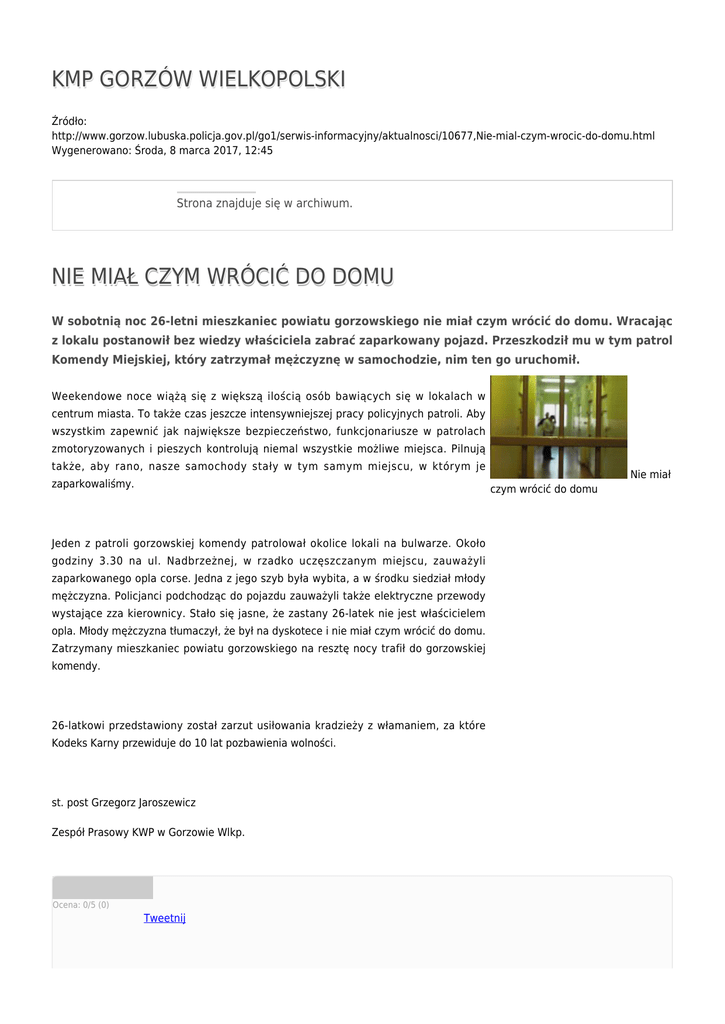 KMP GORZÓW WIELKOPOLSKI Źródło: http://www.gorzow.lubuska.policja.gov.pl/go1/serwis-informacyjny/aktualnosci/10677,Nie-mial-czym-wrocic-do-domu.html Wygenerowano: Środa, 8 marca 2017, 12:45 Strona znajduje się w archiwum. NIE MIAŁ CZYM WRÓCIĆ DO DOMU W sobotnią noc 26-letni mieszkaniec powiatu gorzowskiego nie miał czym wrócić do domu. Wracając z lokalu postanowił bez wiedzy właściciela zabrać zaparkowany pojazd. Przeszkodził mu w tym patrol Komendy Miejskiej, który zatrzymał mężczyznę w samochodzie, nim ten go uruchomił. Weekendowe noce wiążą się z większą ilością osób bawiących się w lokalach w centrum miasta. To także czas jeszcze intensywniejszej pracy policyjnych patroli. Aby wszystkim zapewnić jak największe bezpieczeństwo, funkcjonariusze w patrolach zmotoryzowanych i pieszych kontrolują niemal wszystkie możliwe miejsca. Pilnują także, aby rano, nasze samochody stały w tym samym miejscu, w którym je zaparkowaliśmy. Nie miał czym wrócić do domu Jeden z patroli gorzowskiej komendy patrolował okolice lokali na bulwarze. Około godziny 3.30 na ul. Nadbrzeżnej, w rzadko uczęszczanym miejscu, zauważyli zaparkowanego opla corse. Jedna z jego szyb była wybita, a w środku siedział młody mężczyzna. Policjanci podchodząc do pojazdu zauważyli także elektryczne przewody wystające zza kierownicy. Stało się jasne, że zastany 26-latek nie jest właścicielem opla. Młody mężczyzna tłumaczył, że był na dyskotece i nie miał czym wrócić do domu. Zatrzymany mieszkaniec powiatu gorzowskiego na resztę nocy trafił do gorzowskiej komendy. 26-latkowi przedstawiony został zarzut usiłowania kradzieży z włamaniem, za które Kodeks Karny przewiduje do 10 lat pozbawienia wolności. st. post Grzegorz Jaroszewicz Zespół Prasowy KWP w Gorzowie Wlkp. Ocena: 0/5 (0) Tweetnij