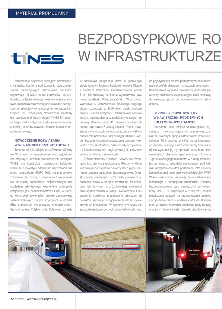 MATERIAŁ PROMOCYJNY BEZPODSYPKOWE RO W INFRASTRUKTURZE Zwiększenie prędkości pociągów, bezpieczeństwa ruchu, komfortu podróżowania oraz zmniejszenie niekorzystnych oddziaływań transportu szynowego – tj. kolei, metra i tramwajów – na środowisko, a także redukcja kosztów eksploatacyjnych, to podstawowe wymagania stawiane zarządcom infrastruktury komunikacyjnej, we wszystkich krajach Unii Europejskiej. Nowoczesne elementy dla nawierzchni dróg szynowych TINES SA, mające bezpośredni wpływ na przytoczone wymagania, spełniają potrzeby stawiane infrastrukturze transportu szynowego. NOWOCZESNE ROZWIĄZANIA W INFRASTRUKTURZE KOLEJOWEJ Tunel na lotnisko Okęcie oraz Dworzec Główny we Wrocławiu to najważniejsze oraz najciekawsze projekty z udziałem nowoczesnych rozwiązań TINES dla konstrukcji nawierzchni kolejowej. Pierwsza z inwestycji oddana do użytkowania tuż przed rozgrywkami EURO 2012 ma priorytetowe znaczenie dla rozwoju i sprawnego funkcjonowania stołecznej komunikacji. Najciekawszym pod względem inżynieryjnym elementem połączenia kolejowego jest ponadkilometrowy tunel, w którego konstrukcji nawierzchni torowej zastosowano system blokowych podpór szynowych w otulinie EBS, a także po raz pierwszy w torach zarządzanych przez Polskie Linie Kolejowe rozjazdy 52 www.kurierkolejowy.eu w podwójnym połączeniu torów. W pierwszym etapie budowy łącznicy kolejowej lotniska Okęcie z Centrum Warszawy zmodernizowano ponad 8 km linii kolejowej nr 8 oraz wybudowano dwa nowe przystanki: Warszawa Żwirki i Wigury oraz Warszawa Al. Jerozolimskie. Realizacja drugiego etapu, rozpoczęta w 2009 roku, objęła budowę prawie 2 km linii kolejowej. Ponad połowa odcinka została poprowadzona w podziemnym tunelu, do budowy którego zużyto 41 metrów sześciennych betonu oraz prawie 6 tysięcy ton stali. Projekt inwestycyjny długo oczekiwanego połączenia umożliwia pasażerom pokonanie trasy w ciągu 20 minut. Wybór bezpodsypkowego rozwiązania zapewni wieloletni czas eksploatacji, niskie koszty utrzymania, a także dostosowanie drogi szynowej dla pojazdów technicznych oraz ratunkowych. Zmodernizowany Dworzec Główny we Wrocławiu jest pierwszą realizacją w Polsce, w której konstrukcja podsypkowa na wszystkich pięciu peronach została zastąpiona bezpodsypkową. O zastosowaniu rozwiązań TINES zadecydowało m.in. położenie torów w obrębie dworca na 59 obiektach inżynieryjnych o zróżnicowanej konstrukcji oraz ograniczeniach w skrajni. Rozwiązanie EBS zapewnia sprężyste przenoszenie obciążeń od pojazdów szynowych i ograniczenie drgań wywołanych ich przejazdem. W systemie tym szyny nie są przytwierdzone do podkładów belkowych, lecz do pojedynczych bloków podporowych zabudowanych w prefabrykowanych gniazdach betonowych. Kompleksowa wymiana nawierzchni podniosła parametry techniczno-eksploatacyjne sieci kolejowej dostosowując ją do zachodnioeuropejskich standardów. BEZPODSYPKOWE SYSTEMY W NAWIERZCHNI PODZIEMNYCH KOLEI METROPOLITALNYCH Podziemna kolei miejska to niewątpliwie najszybsza i najwygodniejsza forma przemieszczania się, tworząca spójną całość węzła komunikacyjnego. To kręgosłup w silnie zurbanizowanych obszarach, w których naziemne formy komunikacji nie wystarczają, by sprostać potrzebom silnie rozwiniętych obszarów aglomeracyjnych. Otwarte 1 grudnia ubiegłego roku metro w Ałmaty uważane jest za jedno z najbardziej postępowych pod każdym względem obiektów podziemnej infrastruktury komunikacyjnej na terenie wszystkich krajów WNP. W konstrukcji drogi szynowej metra zastosowano technologię o europejskim standardzie. Dostawy bezpodsypkowego typu nawierzchni szynowych firmy TINES SA rozpoczęto w 2009 roku. Wybór rozwiązania pozwolił na przyspieszenie budowy i przybliżenie terminu oddania metra do eksploatacji. W trakcie zalewania betonowej płyty torowej w prawym tunelu trwała również zabudowa płyty MATERIAŁ PROMOCYJNY ZWIĄZANIA TINES S.A. DRÓG SZYNOWYCH torowej w lewym odcinku metra. W podziemnym tunelu ułożono blisko 16 kilometrów torów z zastosowaniem nowoczesnego systemu. Sprawdzone rozwiązanie w wielu kluczowych realizacjach, m.in.: na bielańskim odcinku Metra Warszawskiego oraz w nawierzchni Metra Kijowskiego skutecznie ogranicza drgania przenoszone przez pojazdy szynowe do otoczenia trasy, zapewnia wieloletnią, bezutrzymaniową eksploatację nawierzchni, a także bezpieczeństwo i komfort podróżowania. Skuteczność tłumienia drgań elementów nawierzchni szynowej TINES potwierdzona badaniami wykonanymi przez akredytowane laboratorium Badań Odkształceń i Drgań Budowli Instytutu Mechaniki Budowli Politechniki Krakowskiej zadecydowała o zastosowaniu rozwiązań TINES także w zabudowie II linii Metra Warszawskiego. TECHNOLOGIE TINES W TOROWISKACH TRAMWAJOWYCH Jednym z miast otwartych na nowoczesne technologie w modernizowanej infrastrukturze komunikacyjnej jest Poznań, stolica Wielkopolski. W sześciu kluczowych projektach inwestycyjnych uczestniczy TINES, dostarczając rozwiązania dla torowisk tramwajowych. W zajezdni Franowo, trasie na Franowo oraz przedłużeniu Poznańskiego Szybkiego Tramwaju zastosowano modułowy system szyny w otulinie ERS- -M. Budowa pierwszej inwestycji była planowana od 20 lat. Największa zajezdnia tramwajowa w Polsce będzie obsługiwać trzy kluczowe dla komunikacji miejskiej rejony, a także przekroczy powierzchnię wszystkich istniejących do tej pory w Poznaniu zajezdni tramwajowych, zapewniając docelowo miejsce dla 150 pojazdów. Prawie 3 tysiące metrów pojedynczego toru to łączna długość torowiska zajezdni Franowo, w którym zabudowano modułowe rozwiązanie TINES. System zapewnia ciągłe, sprężyste podparcie szyny, co znacząco wpływa na tłumienie drgań i hałasu wtórnego, generowanych przez pojazdy szynowe. Kolejna z realizacji – 2,5-kilometrowa trasa tramwajowa do zajezdni Franowo – łączy śródmieście z zajezdnią o