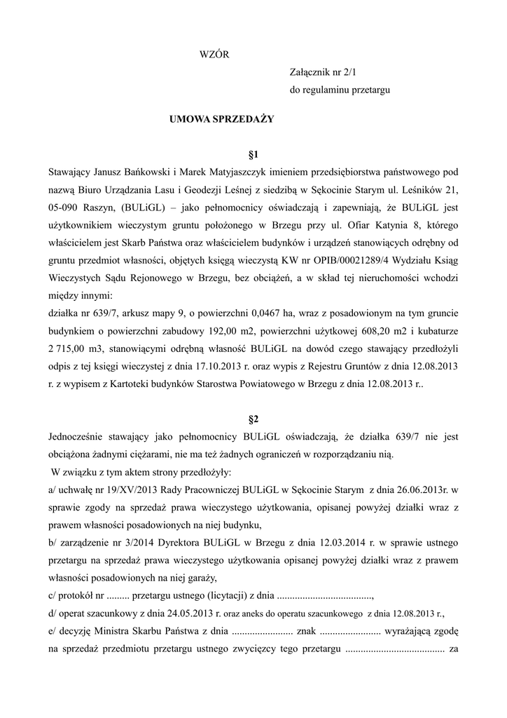 WZÓR Załącznik nr 2/1 do regulaminu przetargu UMOWA SPRZEDAŻY §1 Stawający Janusz Bańkowski i Marek Matyjaszczyk imieniem przedsiębiorstwa państwowego pod nazwą Biuro Urządzania Lasu i Geodezji Leśnej z siedzibą w Sękocinie Starym ul. Leśników 21, 05-090 Raszyn, (BULiGL) – jako pełnomocnicy oświadczają i zapewniają, że BULiGL jest użytkownikiem wieczystym gruntu położonego w Brzegu przy ul. Ofiar Katynia 8, którego właścicielem jest Skarb Państwa oraz właścicielem budynków i urządzeń stanowiących odrębny od gruntu przedmiot własności, objętych księgą wieczystą KW nr OPIB/00021289/4 Wydziału Ksiąg Wieczystych Sądu Rejonowego w Brzegu, bez obciążeń, a w skład tej nieruchomości wchodzi między innymi: działka nr 639/7, arkusz mapy 9, o powierzchni 0,0467 ha, wraz z posadowionym na tym gruncie budynkiem o powierzchni zabudowy 192,00 m2, powierzchni użytkowej 608,20 m2 i kubaturze 2 715,00 m3, stanowiącymi odrębną własność BULiGL na dowód czego stawający przedłożyli odpis z tej księgi wieczystej z dnia 17.10.2013 r. oraz wypis z Rejestru Gruntów z dnia 12.08.2013 r. z wypisem z Kartoteki budynków Starostwa Powiatowego w Brzegu z dnia 12.08.2013 r.. §2 Jednocześnie stawający jako pełnomocnicy BULiGL oświadczają, że działka 639/7 nie jest obciążona żadnymi ciężarami, nie ma też żadnych ograniczeń w rozporządzaniu nią. W związku z tym aktem strony przedłożyły: a/ uchwałę nr 19/XV/2013 Rady Pracowniczej BULiGL w Sękocinie Starym z dnia 26.06.2013r. w sprawie zgody na sprzedaż prawa wieczystego użytkowania, opisanej powyżej działki wraz z prawem własności posadowionych na niej budynku, b/ zarządzenie nr 3/2014 Dyrektora BULiGL w Brzegu z dnia 12.03.2014 r. w sprawie ustnego przetargu na sprzedaż prawa wieczystego użytkowania opisanej powyżej działki wraz z prawem własności posadowionych na niej garaży, c/ protokół nr ......... przetargu ustnego (licytacji) z dnia ....................................., d/ operat szacunkowy z dnia 24.05.2013 r. oraz aneks do operatu szacunkowego z dnia 12.08.2013 r., e/ decyzję Ministra Skarbu Państwa z dnia ........................ znak ........................ wyrażającą zgodę na sprzedaż przedmiotu przetargu ustnego zwycięzcy tego przetargu ....................................... za wylicytowaną kwotę .......................... §3 Stawający Janusz Bańkowski i Marek Matyjaszczyk imieniem przedsiębiorstwa państwowego pod nazwą Biuro Urządzania Lasu i Gospodarki Leśnej, jako pełnomocnicy, działający na podstawie wskazanych powyżej uchwały, zarządzenia i decyzji, sprzedają opisane w §1 niniejszego aktu prawo wieczystego użytkowania działki 639/7 oraz prawo własności posadowionego na tej działce budynku – za cenę ........................ małżonkom .........................., a oni oświadczają, że opisane powyżej prawa nabywają do majątku wspólnego, za środki objęte majątkiem wspólnym (panu/pani ........................., która oświadcza, że nabywa je do majątku osobistego, za środki pochodzące z majątku osobistego) §4 Wydanie przedmiotu umowy już nastąpiło i z dniem dzisiejszym przechodzą na nabywców wszelkie korzyści i ciężary. §5 Strony zgodnie oświadczają, że cena została zapłacona przed podpisaniem aktu. Koszty i obciążenia podatkowe z niniejszej umowy ponosi kupujący.