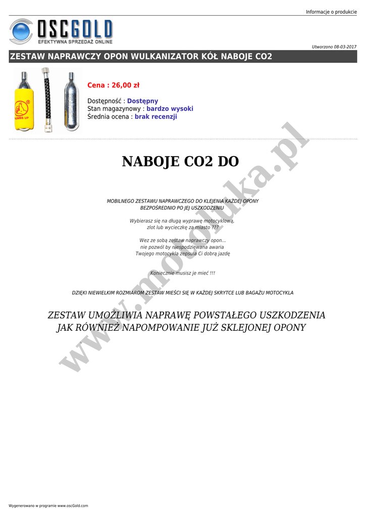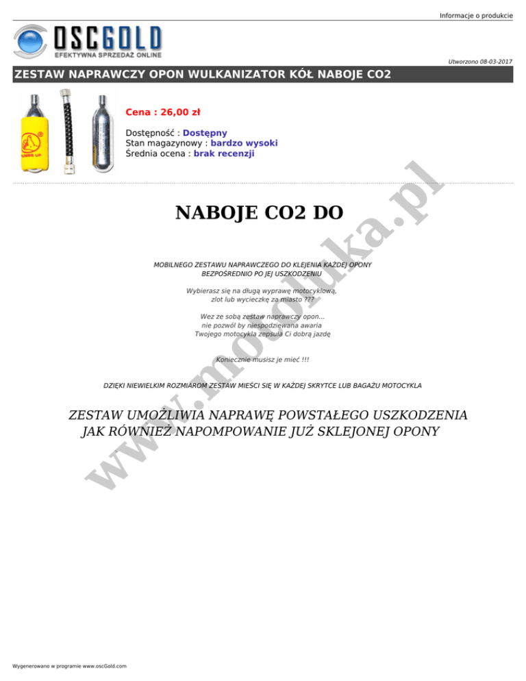Informacje o produkcie Utworzono 08-03-2017 ZESTAW NAPRAWCZY OPON WULKANIZATOR KÓŁ NABOJE CO2 Cena : 26,00 zł a. pl Dostępność : Dostępny Stan magazynowy : bardzo wysoki Średnia ocena : brak recenzji uk NABOJE CO2 DO MOBILNEGO ZESTAWU NAPRAWCZEGO DO KLEJENIA KAŻDEJ OPONY BEZPOŚREDNIO PO JEJ USZKODZENIU ol Wybierasz się na długą wyprawę motocyklową, zlot lub wycieczkę za miasto ??? ot Wez ze sobą zestaw naprawczy opon... nie pozwól by niespodziewana awaria Twojego motocykla zepsuła Ci dobrą jazdę .m Koniecznie musisz je mieć !!! DZIĘKI NIEWIELKIM ROZMIAROM ZESTAW MIEŚCI SIĘ W KAŻDEJ SKRYTCE LUB BAGAŻU MOTOCYKLA w w w ZESTAW UMOŻLIWIA NAPRAWĘ POWSTAŁEGO USZKODZENIA JAK RÓWNIEŻ NAPOMPOWANIE JUŻ SKLEJONEJ OPONY Wygenerowano w programie www.oscGold.com w w w ot .m a. pl uk ol