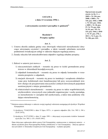 ©Kancelaria Sejmu s. 1/14 Opracowano na podstawie: tj. Dz. U. z 2005 r. Nr 236, poz. 2008, z 2006 r. Nr 144, poz. 1042, z 2008 r. Nr 223, poz. 1464, z 2009 r. Nr 18, poz. 97, Nr 79, poz. 666, Nr 92, poz. 753, Nr 215, poz. 1664, z 2010 r. Nr 47, poz. 278, z 2011 r. Nr 5, poz. 13, Nr 106, poz. 622. USTAWA z dnia 13 września 1996 r. o utrzymaniu czystości i porządku w gminach1) Rozdział 1 Przepisy ogólne Art. 1. 1. Ustawa określa zadania gminy oraz obowiązki właścicieli nieruchomości dotyczące utrzymania czystości i porządku, a także warunki udzielania zezwoleń podmiotom świadczącym usługi w zakresie objętym regulacją ustawy. 2. Zasady odzysku lub unieszkodliwiania odpadów regulują odrębne przepisy. Art. 2. 1. Ilekroć w ustawie jest mowa o: 1) nieczystościach ciekłych – rozumie się przez to ścieki gromadzone przejściowo w zbiornikach bezodpływowych; 2) odpadach komunalnych – rozumie się przez to odpady komunalne w rozumieniu przepisów o odpadach; 3) stacjach zlewnych – rozumie się przez to instalacje i urządzenia zlokalizowane przy kolektorach sieci kanalizacyjnej lub przy oczyszczalniach ścieków służące do przyjmowania nieczystości ciekłych dowożonych pojazdami asenizacyjnymi z miejsc gromadzenia; 4) właścicielach nieruchomości – rozumie się przez to także współwłaścicieli, użytkowników wieczystych oraz jednostki organizacyjne i osoby posiadające nieruchomości w zarządzie lub użytkowaniu, a także inne podmioty władające nieruchomością; 1) Niniejsza ustawa dokonuje w zakresie swojej regulacji wdrożenia następujących dyrektyw Wspólnot Europejskich: 1) dyrektywy 75/442/EWG z dnia 15 lipca 1975 r. w sprawie odpadów (Dz. Urz. WE L 194 z 25.07.1975), 2) dyrektywy 91/271/EWG z dnia 21 maja 1991 r. dotyczącej oczyszczania ścieków komunalnych (Dz. Urz. WE L 135 z 30.05.1991). Dane dotyczące ogłoszenia aktów prawa Unii Europejskiej, zamieszczone w niniejszej ustawie – z dniem uzyskania przez Rzeczpospolitą Polską członkostwa w Unii Europejskiej – dotyczą ogłoszenia tych aktów w Dzienniku Urzędowym Unii Europejskiej – wydanie specjalne. 2011-07-27 ©Kancelaria Sejmu s. 2/14 5) zbiornikach bezodpływowych – rozumie się przez to instalacje i urządzenia przeznaczone do gromadzenia nieczystości ciekłych w miejscu ich powstawania. 2. Minister właściwy do spraw transportu, w porozumieniu z ministrem właściwym do spraw środowiska, określi, w drodze rozporządzenia, wymagania dla pojazdów asenizacyjnych, biorąc pod uwagę: 1) bezpieczeństwo i zdrowie osób korzystających i obsługujących pojazdy asenizacyjne; 2) wymagania ochrony środowiska i bezpieczeństwa ruchu drogowego. 3. Jeżeli nieruchomość jest zabudowana budynkami wielolokalowymi, w których ustanowiono odrębną własność lokali, obowiązki właściciela nieruchomości obciążają osoby sprawujące zarząd nieruchomością wspólną, w rozumieniu przepisów ustawy z dnia 24 czerwca 1994 r. o własności lokali (Dz. U. z 2000 r. Nr 80, poz. 903 oraz z 2004 r. Nr 141, poz. 1492), lub właścicieli lokali, jeżeli zarząd nie został wybrany. 4. Minister właściwy do spraw budownictwa, gospodarki przestrzennej i mieszkaniowej, w porozumieniu z ministrem właściwym do spraw środowiska, określi, w drodze rozporządzenia, warunki wprowadzania nieczystości ciekłych do stacji zlewnych, biorąc pod uwagę: 1) bezpieczeństwo i zdrowie osób obsługujących stacje zlewne; 2) ochronę wyposażenia technicznego stacji zlewnych; 3) wpływ mieszaniny nieczystości ciekłych na mechaniczno-biologiczne procesy oczyszczania; 4) ochronę wód przed zanieczyszczeniem. Rozdział 2 Zadania gmin Art. 3. 1. Utrzymanie czystości i porządku w gminach należy do obowiązkowych zadań własnych gminy. 2. Gminy zapewniają czystość i porządek na swoim terenie i tworzą warunki niezbędne do ich utrzymania, a w szczególności: 1) tworzą warunki do wykonywania prac związanych z utrzymaniem czystości i porządku na terenie gminy lub zapewniają wykonanie tych prac przez tworzenie odpowiednich jednostek organizacyjnych; 2) zapewniają budowę, utrzymanie i eksploatację własnych lub wspólnych z innymi gminami: a) (uchylona), b) stacji zlewnych, w przypadku gdy podłączenie wszystkich nieruchomości do sieci kanalizacyjnej jest niemożliwe lub powoduje nadmierne koszty, 2011-07-27 ©Kancelaria Sejmu s. 3/14 c) instalacji i urządzeń do zbierania, transportu i unieszkodliwiania zwłok zwierzęcych lub ich części, d) szaletów publicznych; 3) zapobiegają zanieczyszczaniu ulic, placów i terenów otwartych, w szczególności przez: zbieranie i pozbywanie się, z zastrzeżeniem art. 5 ust. 4, błota, śniegu, lodu oraz innych zanieczyszczeń uprzątniętych z chodników przez właścicieli nieruchomości oraz odpadów zgromadzonych w przeznaczonych do tego celu urządzeniach ustawionych na chodniku; 3a) utrzymują czystość i porządek na przystankach komunikacyjnych, których właścicielem lub zarządzającym jest gmina oraz które są położone na jej obszarze przy drogach publicznych bez względu na kategorię tych dróg; 4) określają wymagania wobec osób utrzymujących zwierzęta domowe w zakresie bezpieczeństwa i czystości w miejscach publicznych; 5) organizują ochronę przed bezdomnymi zwierzętami na zasadach określonych w odrębnych przepisach; 6) (uchylony); 6a) udostępniają mieszkańcom na stronie internetowej oraz w sposób zwyczajowo przyjęty informację o znajdujących się na terenie gminy zbierających zużyty sprzęt elektryczny i elektroniczny pochodzący z gospodarstw domowych, o których mowa w ustawie z dnia 29 lipca 2005 r. o zużytym sprzęcie elektrycznym i elektronicznym (Dz. U. Nr 180, poz. 1495), zawierającą: a) firmę, oznaczenie siedziby i adres albo imię, nazwisko i adres zbierającego zużyty sprzęt elektryczny i elektroniczny, b) adresy punktów zbierania zużytego sprzętu elektrycznego i elektroni