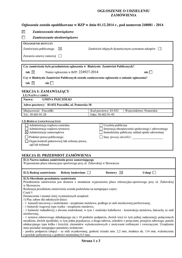 OGŁOSZENIE O UDZIELENIU ZAMÓWIENIA Ogłoszenie zostało opublikowane w BZP w dniu 01.12.2014 r., pod numerem 248081 - 2014 Zamieszczanie obowiązkowe Zamieszczanie nieobowiązkowe OGŁOSZENIE DOTYCZY Zamówienia publicznego Zamówień objętych dynamicznym systemem zakupów Zawarcia umowy ramowej Czy zamówienie było przedmiotem ogłoszenia w Biuletynie Zamówień Publicznych? tak Numer ogłoszenia w BZP: 224927-2014 nie Czy w Biuletynie Zamówień Publicznych zostało zamieszczone ogłoszenie o zmianie ogłoszenia? tak nie SEKCJA I: ZAMAWIAJĄCY I.1) NAZWA I ADRES Nazwa: GMINA PSZCZÓŁKI Adres pocztowy: 83-032 Pszczółki, ul. Pomorska 18 Miejscowość: Pszczółki Tel.: 58 683-91-28 Kod pocztowy: 83-032 Faks: 58 682-91-95 I.2) RODZAJ ZAMAWIAJĄCEGO Administracja rządowa centralna Administracja rządowa terenowa Administracja samorządowa Województwo: Pomorskie Uczelnia publiczna Instytucja ubezpieczenia społecznego i zdrowotnego Samodzielny publiczny zakład opieki zdrowotnej Podmiot prawa publicznego Organ kontroli państwowej lub ochrony prawa, sąd lub trybunał Inny (proszę określić): SEKCJA II: PRZEDMIOT ZAMÓWIENIA II.1) Nazwa nadana zamówieniu przez zamawiającego Wyposażenie placu rekreacyjno sportowego przy ul. Żuławskiej w Skowarczu II.2) Rodzaj zamówienia: Roboty budowlane Dostawy Usługi II.3) Określenie przedmiotu zamówienia Przedmiotem zamówienia jest dostawa z montażem wyposażenia placu rekreacyjno-sportowego przy ul. Żuławskiej w Skowarczu. Realizacja przedmiotu zamówienia została podzielona na następujące części: Część I Dostarczenie i montaż niżej wymienionych urządzeń: 1) Plac zabaw dla młodszych dzieci - 1 karuzeli tarczowej z siedziskami - urządzenie metalowe, podłoga ze stali nierdzewnej perforowanej, - 1 huśtawki wagowej typu ważka - urządzenie metalowe, - 1 huśtawki wahadłowej z dwoma siedziskami, w tym 1 siedzisko kubełkowe - konstrukcja metalowa, łańcuchy ze stali nierdzewnej, - 1 zestawu zabawowego składającego się z 10 punktów podparcia, dwóch wież (w tym jednej zadaszonej), połączonych mostkiem, dwóch zjeżdżalni, w tym jedna pojedyncza, a druga tubowa, schodów z poręczami, przejścia tubowego, panelu edukacyjnego typu kółko i krzyżyk, elementów wykończeniowych z motywami roślinnymi i zwierzęcymi. Urządzenie musi posiadać następujące parametry techniczne: - punkty podparcia (słupy) - ze stali ocynkowanej, grubość ścianki min. 2,2 mm, średnica ok. 114 mm, wykończenie z powłoki poliestrowej o grubości minimalnej 0,5 mm, Strona 1 z 3 - łączniki systemowe - z aluminium lub stali nierdzewnej, - podesty, schody, platformy- ze stali perforowanej, lub pokryte gumą antypoślizgową, - elementy do chodzenia - wykończyć tworzywem winylowym lub gumowym (powłoki antypoślizgowe), - elementy montażowe - ze stali nierdzewnej, - pochwyty, poręcze i inne elementy stalowe - ze stali ocynkowanej, wykończone poliestrem, grubość powłoki min. 0,5 mm, - elementy z tworzywa wykonane z polietylenu niskiej gęstości, odpornego na promieniowanie UV. - montaż na fundamentach betonowych - 4 ławek betonowych łukowych z siedziskami drewnianymi - wysokość ławki 45 cm, długość 157 cm, szerokość 45 cm, grubość listew 4 cm, kolor listew - ciemny mahoń, kolorystyka betonu - kamień rzeczny, - 2 ławek betonowych prostych z siedziskami drewnianymi - wysokość ławki 45 cm, szerokość całkowita 45 cm, długość ławki 200 cm, grubość listew 4 cm, kolor listew - ciemny mahoń, kolorystyka betonu - kamień rzeczny, 2) Plac zabaw dla starszych dzieci - 1 zestawu linarnego typu Piramida - średnica zestawu ok. 3m , - 1 huśtawki typu bocianie gniazdo - rama urządzenia metalowa, - 1 zestawu zabawowego składającego się z jednej wieży z zadaszeniem pełnym, podestu ze ślizgiem jednotorowym, schodów wejściowych, elementów wspinaczkowych z obręczami do przechodzenia, ścianki wspinaczkowej, drabinki górnej poziomej, elementów wykończeniowych z motywami bajkowymi. Urządzenie musi posiadać następujące parametry techniczne: - punkty podparcia (słupy) - ze stali ocynkowanej, grubość ścianki min. 2,2 mm, średnica ok. 114 mm, wykończenie z powłoki poliestrowej o grubości minimalnej 0,5 mm, - łączniki systemowe - z aluminium lub stali nierdzewnej, - podesty, schody, platformy- ze stali perforowanej, - elementy do chodzenia - wykończyć tworzywem winylowym lub gumowym (powłoki antypoślizgowe), - elementy montażowe - ze stali nierdzewnej, - pochwyty, poręcze i inne elementy stalowe - ze stali ocynkowanej, wykończone poliestrem, grubość powłoki min. 0,5 mm, - elementy z tworzywa wykonane z polietylenu niskiej gęstości, odpornego na promieniowanie UV. Część II Zakup, dostawa i montaż następujących urządzeń uzupełniających: - 4 koszy na śmieci - kosze metalowe o pojemności ok. 25 l bez daszków, mocowane na jednym słupku. Kosze zamontowane do podłoża stopą betonową, kolor kosza - brązowy, słupka - czarny, - 4 stojaków rowerowych - stojaki 4-stanowiskowe, wykonane ze stali ocynkowanej, przymocowane na trwałe do podłoża, - 4 ławek metalowo-drewnianych - ławki bez oparcia o długości ok. 170 cm, konstrukcja - odlew żeliwny malowany na kolor czarny, deski z drewna iglastego, malowane lakierobejcą na kolor ciemny mahoń, - 2 tablic informacyjnych z regulaminem placów zabaw oraz informacjami o zakazie wprowadzania psów oraz zakazie spożywania alkoholu. Część III Wykonanie bezpiecznych nawierzchni pod następującymi urządzeniami: - pod huśtawką wahadłową - powierzchnia strefy bezpieczeństwa 20 m2, - pod zestawem zabawowym dla młodszych dzieci - powierzchnia strefy bezpieczeństwa 67 m2, - pod zestawem linarnym (Piramida) - powierzchnia strefy bezpieczeństwa 20 m2, - pod huśtawką bocianie gniazdo - powierzchnia strefy bezpieczeństwa 18 m2 , - pod zestawem zabawowym dla starszych dzieci - powierzchnia strefy bezpieczeństwa 75 m2 Ł