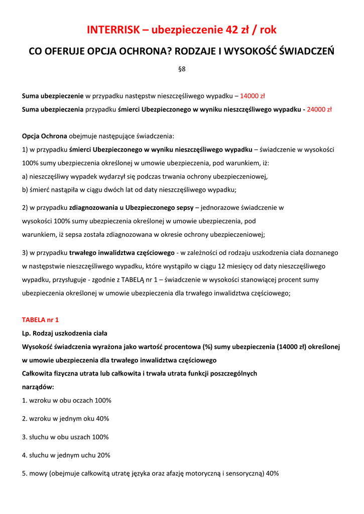 INTERRISK – ubezpieczenie 42 zł / rok CO OFERUJE OPCJA OCHRONA? RODZAJE I WYSOKOŚĆ ŚWIADCZEŃ §8 Suma ubezpieczenie w przypadku następstw nieszczęśliwego wypadku – 14000 zł Suma ubezpieczenia przypadku śmierci Ubezpieczonego w wyniku nieszczęśliwego wypadku - 24000 zł Opcja Ochrona obejmuje następujące świadczenia: 1) w przypadku śmierci Ubezpieczonego w wyniku nieszczęśliwego wypadku – świadczenie w wysokości 100% sumy ubezpieczenia określonej w umowie ubezpieczenia, pod warunkiem, iż: a) nieszczęśliwy wypadek wydarzył się podczas trwania ochrony ubezpieczeniowej, b) śmierd nastąpiła w ciągu dwóch lat od daty nieszczęśliwego wypadku; 2) w przypadku zdiagnozowania u Ubezpieczonego sepsy – jednorazowe świadczenie w wysokości 100% sumy ubezpieczenia określonej w umowie ubezpieczenia, pod warunkiem, iż sepsa została zdiagnozowana w okresie ochrony ubezpieczeniowej; 3) w przypadku trwałego inwalidztwa częściowego - w zależności od rodzaju uszkodzenia ciała doznanego w następstwie nieszczęśliwego wypadku, które wystąpiło w ciągu 12 miesięcy od daty nieszczęśliwego wypadku, przysługuje - zgodnie z TABELĄ nr 1 – świadczenie w wysokości stanowiącej procent sumy ubezpieczenia określonej w umowie ubezpieczenia dla trwałego inwalidztwa częściowego; TABELA nr 1 Lp. Rodzaj uszkodzenia ciała Wysokośd świadczenia wyrażona jako wartośd procentowa (%) sumy ubezpieczenia (14000 zł) określonej w umowie ubezpieczenia dla trwałego inwalidztwa częściowego Całkowita fizyczna utrata lub całkowita i trwała utrata funkcji poszczególnych narządów: 1. wzroku w obu oczach 100% 2. wzroku w jednym oku 40% 3. słuchu w obu uszach 100% 4. słuchu w jednym uchu 20% 5. mowy (obejmuje całkowitą utratę języka oraz afazję motoryczną i sensoryczną) 40% 6. nosa (łącznie z kośdmi nosa) 20% 7. małżowiny usznej 10% 8. utrata kooczyny dolnej na poziomie: a) stawu biodrowego, uda, stawu kolanowego, podudzia, stopy 50% b) palucha 5% c) innego palca stopy 2% 9. niedowład kooczyny dolnej 25% 10. ograniczenie ruchomości stawu biodrowego 20% 11. ograniczenie ruchomości stawu kolanowego 10% 12. utrata kooczyny górnej na poziomie: a) stawu barkowego, ramienia, stawu łokciowego, przedramienia, dłoni prawy lewy 50%, 40% b) kciuka 20%, 15% c) palca wskazującego 15%, 10% d) innego palca u dłoni 5% 13. porażenie nerwu promieniowego 30%, 25% 14. porażenie nerwu łokciowego 30%, 25% 15. ograniczenie ruchomości kooczyny górnej w stawie barkowym 40%, 30% 16. ograniczenie ruchomości kooczyny górnej w stawie łokciowym 35%, 30% 17. ograniczenie ruchomości nadgarstka 20%, 15% 18. narządów moczowo-płciowych: a) usunięcie macicy w wieku do 45 lat 35% b) usunięcie macicy w wieku powyżej 45 lat 20% c) usunięcie jajnika lub jądra 20% d) całkowita utrata prącia 40% 19. trwały i nieuleczalny paraliż wszystkich kooczyn 100% a) jeżeli w wyniku tego samego nieszczęśliwego wypadku, który wydarzył się podczas trwania ochrony ubezpieczeniowej, wystąpi więcej niż jeden rodzaj trwałego inwalidztwa częściowego wymienionego w TABELI nr 1, przysługuje – zgodnie z TABELĄ nr 1 – świadczenie będące sumą kwot za każdy rodzaj trwałego inwalidztwa częściowego, ale wysokośd świadczenia nie może przekroczyd sumy ubezpieczenia ustalonej w umowie ubezpieczenia dla trwałego inwalidztwa częściowego, b) w odniesieniu do kooczyn – przez utratę należy rozmied również amputacje całej kooczyny lub jej części, c) jeżeli Ubezpieczony jest leworęczny, w zależności od rodzaju uszkodzenia doznanego w następstwie nieszczęśliwego wypadku, które wystąpiło w ciągu 12 miesięcy od daty nieszczęśliwego wypadku: – w przypadku uszkodzenia kooczyny górnej lewej, przysługuje świadczenie w wysokości stanowiącej procent sumy ubezpieczenia jak dla kooczyny górnej prawej – zgodnie z TABELĄ nr 1, – w przypadku uszkodzenia kooczyny górnej prawej, przysługuje świadczenie w wysokości stanowiącej procent sumy ubezpieczenia jak dla kooczyny górnej lewej – zgodnie z TABELĄ nr 1, d) jeżeli w wyniku tego samego nieszczęśliwego wypadku, który wydarzył się podczas trwania ochrony ubezpieczeniowej, wystąpi złamanie jednej lub więcej kości w wyniku nieszczęśliwego wypadku, o którym mowa w pkt 5, za które InterRisk wypłacił Ubezpieczonemu świadczenie, a następnie wystąpi trwałe inwalidztwo częściowe określone w TABELI nr 1, powstałe na skutek tego samego nieszczęśliwego wypadku, wówczas świadczenie wypłacone z tytułu złamania zostanie zaliczone na poczet świadczenia przysługującego w przypadku trwałego inwalidztwa częściowego, a Ubezpieczonemu przysługuje prawo do świadczenia w wysokości różnicy pomiędzy świadczeniem przysługującym z tytułu trwałego inwalidztwa częściowego, a wypłaconym świadczeniem w przypadku złamania jednej lub więcej kości w wyniku nieszczęśliwego wypadku; 4) w przypadku zwrotu kosztów zakupu wózka inwalidzkiego na wypadek inwalidztwa spowodowanego nieszczęśliwym wypadkiem - jeżeli w wyniku nieszczęśliwego wypadku, który wydarzył się podczas trwania ochrony ubezpieczeniowej, Ubezpieczony dozna uszkodzenia ciała, powodującego trwałe inwalidztwo częściowe wymienione w TABELI nr 1, które zgodnie z zaleceniem lekarza prowadzącego leczenie będzie wymagało zakupu wózka inwalidzkiego, to InterRisk zwróci koszty zakupu wózka inwalidzkiego maksymalnie do wysokości sumy ubezpieczenia określonej w umowie ubezpieczenia; 5) w przypadku złamania jednej lub więcej kości w wyniku nieszczęśliwego wypadku, który wydarzył się podczas trwania ochrony ubezpieczeniowej, w zależności od rodzaju złamania, przysługuje – zgodnie z TABELĄ nr 2 - świadczenie w wysokości stanowiącej procent sumy ubezpieczenia określonej umowie ubezpieczenia dla złamania jednej lub więcej kości w wyniku nieszczęśliwego wypadku: TABELA nr 
