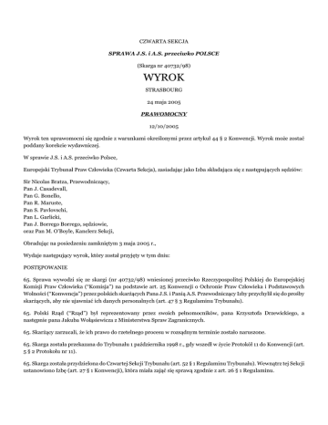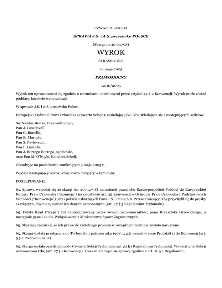 CZWARTA SEKCJA SPRAWA J.S. i A.S. przeciwko POLSCE (Skarga nr 40732/98) WYROK STRASBOURG 24 maja 2005 PRAWOMOCNY 12/10/2005 Wyrok ten uprawomocni się zgodnie z warunkami określonymi przez artykuł 44 § 2 Konwencji. Wyrok może zostać poddany korekcie wydawniczej. W sprawie J.S. i A.S. przeciwko Polsce, Europejski Trybunał Praw Człowieka (Czwarta Sekcja), zasiadając jako Izba składająca się z następujących sędziów: Sir Nicolas Bratza, Przewodniczący, Pan J. Casadevall, Pan G. Bonello, Pan R. Maruste, Pan S. Pavlovschi, Pan L. Garlicki, Pan J. Borrego Borrego, sędziowie, oraz Pan M. O’Boyle, Kanclerz Sekcji, Obradując na posiedzeniu zamkniętym 3 maja 2005 r., Wydaje następujący wyrok, który został przyjęty w tym dniu: POSTĘPOWANIE 65. Sprawa wywodzi się ze skargi (nr 40732/98) wniesionej przeciwko Rzeczypospolitej Polskiej do Europejskiej Komisji Praw Człowieka (“Komisja”) na podstawie art. 25 Konwencji o Ochronie Praw Człowieka i Podstawowych Wolności (“Konwencja”) przez polskich skarżących Pana J.S. i Panią A.S. Przewodniczący Izby przychylił się do prośby skarżących, aby nie ujawniać ich danych personalnych (art. 47 § 3 Regulaminu Trybunału). 65. Polski Rząd (“Rząd”) był reprezentowany przez swoich pełnomocników, pana Krzysztofa Drzewickiego, a następnie pana Jakuba Wołąsiewicza z Ministerstwa Spraw Zagranicznych. 65. Skarżący zarzucali, że ich prawo do rzetelnego procesu w rozsądnym terminie zostało naruszone. 65. Skarga została przekazana do Trybunału 1 października 1998 r., gdy wszedł w życie Protokół 11 do Konwencji (art. 5 § 2 Protokołu nr 11). 65. Skarga została przydzielona do Czwartej Sekcji Trybunału (art. 52 § 1 Regulaminu Trybunału). Wewnątrz tej Sekcji ustanowiono Izbę (art. 27 § 1 Konwencji), która miała zająć się sprawą zgodnie z art. 26 § 1 Regulaminu. 65. Trybunał, po przeprowadzeniu rozprawy co do meritum sprawy i dopuszczalności skargi (art. 54 § 3 Regulaminu), decyzją z dnia 5 października 2004 r., uznał skargę za dopuszczalną. 65. 1 listopada 2004 r. Trybunał zmienił skład swoich sekcji (art. 25 § 1). Niniejsza sprawa została przydzielona do nowo utworzonej Sekcji Czwartej (art. 52 § 1). FAKTY I. OKOLICZNOŚCI SPRAWY 65. Skarżący, Pan J.S. i Pani A.S. są małżeństwem i mieszkają w Stegnie. 65. Decyzją administracyjną z 29 października 1948 r. ojciec skarżącej W.U. został wywłaszczony z nieruchomości będącej jego własnością i położonej w miejscowości Czarzaste-Chodubki zgodnie z postanowieniami Dekretu o przeprowadzeniu reformy rolnej z 1944 r. W decyzji stwierdzono, że W.U. był właścicielem tej nieruchomości. 65. 21 grudnia 1948 r. decyzja została utrzymana w mocy przez Ministra Rolnictwa i Reform Rolnych, według którego ustalenia faktyczne komisji wywłaszczeniowej co do powierzchni przedmiotowej nieruchomości nie mogą być zakwestionowane ze względu na fakt, że w skład komisji wchodzili nie tylko urzędnicy administracyjni, ale także czynnik społeczny i polityczny. 65. W protokole miejscowym z dnia 7 maja 1949 r. komisja, ustanowiona zgodnie z postanowieniami Dekretu o przeprowadzeniu reformy rolnej z 1944 r., przeprowadziła inspekcję nieruchomości i stwierdziła, że grunty położone w miejscowości Czarzaste-Chodubki, będące własnością ojca skarżącej W.U., składały się z 68 ha ziemi, z czego 50 ha i 3175 m2 stanowiło użytki rolne. 65. 15 lutego 1990 r. skarżący wnieśli do Ministerstwa Rolnictwa wniosek o stwierdzenie nieważności decyzji wywłaszczeniowej na podstawie art. 156 kodeksu postępowania administracyjnego albo na podstawie znowelizowanego art. 155 kodeksu postępowania administracyjnego. 65. 3 marca 1995 r. skarżący wnieśli do Naczelnego Sądu Administracyjnego skargę na bezczynność organu administracyjnego w sprawie ich wniosku z 1990 r. 65. 24 marca 1995 r. skarżący przedłożyli NSA dodatkowe pisma procesowe, wskazując, że w Urzędzie Wojewódzkim w Ostrołęce odnaleziono pewne związane ze sprawą dokumenty wskazujące, że miejscowa komisja w 1949 r. źle obliczyła. powierzchnię przedmiotowej nieruchomości. W rzeczywistości, w świetle odnalezionych dokumentów, obejmowała ona 49,92 ha użytków rolnych. A zatem nieruchomość nie powinna być przedmiotem wywłaszczenia w ramach reformy rolnej, gdyż nie osiągała minimalnego progu 50 ha użytków rolnych. Następnie skarżący nawiązali do oficjalnego protokołu sporządzonego w 1957 r., który potwierdzał te ustalenia. 65. Wyrokiem z 9 października 1995 r. Naczelny Sąd Administracyjny zobowiązał Ministra Rolnictwa i Gospodarki Żywnościowej do wydania decyzji w przedmiocie wniosku skarżących z 1990 r. w terminie 2 miesięcy od dnia wydania wyroku. 65. W piśmie z 10 listopada 1995r. skarżący poinformowali Ministerstwo, że przedmiotowa nieruchomość obejmowała w przybliżeniu powierzchnię 44 ha, co zostało wykazane w protokole z 8 kwietnia 1948 r. oraz innym dokumencie sporządzonym przez mierniczego przysięgłego A.P. w 1948 r. 65. 17 kwietnia 1996 r. Ministerstwo Rolnictwa i Gospodarki Żywnościowej zobowiązało Urząd Wojewódzki w Ostrołęce do podjęcia dalszych czynności dowodowych w celu ustalenia stanu prawnego przedmiotowej nieruchomości w świetle przepisów prawa cywilnego, tzn. do określenia, kto był właścicielem przedmiotowej nieruchomości w chwili wywłaszczenia. 65. Skarżący sprzeciwili się temu w piśmie z 19 maja 1996r., wskazując, że kwestia, kto był właścicielem nieruchomości w rozumieniu zapisów materialnego prawa cywilnego jest całkowicie zbędna dla toczącej się w Urzędzie Wojewódzkim w Ostrołęce sprawie administracyjnej. Jakiekolwiek kwestie dotyczące oceny związku pomiędzy poprzednim właścicielem nieruchomości a skarżącymi z punktu widzenia materialnego prawa cywilnego spadkowego były zbędne dla sprawy administracyjnej, która dotyczyła tylko z