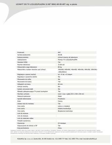 UCHWYT DO TV LCD/LED/PLAZMA 32-80" 80KG AR-08 ART reg. w pionie Producent ART Symbol producenta AR-08 Rodzaj produktu Uchwyt ścienny do telewizora Zastosowanie Montaż TV LCD/LED/PLAZMA Standard VESA Tak Rozmiar telewizora 32-80 cali Maksymalna waga telewizora 80 kg Maksymalny rozstaw otworów pod uchwyt 700x400, 600x400, 400x400, 400x300, 300x300, 300x200,- Regulacja w pionie (nachył) od -15 do +15 stopni Regulacja w poziomie (obrót) Nie Mocowanie do sufitu Nie Mocowanie do ściany Tak Odległość od ściany 80 mm Uchwyt narożny Nie System ukrywania kabli Nie Blokada zabezpieczająca TV przed zsunięciem Tak Wymiary uchwytu (szer x wys x głęb) 815 x 530 x 80 mm Materiał wykonania Metal Sposób lakierowania Proszkowo Kolor Czarny Zestaw śrub do montażu Tak Inne cechy Łatwy w instalacji Inne cechy Solidna konstrukcja Inne cechy Bezpieczna kostrukcja 200x200mm Link do artykułu Link do artykułu Link do materiału wideo Produkt wyróżniony Gwarancja 24 miesiące Dopuszczenie do obrotu w RP Tak Kraj pochodzenia Chiny Dokładamy wszelkich starań aby podane zdjęcie i opis były w pełni prawidłowe i kompletne. Niestety, nie możemy zagwarantować, że podane dane nie zawierają pomyłek i błędów, które jednak nie mogą być podstawą do ewentualnych roszczeń. W razie jakichkolwiek wątpliwości lub chęci uzyskania dodatkowych informacji prosimy o kontakt z działem handlowym. Prezentowane informacje nie stanowią oferty handlowej w rozumieniu Kodeksu Cywilnego. Multioffice Sp. z o.o. ul. Zawiła 65D, 30-390 Kraków tel.: 012 2999 777 faks: 012 2999 778 e-mail: [email protected]
