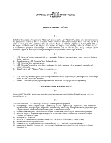 STATUT LOKALNEJ ORGANIZACJI TURYSTYCZNEJ " BESKIDY" POSTANOWIENIA OGÓLNE § l. Lokalna Organizacja Turystyczna "Beskidy", zwana dalej LOT "Beskidy", działa jako stowarzyszenie na podstawie: ustawy z dnia 7 kwietnia 1989 r. Prawo o stowarzyszeniach (tekst jednolity Dz. U. z 2001 r. Nr 79, poz. 855), ustawy z dnia 25 czerwca 1999 r. o Polskiej Organizacji Turystycznej (Dz. U. Nr 62 poz. 689 zm.2000 r., Nr 22 poz. 273, 2001 r. Nr 22 poz. 249), ustawy z dnia 24 kwietnia 2003 r. o działalności pożytku publicznego i o wolontariacie (Dz. U. Nr 96, poz. 873) i innych ustaw obowiązujących w Rzeczypospolitej Polskiej oraz na podstawie niniejszego Statutu. § 2. 1. LOT "Beskidy" działa na terenie Rzeczypospolitej Polskiej i za granicą na rzecz promocji BielskaBiałej i regionu. 2. Siedzibą władz LOT "Beskidy" jest Bielsko-Biała. 3. LOT "Beskidy" jest osobą prawną. 4. LOT "Beskidy" może być członkiem krajowych i międzynarodowych organizacji o podobnych celach działania. 5. Czas trwania LOT "Beskidy" jest nieograniczony. § 3. 1. LOT "Beskidy" może używać pieczęci i posiadać odznakę organizacyjną według wzoru ustalonego przez Walne Zebranie Członków. 2. Nazwa i symbole wykorzystywane przez LOT „Beskidy” podlegają ochronie prawnej. ZADANIA I FORMY ICH REALIZACJI § 4. Celem LOT "Beskidy" jest wspomaganie rozwoju gospodarczego Bielska-Białej i regionu poprzez rozwój turystyki. § 5. Zadania statutowe LOT "Beskidy" realizuje w szczególności poprzez: 1) współpracę z Polską Organizacją Turystyczną, Śląską Organizacją Turystyczną oraz lokalnymi organizacjami turystycznymi, organami administracji publicznej oraz podmiotami gospodarczymi i organizacjami pozarządowymi działającymi w zakresie turystyki, 2) wydawanie katalogów, informatorów i innych materiałów promujących Bielsko-Białą i region, 3) udział w targach, imprezach promocyjnych, spotkaniach oraz szkoleniach specjalistycznych krajowych i zagranicznych, 4) współpracę z mediami, 5) udział w opracowywaniu planów rozwoju i modernizacji infrastruktury turystycznej, 6) organizowanie imprez studyjnych, 7) zawieranie porozumień dotyczących współpracy przy realizacji celów statutowych, 8) pozyskiwanie środków finansowych z pomocowych funduszy europejskich i innych dostępnych źródeł finansowania. § 6. LOT "Beskidy" może prowadzić działalność gospodarczą na zasadach określonych w odrębnych przepisach. Dochód z działalności gospodarczej LOT "Beskidy" służy realizacji celów statutowych i nie może być przeznaczony do podziału między członków. CZŁONKOWIE LOT "BESKIDY" § 7. Członkowie LOT "Beskidy" dzielą się na: 1) członków zwyczajnych, 2) członków wspierających. § 8. 1. Członkami zwyczajnymi mogą zostać osoby fizyczne i osoby prawne, w szczególności jednostki samorządu terytorialnego, uczelnie, organizacje zrzeszające przedsiębiorców z dziedziny turystyki oraz przedsiębiorcy, których podstawowym przedmiotem działalności jest działalność związana z turystyką. 2. Członkowie, będący osobami prawnymi działają poprzez swojego przedstawiciela, który w ich imieniu realizuje wszelkie prawa i wykonuje obowiązki wynikające z przynależności do LOT "Beskidy". 3. Kandydat na członka zwyczajnego składa na piśmie deklarację o przystąpieniu do LOT "Beskidy". 4. Założyciele LOT "Beskidy" stają się członkami zwyczajnymi z chwilą zarejestrowania LOT "Beskidy". Przystępujący do LOT "Beskidy" po zarejestrowaniu stają się członkami z chwilą przyjęcia ich przez LOT "Beskidy" uchwałą Zarządu. § 9. Członkowie zwyczajni mają prawo: 1) do czynnego i biernego prawa wyborczego przy wyborach do statutowych organów LOT "Beskidy", 2) uczestniczenia z głosem stanowiącym w zebraniach organów LOT ”Beskidy”, gdy udział taki jest przewidziany przez Statut, 3) zgłaszania postulatów i wniosków wobec władz LOT "Beskidy", 4) uczestniczenia w organizowanych przez LOT "Beskidy" imprezach promocyjnych wymienionych w § 5 pkt 3 Statutu na warunkach określonych przez Zarząd. § 10. Członkowie zwyczajni są zobowiązani: 1) brać czynny udział w działaniach LOT „Beskidy” oraz przestrzegać postanowień Statutu, regulaminów i uchwał LOT "Beskidy", 2) wypełniać zadania wynikające z funkcji pełnionych w LOT "Beskidy", 3) prezentować cele i program LOT "Beskidy" na zewnątrz, 4) regularnie opłacać składki członkowskie. § 11. O wygaśnięciu członkostwa lub wykluczeniu członka zwyczajnego decyduje uchwałą Zarząd. 1. Wygaśnięcie członkostwa następuje w przypadku: 1) złożenia rezygnacji na piśmie z podaniem daty, 2) utraty osobowości prawnej, 3) śmierci członka. 2. Wykluczenie członka następuje w następujących przypadkach: 1) działania członka na szkodę LOT "Beskidy", 2) niestosowania się do wymogów Statutu LOT "Beskidy", 3) niewypełniania obowiązków wobec LOT "Beskidy", 4) zalegania z płaceniem składek przez okres co najmniej 6 miesięcy i nieuregulowania zaległości pomimo pisemnego upomnienia. 3. Wykluczenie staje się skuteczne z chwilą doręczenia członkowi zawiadomienia o wykluczeniu. 4. Od uchwały Zarządu o wykluczeniu członkowi przysługuje odwołanie do Walnego Zebrania Członków wniesione w terminie 30 dni od doręczenia zawiadomienia. Uchwała Walnego Zebrania Członków jest ostateczna. §12. 1. Członkami wspierającymi mogą zostać osoby prawne lub fizyczne będące przedsiębiorcami, których podstawową działalnością nie jest działalność bezpośrednio związana z turystyką, lecz popierające zadania statutowe i wyrażające wolę współpracy z LOT "Beskidy" oraz deklarujące płacenie składki członkowskiej określonej przez Walne Zebranie Członków. Deklaracja, o której mowa wyżej winna mieć formę pisemną. 2. Członkami wspierającymi mogą być w szczególności przedsiębiorstwa produkcyjne, spółki, banki oraz firmy handlowe i usługowe. §13. 1. LOT "Besk