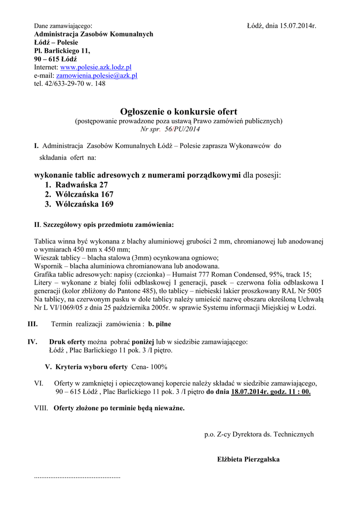 Łódź, dnia 15.07.2014r. Dane zamawiającego: Administracja Zasobów Komunalnych Łódź – Polesie Pl. Barlickiego 11, 90 – 615 Łódź Internet: www.polesie.azk.lodz.pl e-mail: [email protected] tel. 42/633-29-70 w. 148 Ogłoszenie o konkursie ofert (postępowanie prowadzone poza ustawą Prawo zamówień publicznych) Nr spr. 56/PU/2014 I. Administracja Zasobów Komunalnych Łódź – Polesie zaprasza Wykonawców do składania ofert na: wykonanie tablic adresowych z numerami porządkowymi dla posesji: 1. Radwańska 27 2. Wólczańska 167 3. Wólczańska 169 II. Szczegółowy opis przedmiotu zamówienia: Tablica winna być wykonana z blachy aluminiowej grubości 2 mm, chromianowej lub anodowanej o wymiarach 450 mm x 450 mm; Wieszak tablicy – blacha stalowa (3mm) ocynkowana ogniowo; Wspornik – blacha aluminiowa chromianowana lub anodowana. Grafika tablic adresowych: napisy (czcionka) – Humaist 777 Roman Condensed, 95%, track 15; Litery – wykonane z białej folii odblaskowej I generacji, pasek – czerwona folia odblaskowa I generacji (kolor zbliżony do Pantone 485), tło tablicy – niebieski lakier proszkowany RAL Nr 5005 Na tablicy, na czerwonym pasku w dole tablicy należy umieścić nazwę obszaru określoną Uchwałą Nr L VI/1069/05 z dnia 25 października 2005r. w sprawie Systemu informacji Miejskiej w Łodzi. III. Termin realizacji zamówienia : b. pilne IV. Druk oferty można pobrać poniżej lub w siedzibie zamawiającego: Łódź , Plac Barlickiego 11 pok. 3 /I piętro. V. Kryteria wyboru oferty Cena- 100% VI. Oferty w zamkniętej i opieczętowanej kopercie należy składać w siedzibie zamawiającego, 90 – 615 Łódź , Plac Barlickiego 11 pok. 3 /I piętro do dnia 18.07.2014r. godz. 11 : 00. VIII. Oferty złożone po terminie będą nieważne. p.o. Z-cy Dyrektora ds. Technicznych Elżbieta Pierzgalska ................................................ pieczęć Wykonawcy Administracja Zasobów Komunalnych Łódź - Polesie Łódź, Plac Barlickiego 11 O F E R T A 1. W nawiązaniu do ogłoszonego „konkursu ofert” w sprawie: wykonania tablic adresowych z numerami porządkowymi dla posesji: 1. Radwańska 27 2. Wólczańska 167 3. Wólczańska 169 niniejszym oferuję/my realizację przedmiotu zamówienia zgodnie z poniższą ceną: Lp. Opis przedmiotu zamówienia 1 2 Tablica wykonana z blachy aluminiowej grubości 2 mm, chromianowej lub anodowanej o wymiarach 450 mm x 450 mm; Wieszak tablicy – blacha stalowa (3mm) ocynkowana ogniowo; Wspornik – blacha aluminiowa chromianowana lub anodowana. 1. ilość /szt. 3 Cena jedn/szt. netto 4 Wartość netto (poz. 3 x 4) 5 VAT 6 Wartość brutto (poz. 5 + 6) 7 3 Słownie brutto: …………………………………………………………………………… Oświadczam/y, że : 1. Cena brutto zawiera wszystkie koszty związane z realizacją zamówienia. 2. Grafika tablic adresowych będzie posiadać : napisy (czcionka) – Humaist 777 Roman Condensed, 95%, track 15; Litery – wykonane będą z białej folii odblaskowej I generacji, pasek – czerwona folia odblaskowa I generacji (kolor zbliżony do Pantone 485), tło tablicy będzie posiadać niebieski lakier proszkowany RAL Nr 5005 Na tablicy, na czerwonym pasku w dole tablicy zostanie umieszczona nazwa obszaru określona Uchwałą Nr L VI/1069/05 z dnia 25 października 2005r. w sprawie Systemu informacji Miejskiej w Łodzi 3. Oświadczam/y, że jestem płatnikiem podatku VAT Nr NIP …………………………… 4. Osobą do kontaktów z Zamawiającym odpowiedzialną za wykonanie przedmiotu zamówienia będzie: ……………………………………………… tel. kontaktowy ….……………………… fax ………………………. adres e-mail ………………………………………………. ..................... dnia ...................... ................................................................... (podpis i pieczątka osoby/osób uprawnionych do składania oświadczeń woli w imieniu Wykonawcy)