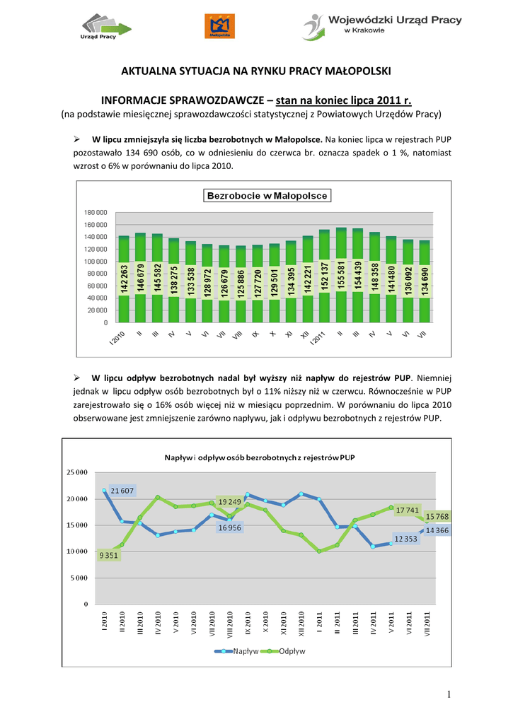 AKTUALNA SYTUACJA NA RYNKU PRACY MAŁOPOLSKI INFORMACJE SPRAWOZDAWCZE – stan na koniec lipca 2011 r. (na podstawie miesięcznej sprawozdawczości statystycznej z Powiatowych Urzędów Pracy) W lipcu zmniejszyła się liczba bezrobotnych w Małopolsce. Na koniec lipca w rejestrach PUP pozostawało 134 690 osób, co w odniesieniu do czerwca br. oznacza spadek o 1 %, natomiast wzrost o 6% w porównaniu do lipca 2010. W lipcu odpływ bezrobotnych nadal był wyższy niż napływ do rejestrów PUP. Niemniej jednak w lipcu odpływ osób bezrobotnych był o 11% niższy niż w czerwcu. Równocześnie w PUP zarejestrowało się o 16% osób więcej niż w miesiącu poprzednim. W porównaniu do lipca 2010 obserwowane jest zmniejszenie zarówno napływu, jak i odpływu bezrobotnych z rejestrów PUP. 1 W lipcu odnotowano spadek liczby ofert pracy w stosunku do czerwca br. W ciągu miesiąca do PUP zgłoszono 4 504 oferty, co w porównaniu miesięcznym oznacza spadek o 9%, natomiast rocznym spadek o 43%. Zmniejszyła się liczba bezrobotnych podejmujących pracę. W lipcu pracę podjęło 6 444 osób. To o 9% mniej osób niż w czerwcu, natomiast w ujęciu rocznym liczba podjęd pracy była mniejsza o 17% niż w lipcu 2010. 2 W miesiącach letnich następuje cykliczny wzrost liczby rejestrujących się bezrobotnych absolwentów. W lipcu napływ absolwentów był wyższy o 21 % w stosunku do czerwca, przy czym blisko 40% rejestrujących się stanowili absolwenci uczeni wyższych. Warto podkreślid, że liczba absolwentów rejestrujących się w PUP jest niższa niż to miało miejsce w roku 2010. Miesiące letnie cechują się również najniższym w skali roku poziomem podjęd pracy przez absolwentów. W lipcu pracę podjęło 438 bezrobotnych absolwentów, w tym 46% stanowiły osoby z wykształceniem wyższym. Tym samym pracę podjęło o 24 % mniej absolwentów niż w czerwcu. Równocześnie poziom podjęd pracy przez absolwentów jest wyższy niż w analogicznym okresie roku 2010. 3 W lipcu wyraźnie zmniejszyła się liczba zgłaszanych zapowiedzi zwolnieo z przyczyn zakładów pracy, w odniesieniu do minionego miesiąca, jak i w porównaniu rocznym. Plany zwolnied zgłosiło 3 pracodawców i dotyczyły 23 osób. W porównaniu do czerwca zrealizowane zwolnienia z przyczyn zakładów pracy utrzymały się na zbliżonym poziomie. Równocześnie skala zwolnieo jest o 30% niższa niż w analogicznym okresie roku ubiegłego. 4 W lipcu liczba osób rejestrujących się po powrocie za granicy wzrosła o 11% w porównaniu do minionego miesiąca. W przypadku porównania rocznego w lipcu br. wzrost wynosił 8%. (dane o ilości osób powracających z zagranicy po okresie pracy, w przypadku osób nie ubiegających się o zasiłek zbierane są wyłącznie na podstawie dobrowolnego oświadczenia) INFORMACJE SPRAWOZDAWCZE – stan na koniec czerwca 2011 r. (na podstawie danych GUS) W Małopolsce na koniec czerwcu br. stopa bezrobocia wynosiła 9,9%, co daje Małopolsce 4 miejsce w kraju. W Polsce natomiast stopa bezrobocia osiągnęła w koocu czerwca 11,8%. W porównaniu miesięcznym w Małopolsce, jak i w Polsce, nastąpił spadek stopy bezrobocia o 0,4 punktu procentowego. Sporządził: Zespół Strategii Rynku Pracy WUP Kraków Kraków 19.08.2011 r. 5