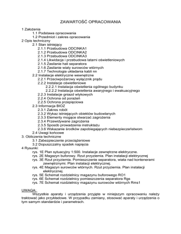 ZAWARTOŚĆ OPRACOWANIA 1 Założenia 1.1 Podstawa opracowania 1.2 Przedmiot i zakres opracowania 2 Opis techniczny 2.1 Stan istniejący 2.1.1 Przebudowa ODCINKA1 2.1.2 Przebudowa ODCINKA2 2.1.3 Przebudowa ODCINKA3 2.1.4 Likwidacja i przebudowa latarni oświetleniowych 2.1.5 Zasilanie hali separatora 2.1.6 Zasilanie wiaty surowców wtórnych 2.1.7 Technologia układania kabli nn 2.2 Instalacje elektryczne wewnętrzne 2.2.1 Przeciwpożarowy wyłącznik prądu 2.2.2 Instalacje oświetleniowe 2.2.2.1 Instalacja oświetlenia ogólnego budynku 2.2.2.2 Instalacja oświetlenia awaryjnego i ewakuacyjnego 2.2.3 Instalacje gniazd wtykowych 2.2.4 Ochrona od porażeń 2.2.5 Ochrona przepięciowa 2.3 Informacja BIOZ 2.3.1 Zakres robót 2.3.2 Wykaz istniejących obiektów budowlanych 2.3.3 Elementy mogące stwarzać zagrożenia 2.3.4 Przewidywane zagrożenia 2.3.5 Sposób prowadzenia instruktażu 2.3.6 Wskazanie środków zapobiegających niebezpieczeństwom 2.4 Uwagi końcowe 3. Obliczenia techniczne 3.1 Zabezpieczenie przeciążeniowe 3.2 Dopuszczalny spadek napięcia 4 Rysunki: rys. 1E Plan sytuacyjny 1:500. Instalacje zewnętrzne elektryczne. rys. 2E Magazyn buforowy. Rzut przyziemia. Plan instalacji elektrycznej rys. 3E Rzut przyziemia. Pomieszczenie separatora, wiata nad kontenerami zewnętrznymi. Plan instalacji elektrycznej. rys. 4E Magazyn surowców wtórnych. Rzut przyziemia. Plan instalacji elektrycznej. rys. 5E Schemat rozdzielnicy magazynu buforowego RO1 rys. 6E Schemat rozdzielnicy pomieszczenia separatora Rgs rys. 7E Schemat rozdzielnicy magazynu surowców wtórnych Rms1 UWAGA: Wszystkie aparaty i urządzenia przyjęte w niniejszym opracowaniu należy traktować jako przykładowe. W przypadku zamiany, stosować aparaty i urządzenia o tym samym standardzie i parametrach. 1. Założenia 1.1 Podstawa opracowania • aktualna inwentaryzacja geodezyjna uzbrojenia, • inwentaryzacja w terenie istniejących sieci elektrycznych, • obowiązujące przepisy i normy, 1.2 Przedmiot i zakres opracowania Przedmiotem opracowania jest są instalacje elektryczne budynków oraz budowa i przebudowa instalacji elektrycznych zewnętrznych związana z zadaniem: „Rozbudowa hali sortowni wraz z modernizacją linii sortowniczej o magazyn buforowy, wiatę – zadaszenie nad kontenerami zewnętrznymi i pomieszczenie separatora optoelektronicznego oraz budowa wolnostojącego budynku - wiaty surowców wtórnych wraz z przyłączami oraz sieciami przyobiektowymi.” dla Inwestora: MIĘDZYGMINNY KOMPLEKS UNIESZKODLIWIANIA ODPADÓW "ProNatura" Spółka z o.o., 85-893 Bydgoszcz, Prądocińska 28 W zakres niniejszego opracowania wchodzą: przebudowa i budowa kabli nn zasilających, − przebudowa i budowa oświetlenia terenu, − instalacje elektryczne wewnętrzne magazynu buforowego, wiaty nad kontenerami i wolnostojącej wiaty surowców wtórnych. − 2. OPIS TECHNICZNY 2.1 Stan istniejący Na terenie Kompleksu "ProNatura" 85-893 Bydgoszcz, ul. Prądocińska 28 zlokalizowana jest abonencka stacja transformatorowa (AST). W stacji tej znajduje się pośredni układ pomiaru energii elektrycznej. Z AST zasilana jest rozdzielnica główna RG hali sortowni kablem YKY4x240. W rozdzielnicy nn AST w polu nr4 jest zabudowany rezerwowy rozłącznik bezpiecznikowy RB2 z którego można zasilić projektowaną rozbudowę. AST posiada zapas mocy, nie ma potrzeby zwiększania mocy przyłączeniowej i zmiany umowy przyłączeniowej. Z uwagi na rozbudowę hali sortowni przewiduje się przebudowę linii kablowych kolidujących z rozbudową. 2.1.1 Przebudowa ODCINKA1 Kabel YKY4x240 ODCINEK1 stanowi fragment zasilającej linii kablowej nn relacji rozdzielnica nn AST - rozdzielnica RG hali sortowni. W zakresie ODCINEK1 „początek przebudowy - koniec przebudowy” wybudować kanalizację kablową 1xSRS160, 2xSRS110. Do rury SRS160 zaciągnąć nowy kabel YKY4x240 i domufować go do kabla istniejącego w punkcie ODCINEK1 „koniec przebudowy”. 2.1.2 Przebudowa ODCINKA2 Na ODCINEK2 składają się dwa kable, kabel zasilający nn relacji rozdzielnica nn AST - rozdzielnica RG budynku administracyjnego oraz kabel zasilający oświetlenie terenu. Pomiędzy projektowanymi studniami kablowymi SKR2.1 i SKR2.2 wybudować kanalizację kablową 2xSRS110. W zakresie ODCINEK2 „początek przebudowy - koniec przebudowy” do kanalizacji kablowej zaciągnąć nowy kabel zasilający budynek administracyjny i nowy kabel do zasilania oświetlenia 2 terenu. Nowe odcinki kabli domufować do istniejących w punkcie ODCINEK2 „początek przebudowy”. Stosować kable tego samego typu i przekroju co kable istniejące. 2.1.3 Przebudowa ODCINKA3 ODCINEK3 stanowi kabel do zasilania oświetlenia terenu. W zakresie ODCINEK3 „początek przebudowy - koniec przebudowy” istniejący kabel odkopać i przełożyć w miejsce pokazane na planie. Na całej długości przebudowywanego odcinka pod projektowaną drogą kabel ułożyć w rurze osłonowej. 2.1.4 Likwidacja i przebudowa latarni oświetleniowych W związku z budową magazynu buforowego powstała kolizja latarni oświetleniowej z projektowanym budynkiem. Istniejącą latarnię kolidującą z magazynem buforowym zdemontować i przestawić na nowe miejsce wskazane na planie. Do słupa w nowej lokalizacji wprowadzić przełożony kabel zasilający. Latarnie oświetleniowe kolidujące z powiększonym placem manewrowym i halą separatora zdemontować. W miejsce zdemontowanych latarni projektuje się oprawy montowane na elewacji hali separatora. Oprawy te zasilić z istniejący obwodów oświetlenia terenu. 2.1.5 Zasilanie hali separatora Po przebudowie na nową trasę kabla zasilającego rozdzielnicę główną RG hali sortowni, po starej trasie pozostanie kabel YKY4x240 który planuje się wykorzystać do zasilania projektowanej rozdzielnicy Rgs hali separatora. W miejscu pokazanym na planie istniejący kabel YKY4x240 w kierunku RG hali sortowni rozciąć i wprowadzić do projektowanej rozdzielnicy Rgs. 2.1.6
